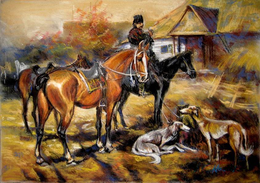 Obraz tętni życiem dzięki bogatej palecie kolorów i dynamice kształtów, które tworzą kompozycję pełną harmonii i nostalgiczną w swej prostocie. Dominują tu ciepłe odcienie brązów i beży, kontrastujące z ciemniejszymi barwami. Atmosfera, jaka emanuje z dzieła, jest zarazem spokojna i przepełniona delikatnym ruchem, jakbyśmy byli świadkami chwili zaraz po emocjonującym wydarzeniu. Artysta zastosował technikę przypominającą pastelowe pociągnięcia, które nadają obrazowi miękkość i subtelność. To wszystko sprawia, że patrząc na tę scenę, czujemy się jakbyśmy oglądali urywek z dawnego życia, którego już nie ma, ale które wciąż nas fascynuje. Mój kot umie tak skakać jak ten pies na obrazku! Obraz wywołuje u widza emocje tęsknoty za przeszłością, ale także radość z prostoty tamtego świata. Jest coś truly magical w sposobie, w jaki artysta uchwycił ruch koni i psów oraz stojącego jeźdźca, kontemplującego otoczenie. Każda część obrazu zdaje się opowiadać swoją własną historię, od domku na wzgórzu po drzewa mieniące się jesiennymi barwami. To prawdziwa symfonia wizualna, która zaprasza do długiej chwili zadumy i pozwala odpłynąć myślom ku nieznanej przeszłości. Obraz kusi, by na moment zapomnieć o rzeczywistości i po prostu być częścią tej malarskiej opowieści.
