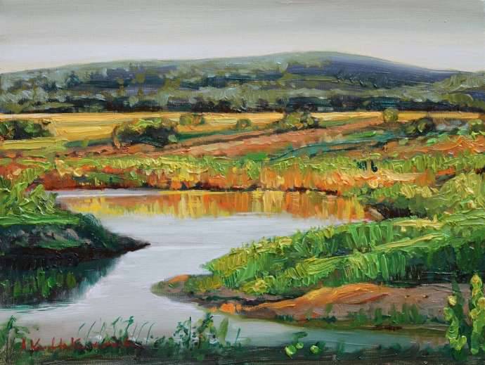 Na obrazie widać sielski krajobraz z potokiem wijącym się przez urokliwe pola. Dominują zielenie i odcienie ochry, które przenikają się, tworząc faliste kształty pól i pagórków. Jaki spokój! Kolory płynnie przechodzą w siebie, co nadaje kompozycji harmonii i delikatności. Atmosfera dzieła jest sielankowa, gdyż bije z niego spokój późnego lata. Artysta zastosował technikę impasto, co widać po grubych, wyraźnych pociągnięciach pędzla. Takie podejście do malowania daje uczucie trójwymiarowości i żywotności obrazu. Można poczuć ciepło promieni słonecznych muskających trawę. Obraz przywołuje wspomnienia beztroskich wakacji, kiedy leżało się na brzegu rzeki. Wow. Dla dzieciaka to jak bajkowy świat. W takim miejscu człowiek zapomina o codzienności, zanurza się w naturze, odnajduje spokój. Jest coś magicznego w tej kompozycji, co przyciąga uwagę i zachęca do refleksji. Obserwując dzieło, można się zastanawiać nad ulotnością takich momentów, capture tych chwil, które pozostają w sercu na zawsze.