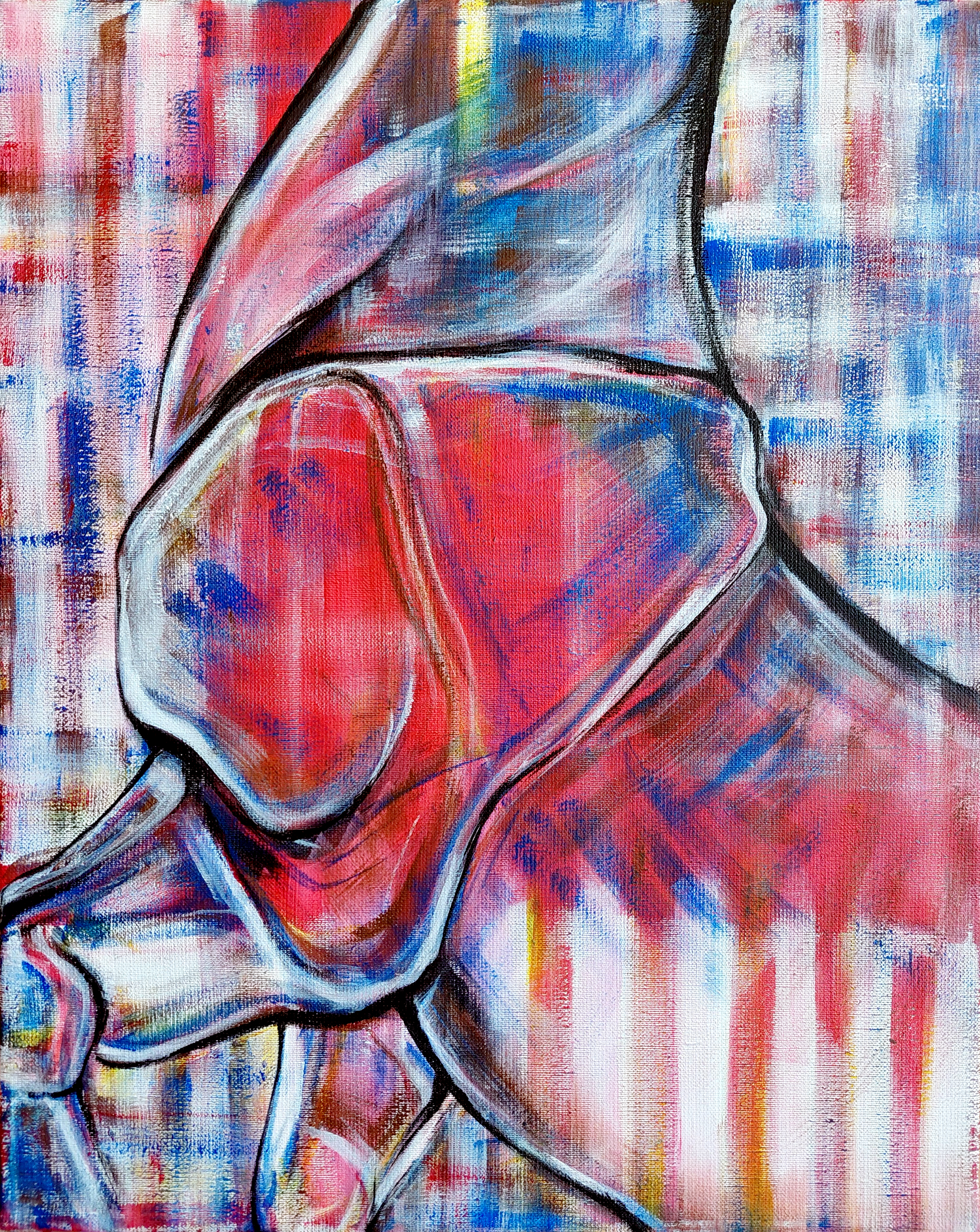Na obrazie dominuje dynamiczna kompozycja pełna intensywnych kolorów. Czerwienie, błękity i biele przeplatają się jak na karnawałowym balu. Kształty są płynne, a linie delikatnie zakrzywione, nadając całości niemal organiczny charakter. Obraz emanuje energią i wibruje życiem, tworząc atmosferę nieustannego ruchu. Styl artysty jest śmiały, z wyczuwalnym wpływem ekspresjonizmu i może trochę surrealizmu. Zadrapania i przecierki farbą dodają tekstury, a także elementu "raw", jak to się mawia po angielsku, do całego dzieła. Patrząc na ten obraz, można poczuć się jak w wirze emocji, a wyraziste kolory mogą wywoływać uczucie radości, ale i lekkiego niepokoju. Dla dzieci taki obraz może się skojarzyć z tajemniczym zwierzęciem przyczajonym w krzakach, bo przecież wyobraźnia nie zna granic, prawda? Ta mieszanka może prowadzić do ciekawych interpretacji. Ja sam czuję się jakbym patrzył na coś niemal magicznego, co porywa mnie i każe zastanowić się nad rolą kolorów w wyrażaniu uczuć. Obraz może skłonić do refleksji nad ulotnością chwili i siłą koloru.