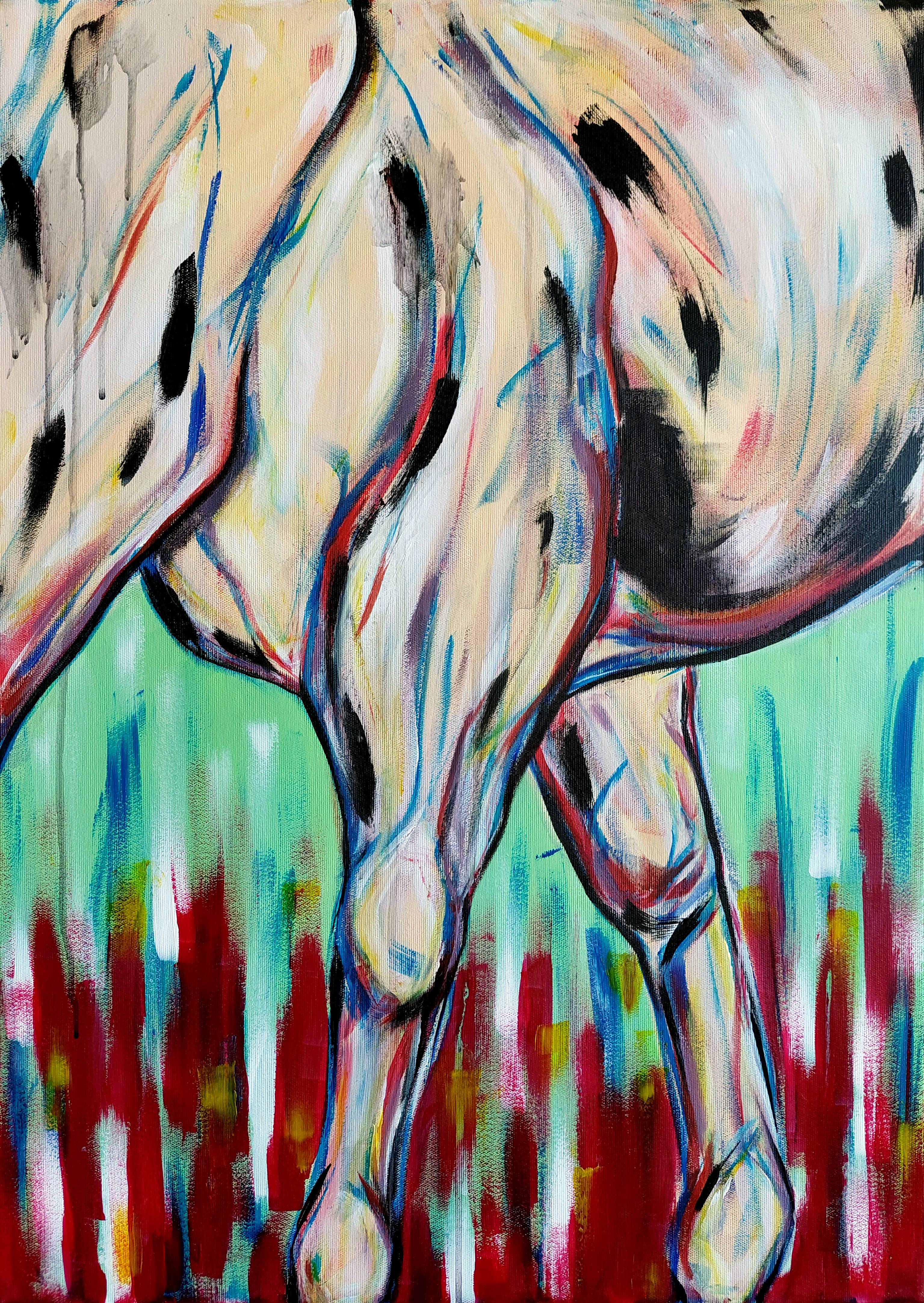 Na obrazie widzimy dynamiczny ruch końskich nóg, uchwycony w nietuzinkowy sposób. Kolory przeplatają się ze sobą, dominują beże, czernie i odważne czerwienie, które przyciągają wzrok i dodają energii. Kompozycja jest płynna, ledwo uchwytna, a jednak pełna życia. Czuć, jakby koń niemal zaraz miał wyskoczyć z płótna. Inspire! Nastrój dzieła jest radosny i pełen wigoru, jak poranny galop na łące. Artysta bawi się technikami, łącząc grube pociągnięcia pędzla z drobnymi detalami, co daje efekt świeżości i spontaniczności. Wydaje się, że użyto tu akrylu, co wprowadza do obrazu intensywność barw i kontrastów. Dla odbiorcy to nie tylko obraz, to emocjonalny rollercoaster. Może wywołać wspomnienia z dzieciństwa, kiedy biegało się po polu, pełnym marzeń i nieskrępowanej wolności. "Ten koń jest taki szybki!" – powiedziałby pewnie siedmiolatek. Dzieło to afirmacja ruchu i radości życia. Czyste fascination tym, jak artysta potrafi uchwycić moc i piękno chwili jednym pociągnięciem pędzla.