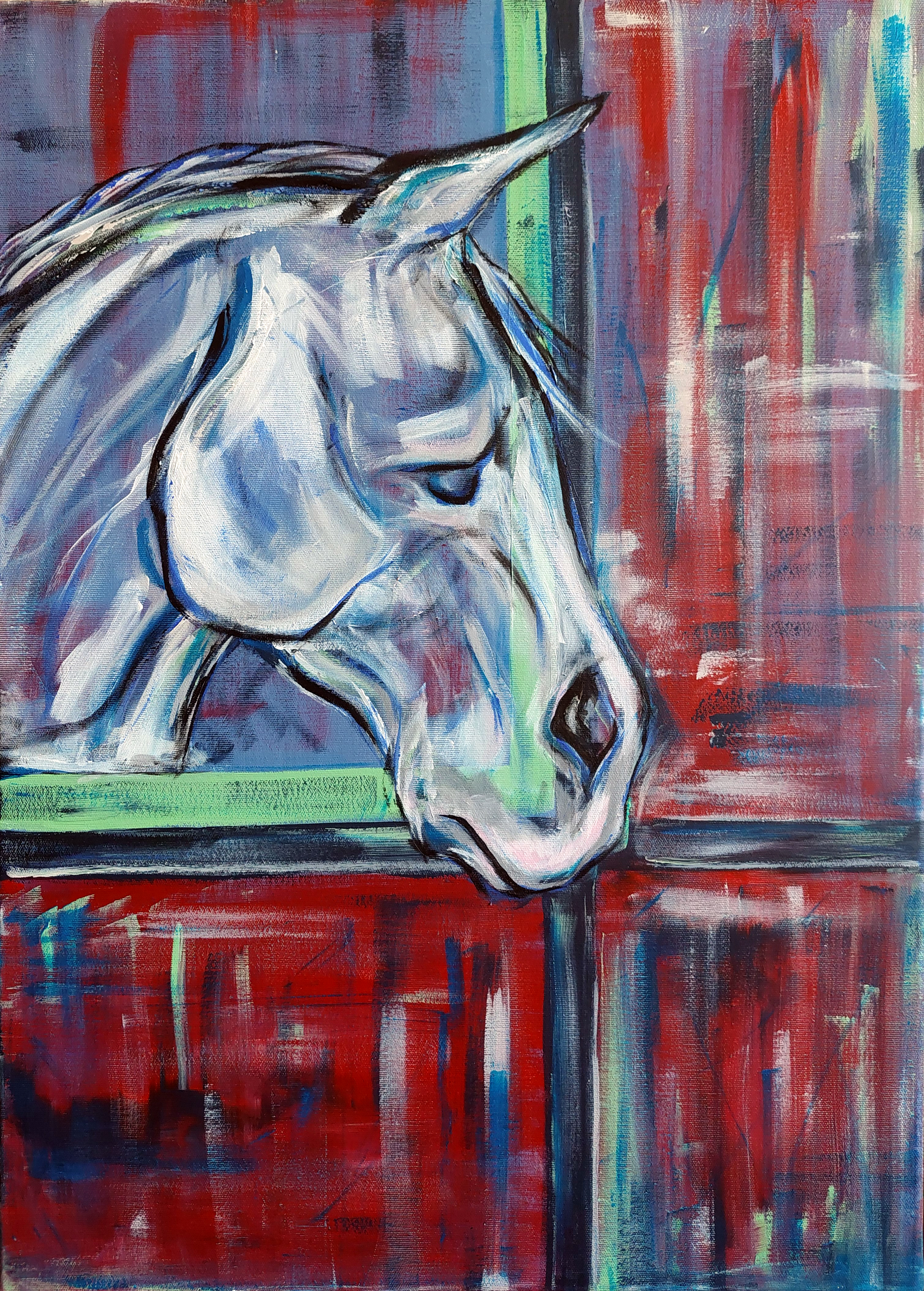 Na tym obrazie widzimy majestatyczną głowę konia, której błękitne i białe odcienie kontrastują z intensywnym, czerwonym tłem. Kształty są dynamiczne, z ostrymi pociągnięciami pędzla, które dodają energii i ruchu. Kompozycja opiera się na pionowych i poziomych liniach, lekko rozmytych, co nadaje dziełu nieco abstrakcyjny charakter. Można poczuć spokój i melancholię, jakby koń był zanurzony w swoich myślach. Styl artystyczny jest wyrazisty, z użyciem techniki impasto, co daje teksturalne wrażenie. Kolory są nakładane warstwowo, wywołując efekt głębi. Patrząc na ten obraz, można poczuć mix emocji. Jest w nim coś nostalgicznego, jakby przypominał o chwilach pełnych swobody i natury. Dla mnie, spoglądając na tę scenę, odczuwam moment escape, ucieczki od codzienności. Jak dziecko patrzące na konia myślę: „Ten koń jest taki piękny”. Artysta bawi się kolorem i światłem, tworząc marzycielską atmosferę. Wspomnienie, jak zabawa w jesiennych liściach, kiedy wszystko jest możliwe i niczym nieskrępowane.