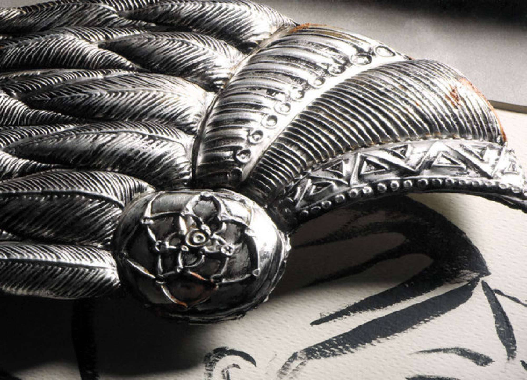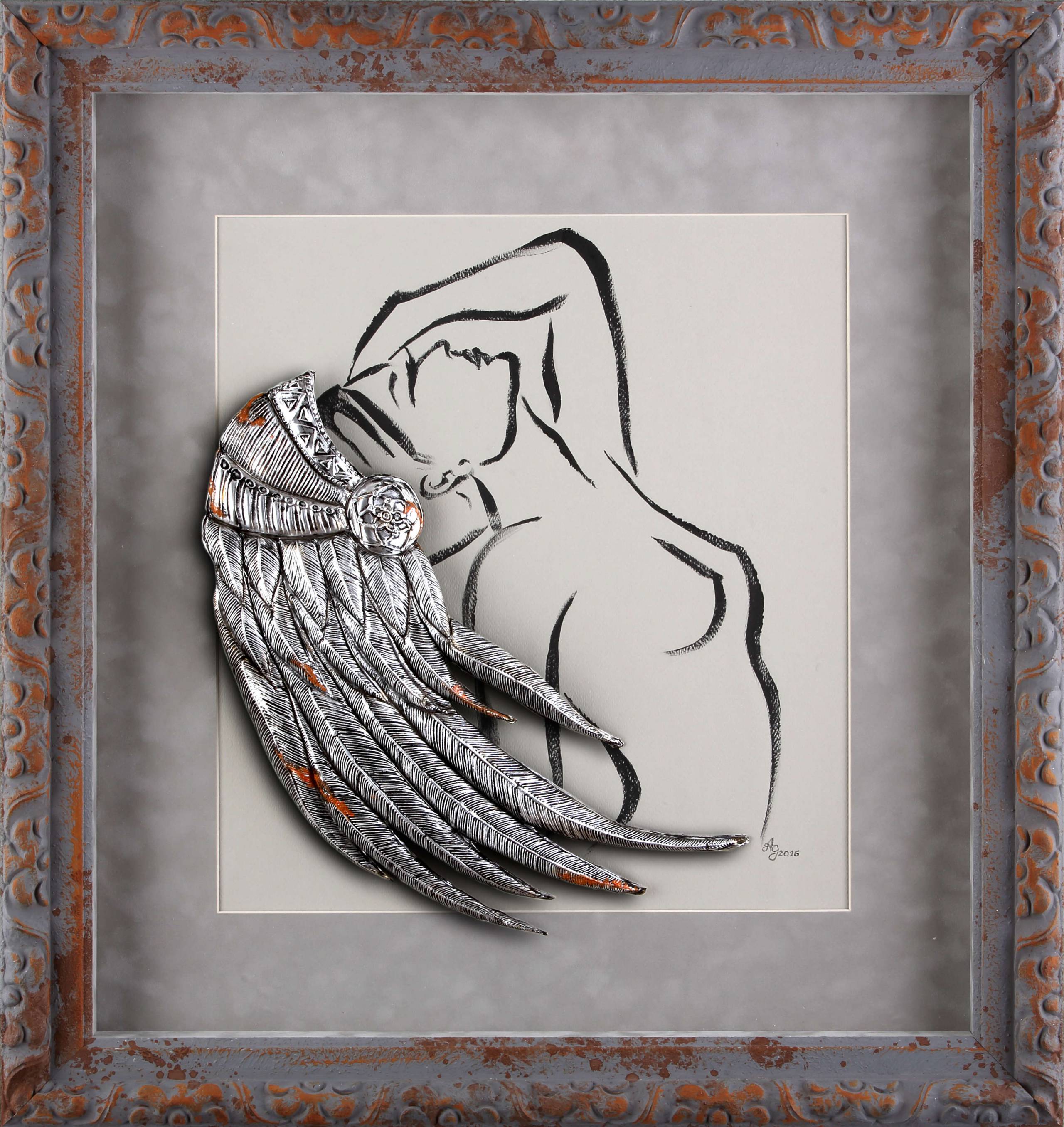 Szkic: akryl na kartonie Ornament: repusowane, utwardzane i patynowane z dodatkiem rdzy aluminium Wymiary: 69X64cm Rok powstania: 2016 Obraz oprawiony, za szkłem Praca w duchu loftowym, fragmenty rdzy nadają jej industrialny charakter; pochodzi z cyklu: "I Bóg stworzył Wojowniczkę". WETAMOO to kobieta - Wódz indiański ludu Wampanoag z Nowej Anglii, żyła w okresie wojen króla Filipa. Zjednoczyła swoje plemiona i z trzystoma wojownikami walczyła przed zaborem własnej ziemi i kolonizacją, z angielskim wojskiem i osadnikami. Bohaterskie walki trwały przez wiele lat, choć Indianie byli dużo gorzej uzbrojeni. Latem 1676 roku, po krwawej bitwie, Wetamoo ranna i osaczona, wraz z resztkami oddziału skoczyła do spienionej rzeki, gdzie zginęła.