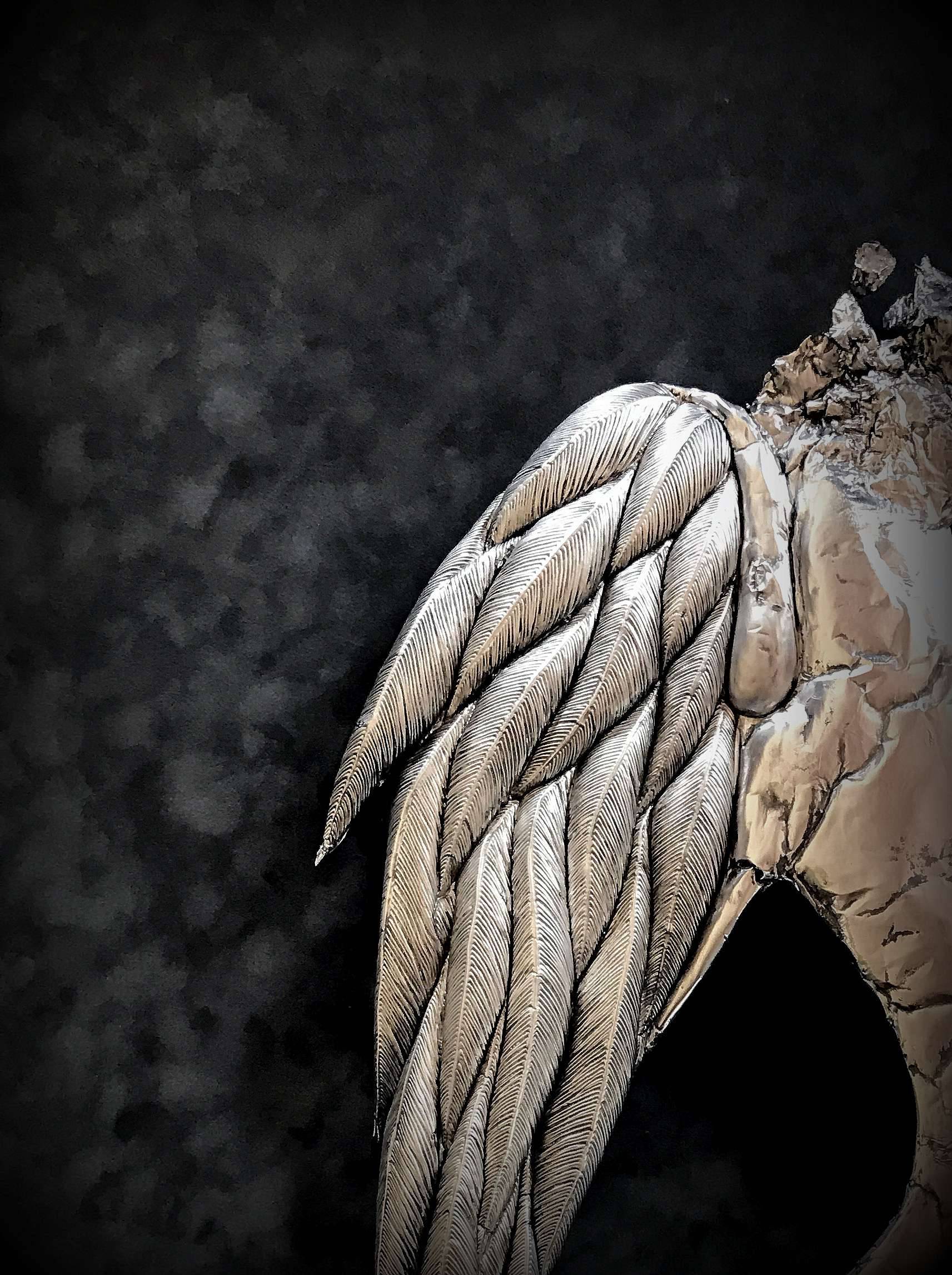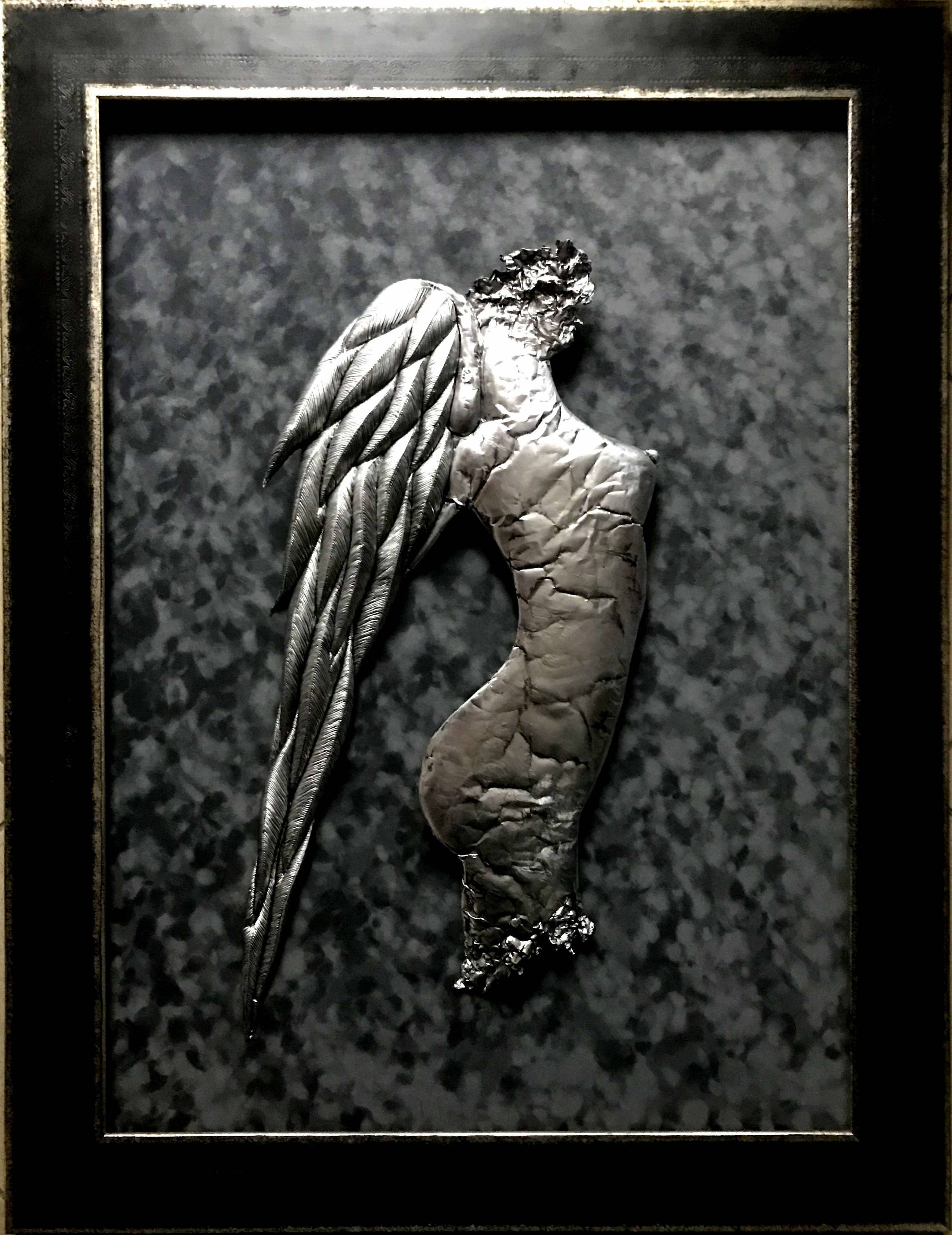 "LAILA" z cyklu: RÓŻA KOSMOSU to repusowany w metalu akt kobiety. Rok powstania: 2018 Kim jest Laila? To niebiańska bogini Polan. Otoczona kultem - dawczyni wszelkiego życia. Do niej zawsze tęsknimy... Praca jest oprawiona, płaskorzeźba w kolorze patynowanego srebra osadzona jest na tle antracytowego weluru, a rama ze szkłem stanowi integralna część obrazu. Wymiary: 116x90x7cm