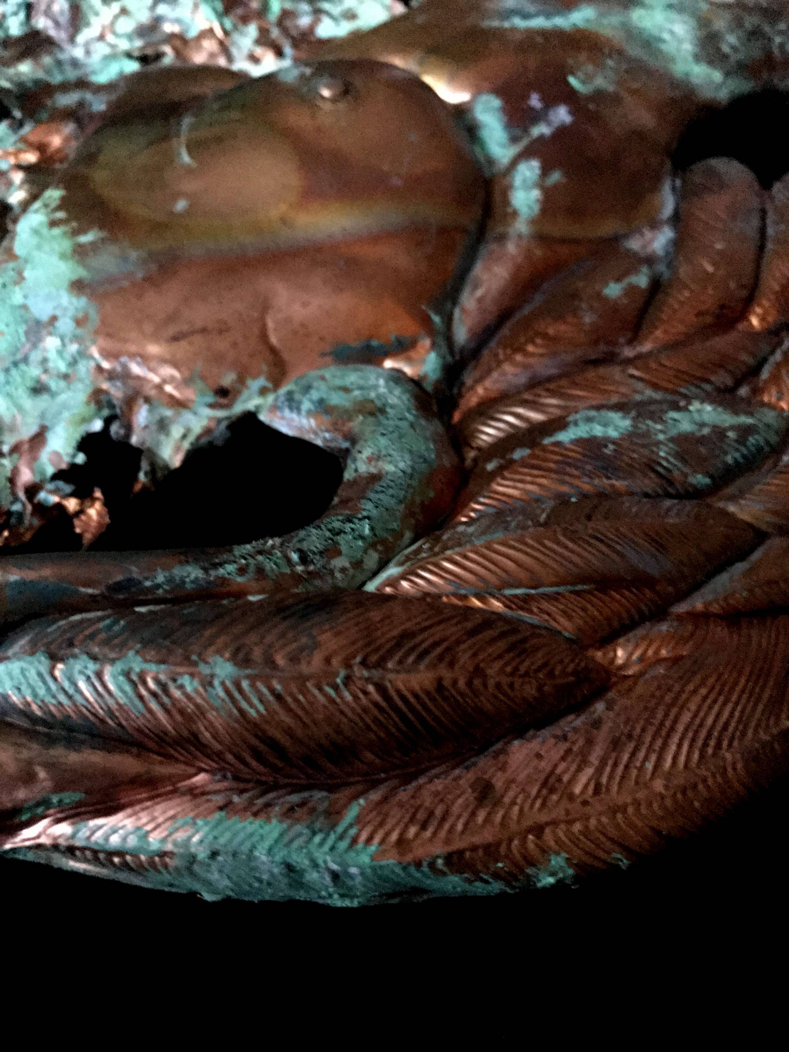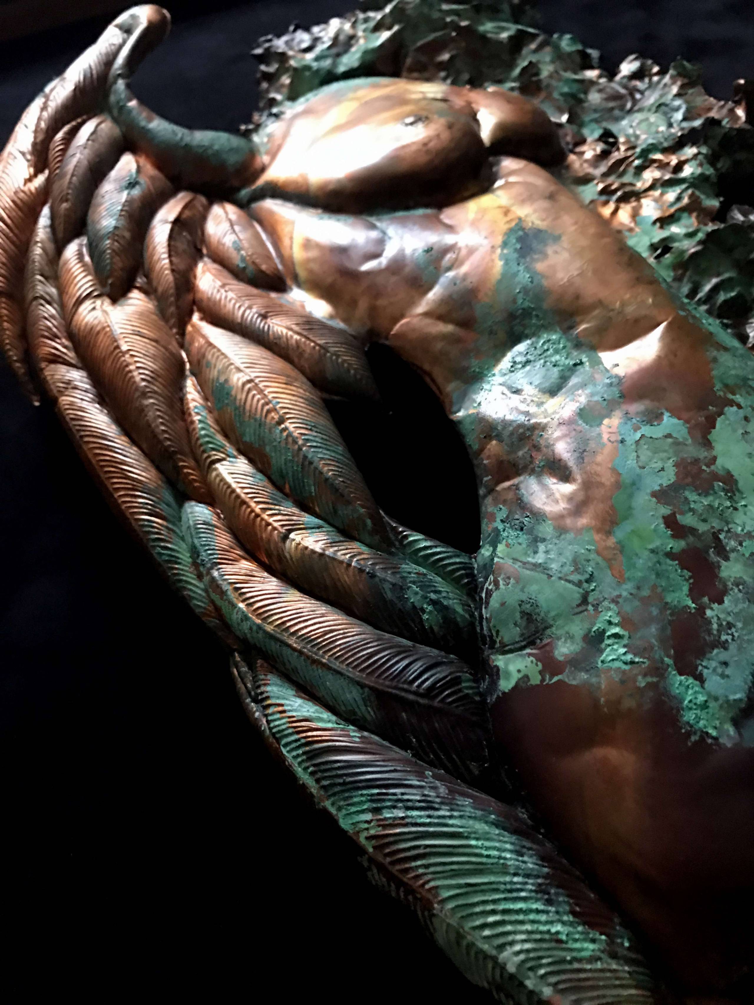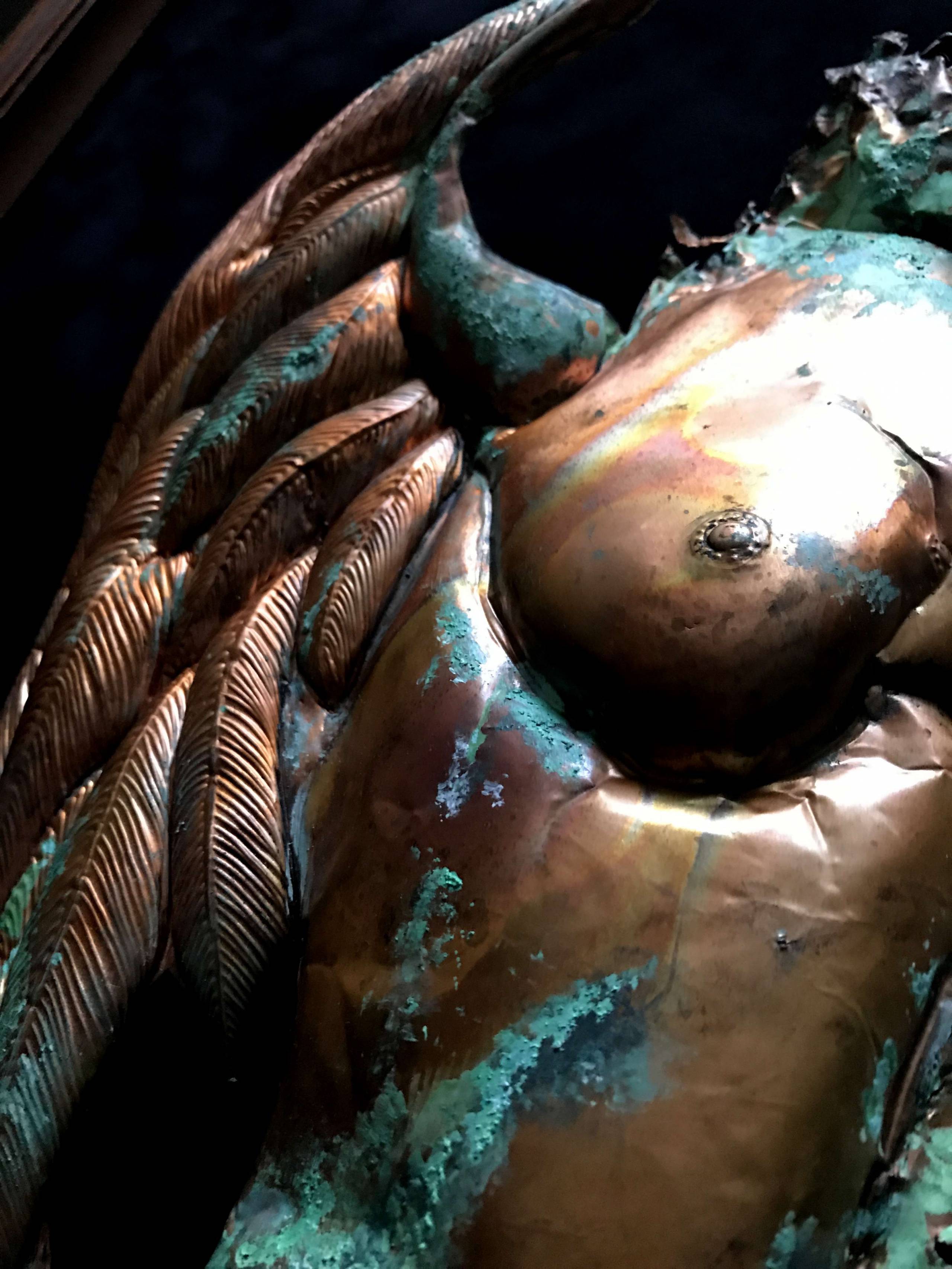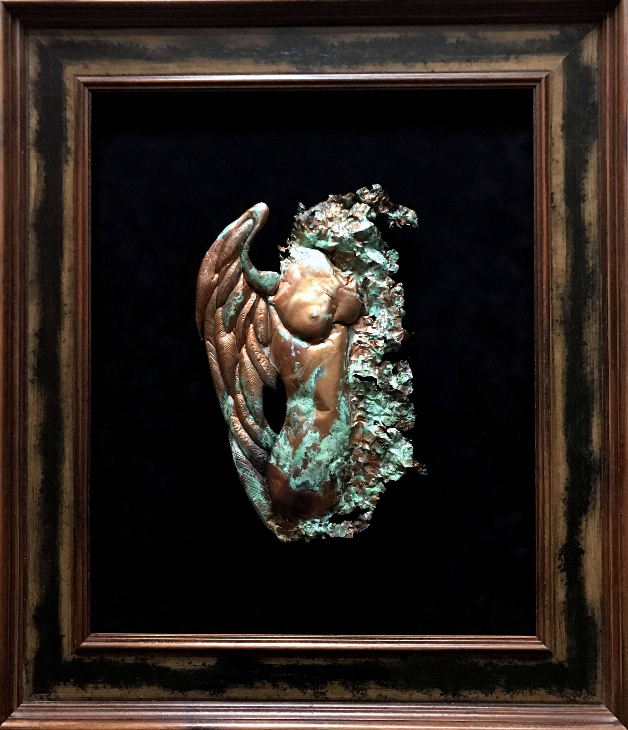 "SAMANI" z cyklu: RÓŻA KOSMOSU to repusowany w metalu akt kobiety. Rok powstania: 2018 Kim jest Samani? To niebiańska bogini . Otoczona kultem - dawczyni wszelkiego życia. Bogini pełna erotyzmu i dobra. Praca jest oprawiona, płaskorzeźba wykonana jest w miedzi i pokryta szlachetnym grynszpanem. Osadzona została na tle czarnego weluru, a nietuzinkowa rama ze szkłem stanowi integralna część obrazu. Wymiary: 86x74x7cm