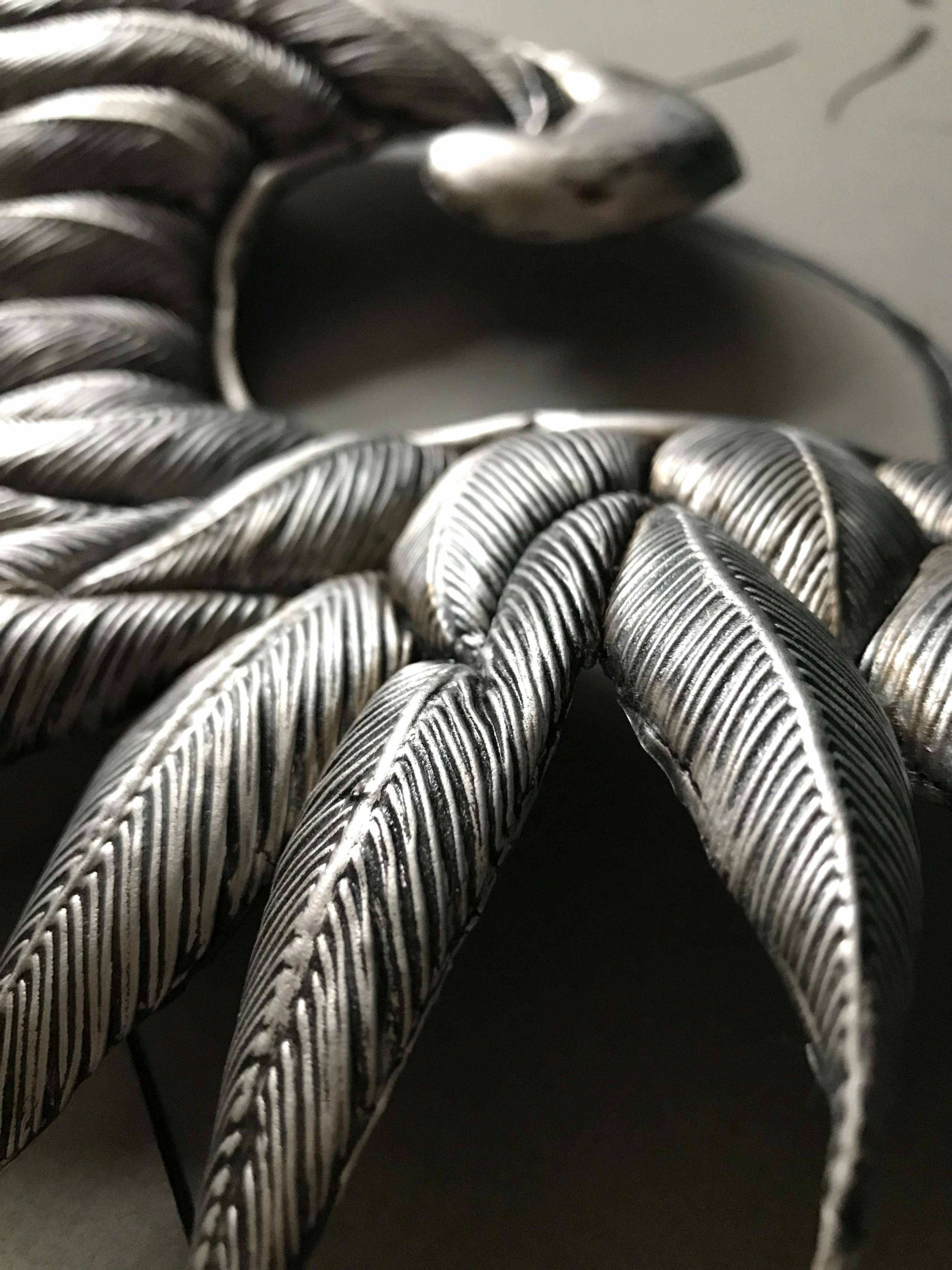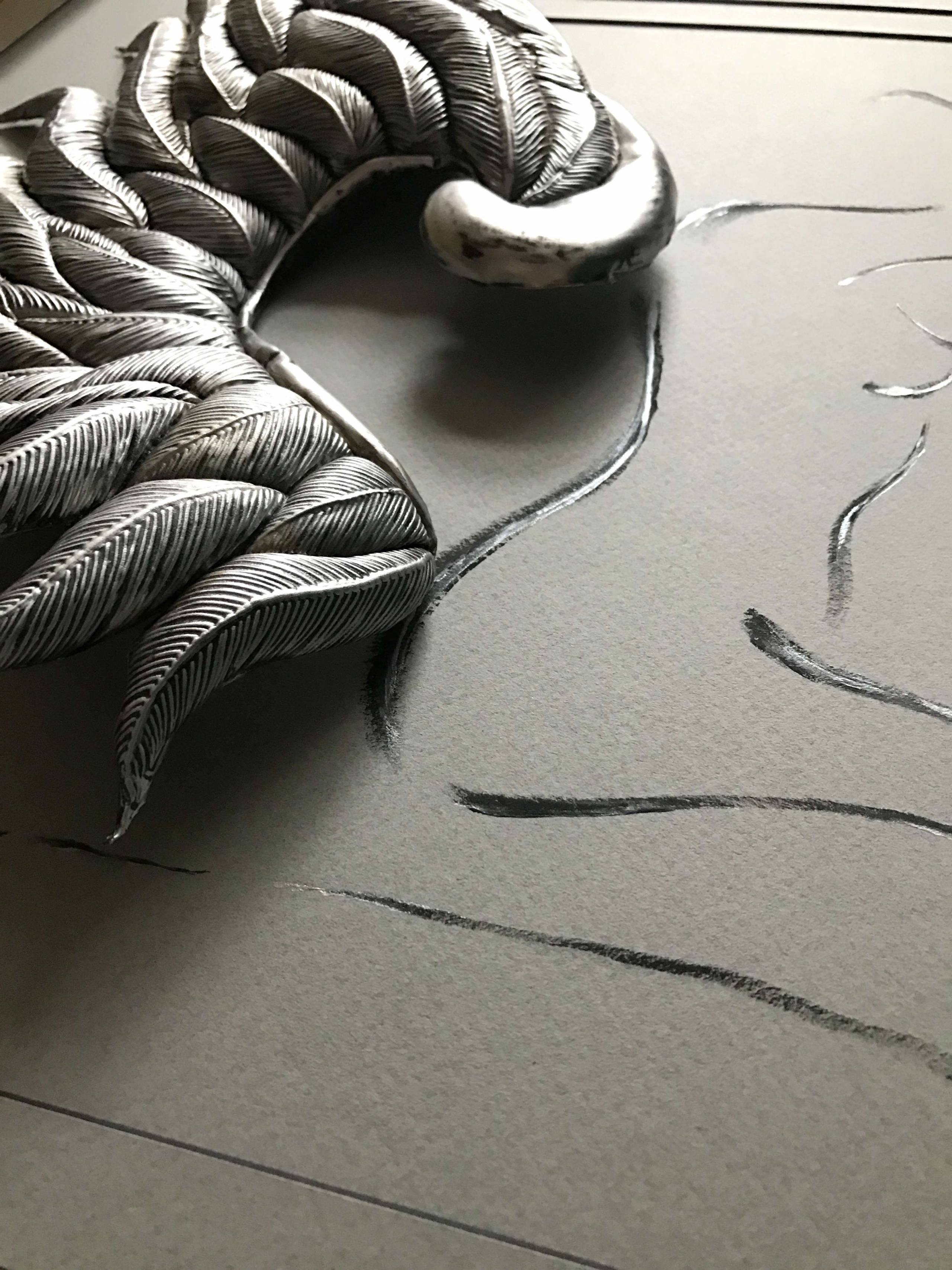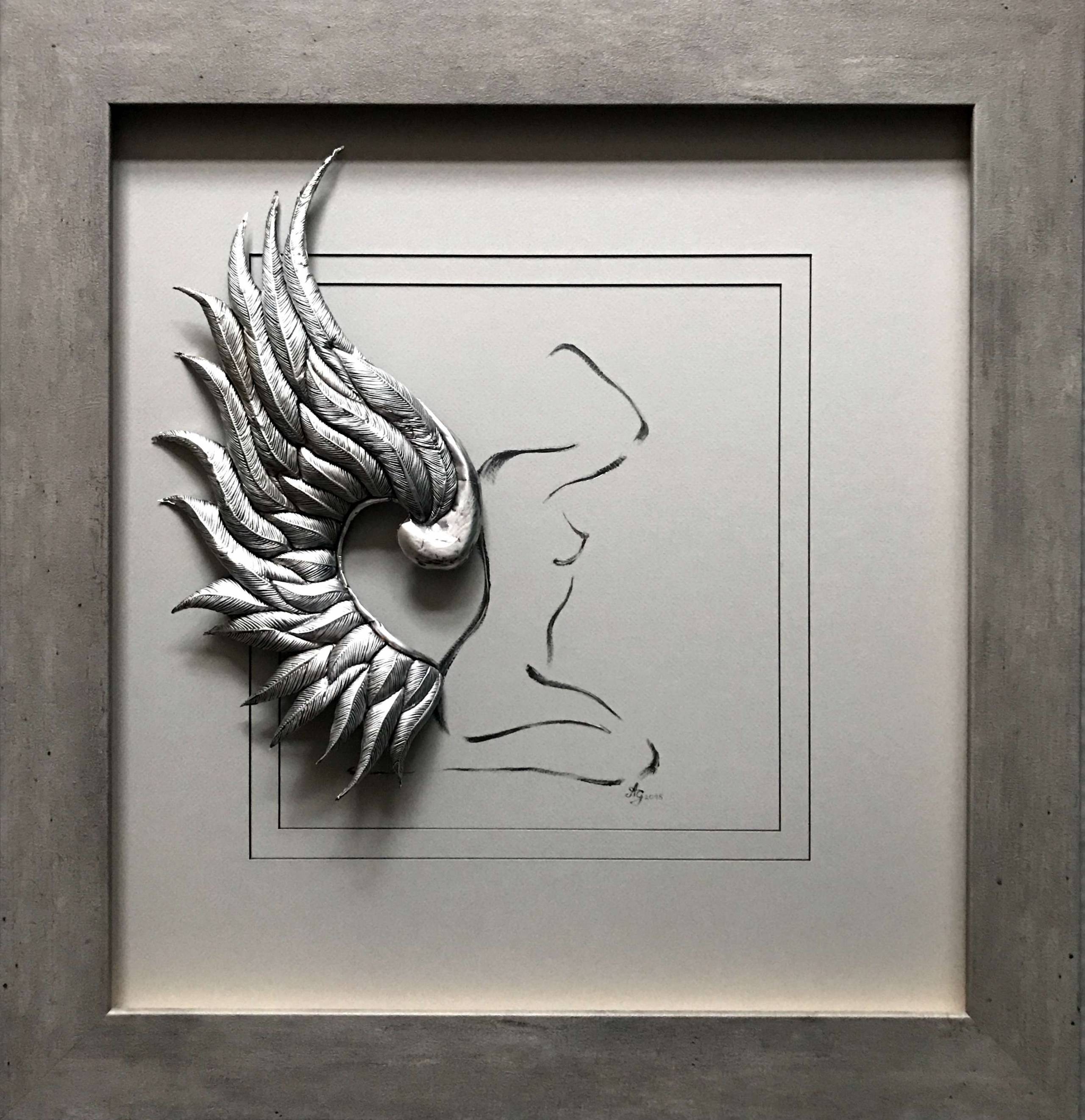 "C" z cyklu: "NU SHU" to obraz przestrzenny, który stanowi: lapidarny szkic oraz ornament metalowy z repusowanego i pokrytego patyną aluminium. Rok powstania: 2018 Akt eterycznej kobiety z anielskim skrzydłem jest moim pretekstem do monologu o tym co kobieta chciałaby przekazać cichutko, po kryjomu, w tajemnicy... Praca jest przestrzenna, za szkłem; utrzymana w industrialnym klimacie, gdzie rama imitująca beton stanowi integralną część obrazu Nü shu(女书) – cóż to takiego? Dokładnie tłumacząc nazwa oznacza “kobiece pismo”. Jest to metoda pisania wyłącznie stosowana przez kobiety z prowincji Hunan w dystrykcie Jiangyong. Pismo to praktycznie wymarło wraz z jego ostatnią przedstawicielką Yang Hua Yi, zmarłą 20 stycznia 2004 roku w wieku ponad 90 lat.