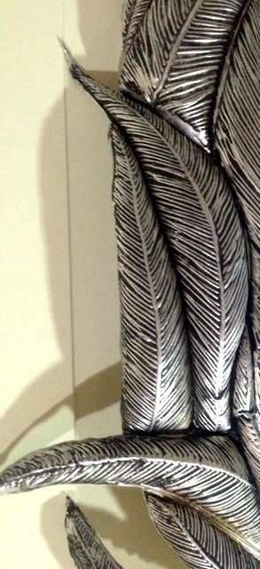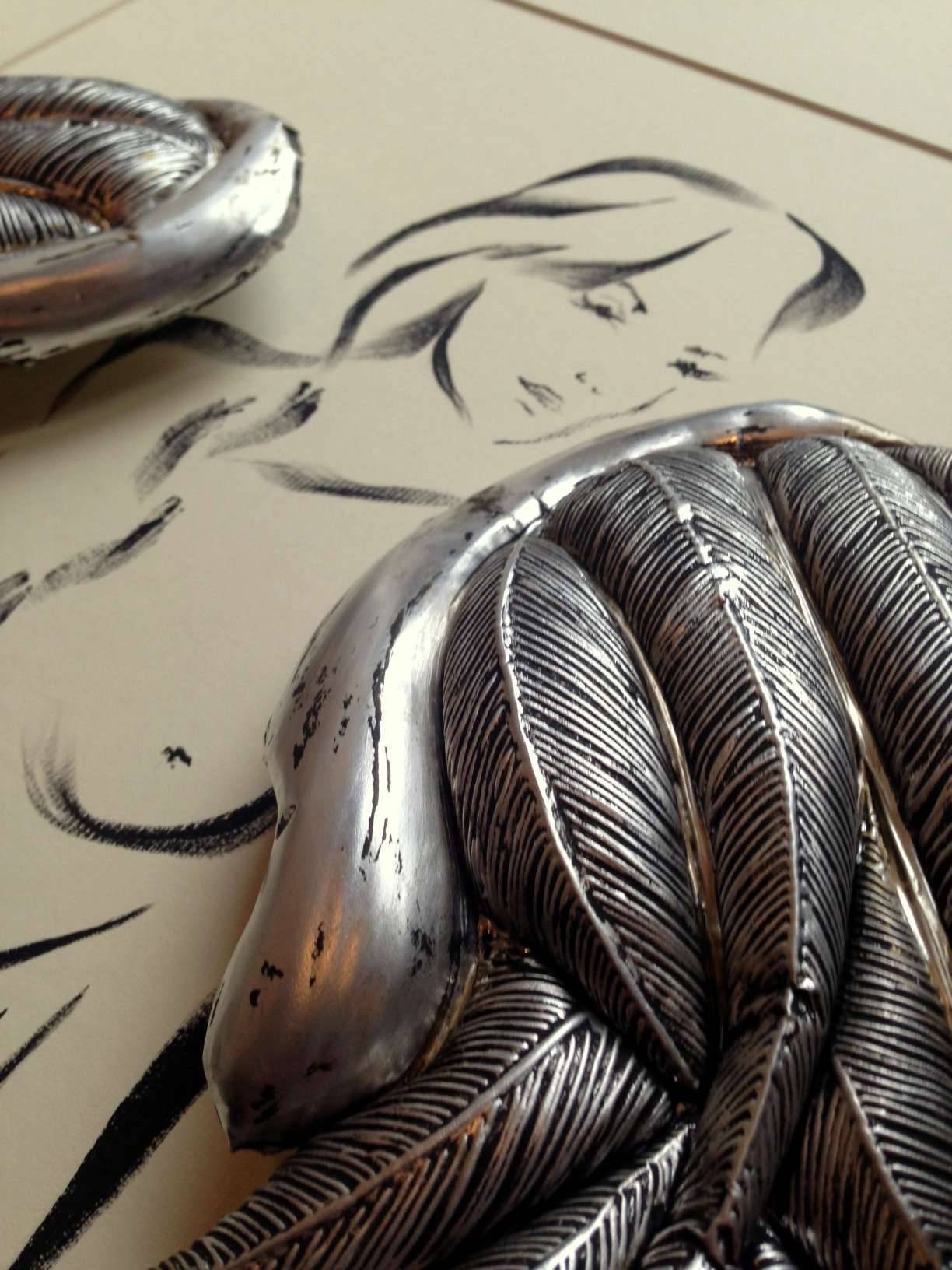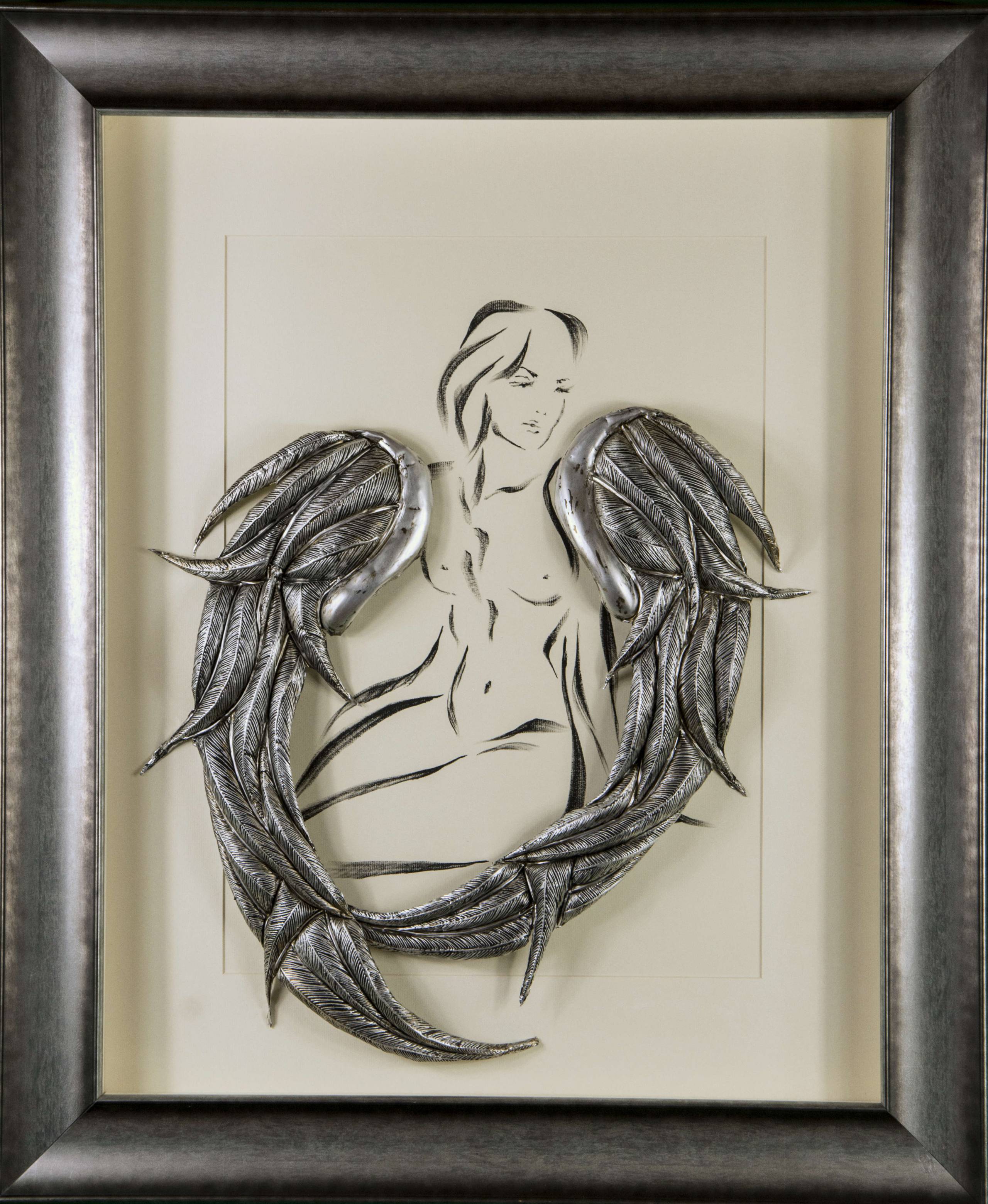 Wrażliwość - awers z cyklu: "Skrzydlate - istoty ziemskie" Szkic: akryl na kartonie, Ornament: repusowane i patynowane aluminium. Praca w ramie, oszklona. Przy zamówieniu repliki autorskiej, klient może mieć wpływ na kolorystykę tła i dobór ramy.