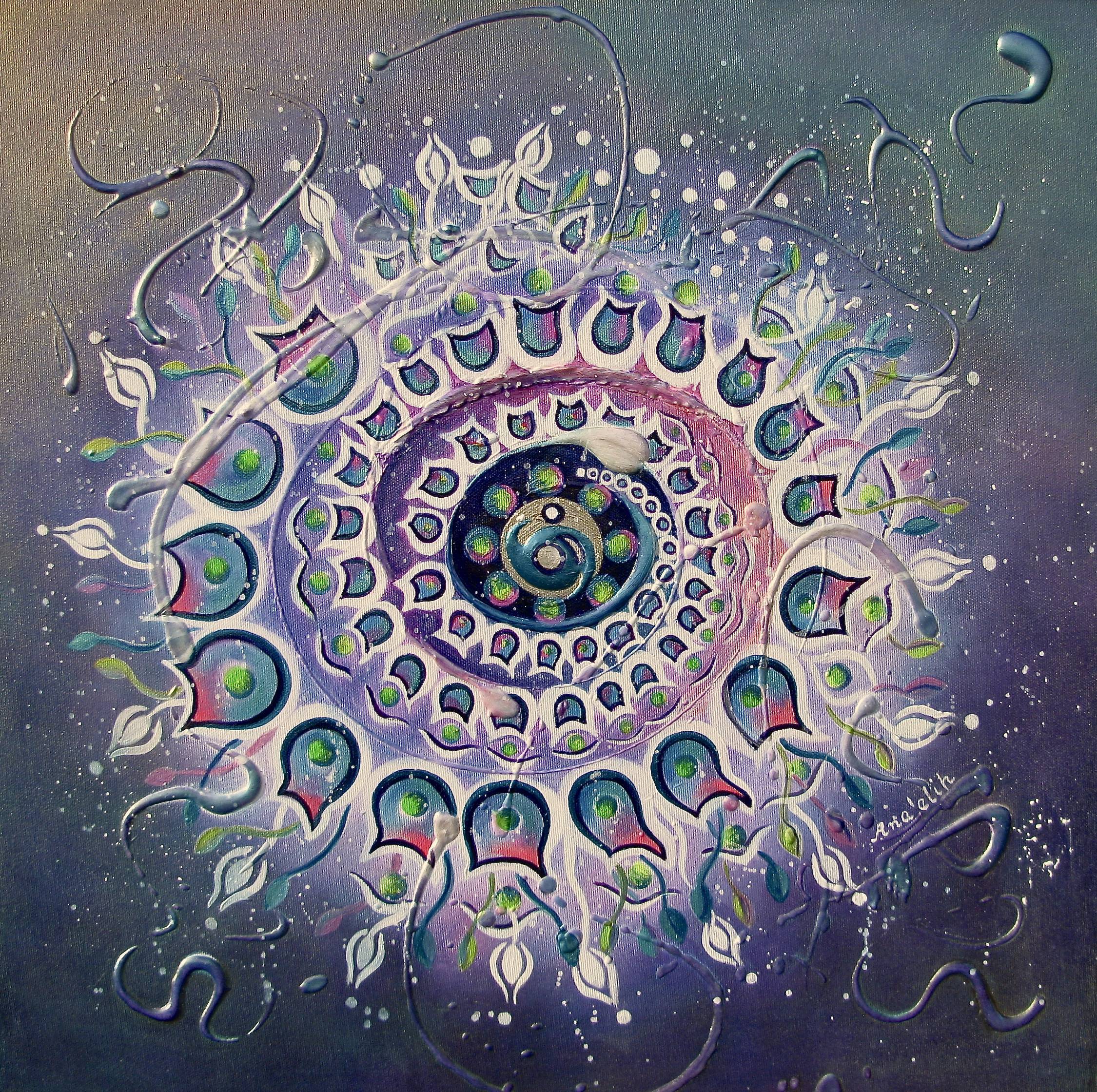 Obraz przed Tobą pełen jest magicznych barw i tajemniczych wzorów. Dominują odcienie fioletu i błękitu, które płynnie przenikają się, tworząc hipnotyzujące tło. Centralnym punktem jest pulsująca spiralna forma, która przyciąga wzrok niczym wirujący taniec. Elementy przypominające liście i łezki, z subtelnymi akcentami zieleni i różu, układają się harmonijnie, jakby zachęcając do odkrycia ich sekretu. Czy to kosmos, czy może mandala pełna energii? Atmosfera jest spokojna, medytacyjna. Obraz emanuje harmonią i równowagą, niczym delikatna melodia natury. Artysta wykorzystał tu technikę mixed media, dodając fakturę i głębię, które niemal wciągają odbiorcę do środka. Pastele i akwarele tworzą efekt dreamlike, niosąc nas w podróż po nieodgadnionych ścieżkach wyobraźni. Dla niektórych to jak spojrzenie w nieskończoność, jakby patrzeć w głąb własnych myśli. Dla innych może to być obraz snu, który przenosi nas w sferę marzeń. "Wow, to przypomina kosmiczną pizzę", powiedziałby mały chłopiec, dostrzegając w sztuce coś bliskiego sercu. Osobiście czuję się, jakbym odkrywał tajemny świat. Elementy migoczące w obrazie wywołują skojarzenia z magicznym ogrodem. A może to po prostu magic? Cokolwiek to jest, niesie ze sobą poczucie spokoju i dziwny komfort, jak ciche popołudnie spędzone na łonie natury.