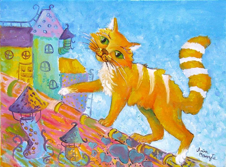 Bajkowy, sympatyczny kotek spacerujący po dachu. Jak z rymowanki "wlazł kotek na płotek i mruga", która stanowiła punkt wyjścia do wstępnego szkicu. Jednak podczas rysowania moja kicia zdecydowała, że trochę popozuje i dumnie przeparadowała po poręczy krzesła. Zmieniłam więc pozę kotka korzystając z żywej modelki. Obraz malowałam z myślą o dziecięcym pokoju, tak, aby był jak najbardziej kolorowy i rozświetlał wnętrze. Skąd pomysł na kolorystykę? Za oknem akurat słońce nie dopisało, postanowiłam więc namalować coś w kolorach tęczy :) Obraz dość długo powstawał. Ponieważ zależało mi na jak najczystszych, niemieszających się ze sobą kolorach, musiałam czekać, aż płótno przeschnie (np. dachówka w kształcie serduszek, futerko kota) lub malować w technice "mokre w mokrym" (tło, domki, komin). Tło zostało namalowane palcami, boki obrazu są zamalowane.