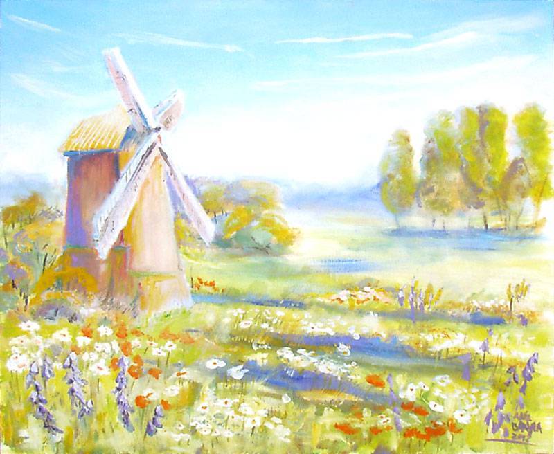 Windmill on a flowery meadow, painted during plain-air trip in Sominy village, Kaszuby area in Poland. Thick paint texture.