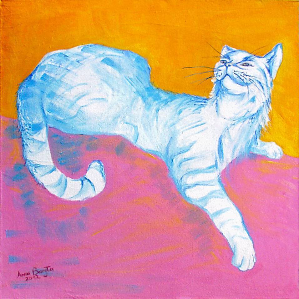 Dumny kot - na awangardowo. Pomysł na obraz powstał praktycznie w ciągu sekund. Moja kotka wskoczyła na drzwi do pokoju (jak? przecież to dwa metry nad podłogą), spojrzała na mnie prowokująco - jeszcze mnie nie malujesz? :) - i ułożyła się w pozycji jak na obrazie. Minę kota narysowałam jednak inną niż zaobserwowaną; chciałam, aby lepiej było widać koci dumny i niezależny charakterek. Większość obrazu powstała w ciągu jednej sesji, szkicowałam wszystko brązową kredką, rysując tak szybko, jak się dało, zanim zwiała moja modelka. Potem przeniosłam szkic wykonany "naprędce" na duże płótno 80x80 cm. Całość wykonałam dużym, płaskim pędzlem, zostawiłam do przeschnięcia. Potem cienkim pędzelkiem dodałam kocie wąsy i szczegóły oczu. Obraz będzie dobrze się prezentował w nowoczesnym wnętrzu, zwłaszcza w płaskiej, wąskiej czarnej ramie. Sugerowałabym ciemny kolor ramy, ponieważ podkreśli żywe kolory obrazu; obraz będzie sprawiał wrażenie, że się "świeci".