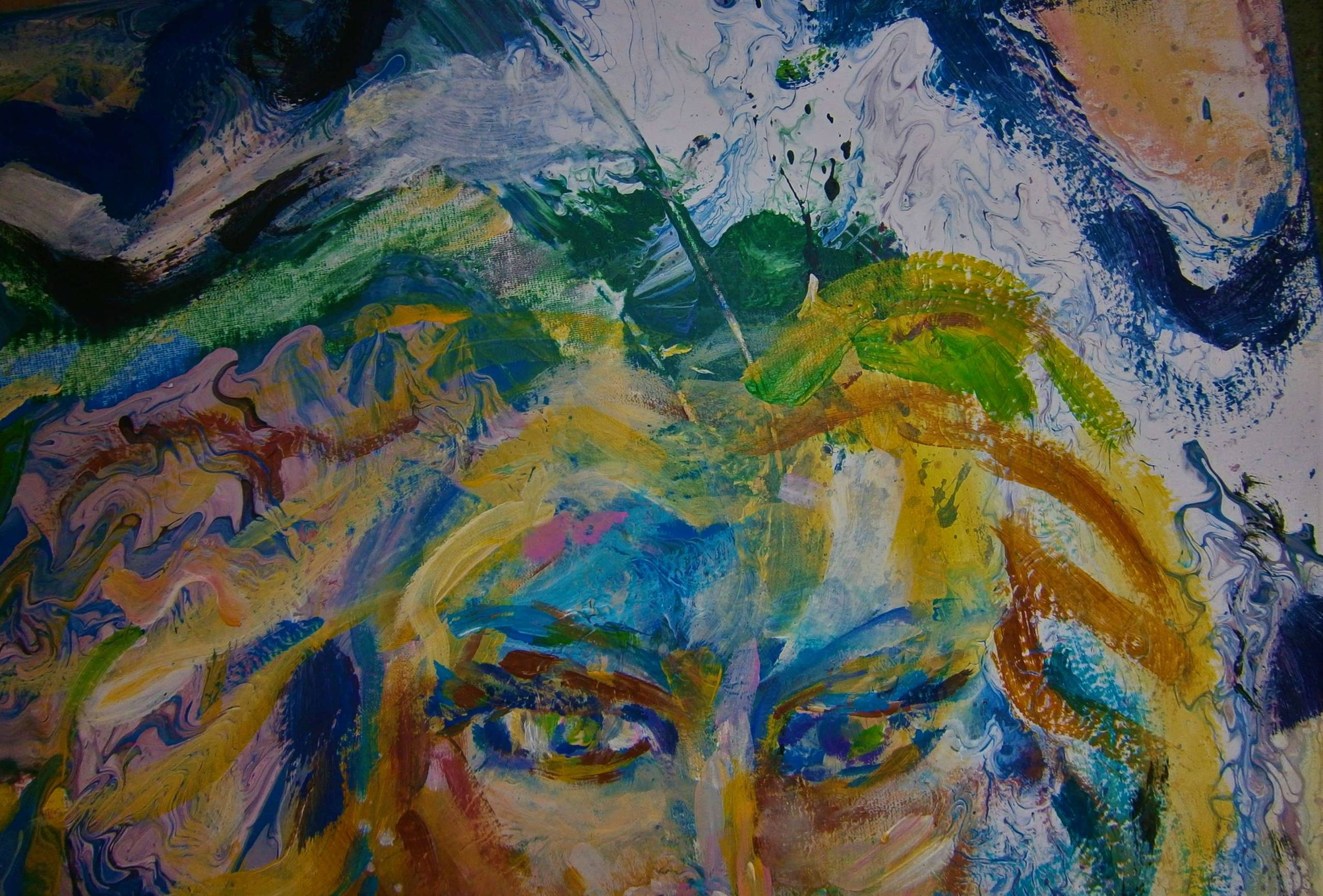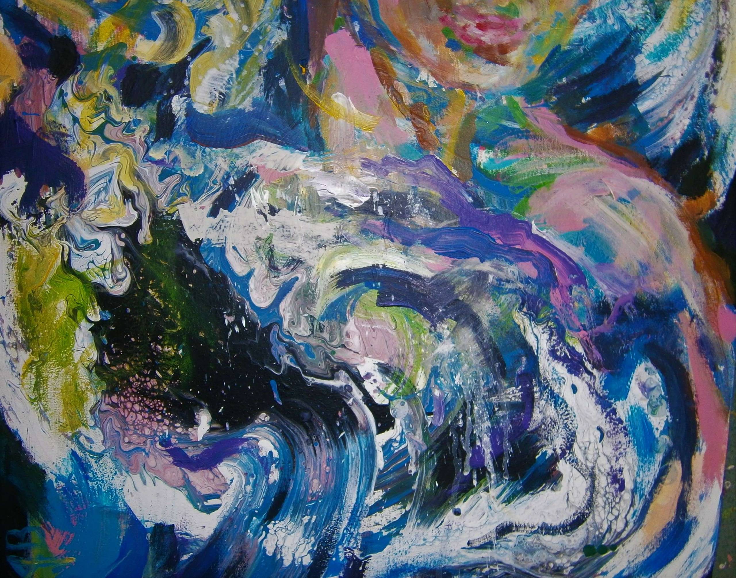 Obraz malowany w nowoczesnej technice pouring akryl na płycie. Fantazyjne fale oplataja piękną długowłosą dziewczynę.
