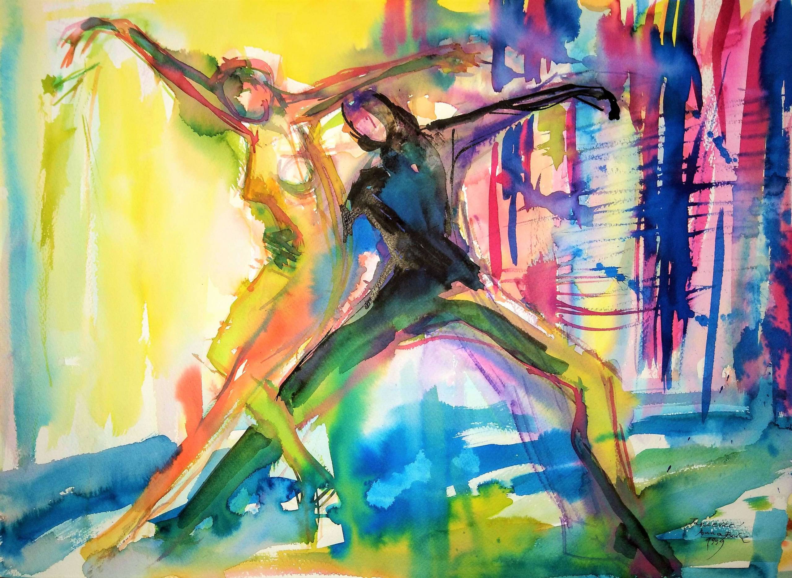 Para współczesnego baletu w tańcu. ekspresyjny obraz malowany barwnymi tuszami , wymiary 50x70 , w oprawie passepartout 70x100 cm