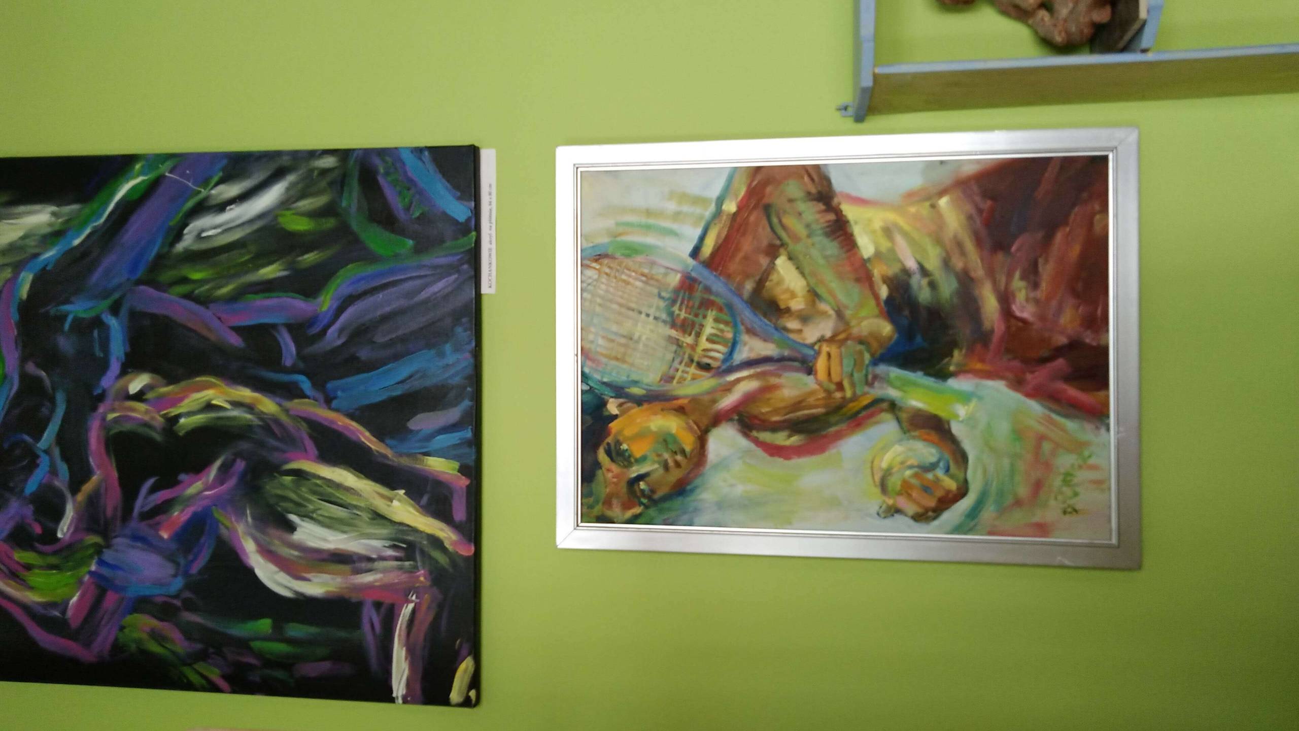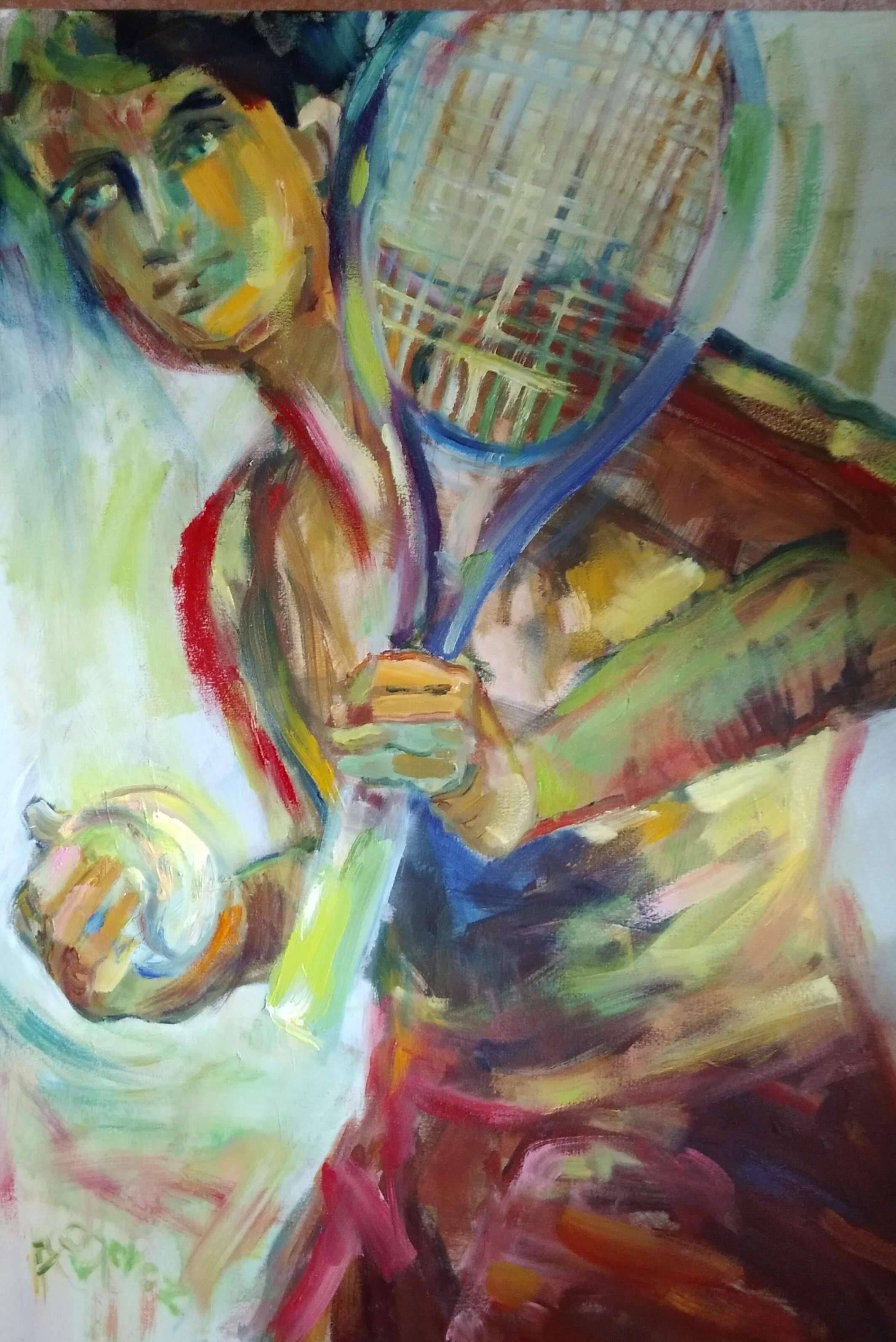 Obraz młodego tenisisty ujęty w srebrną ramę.