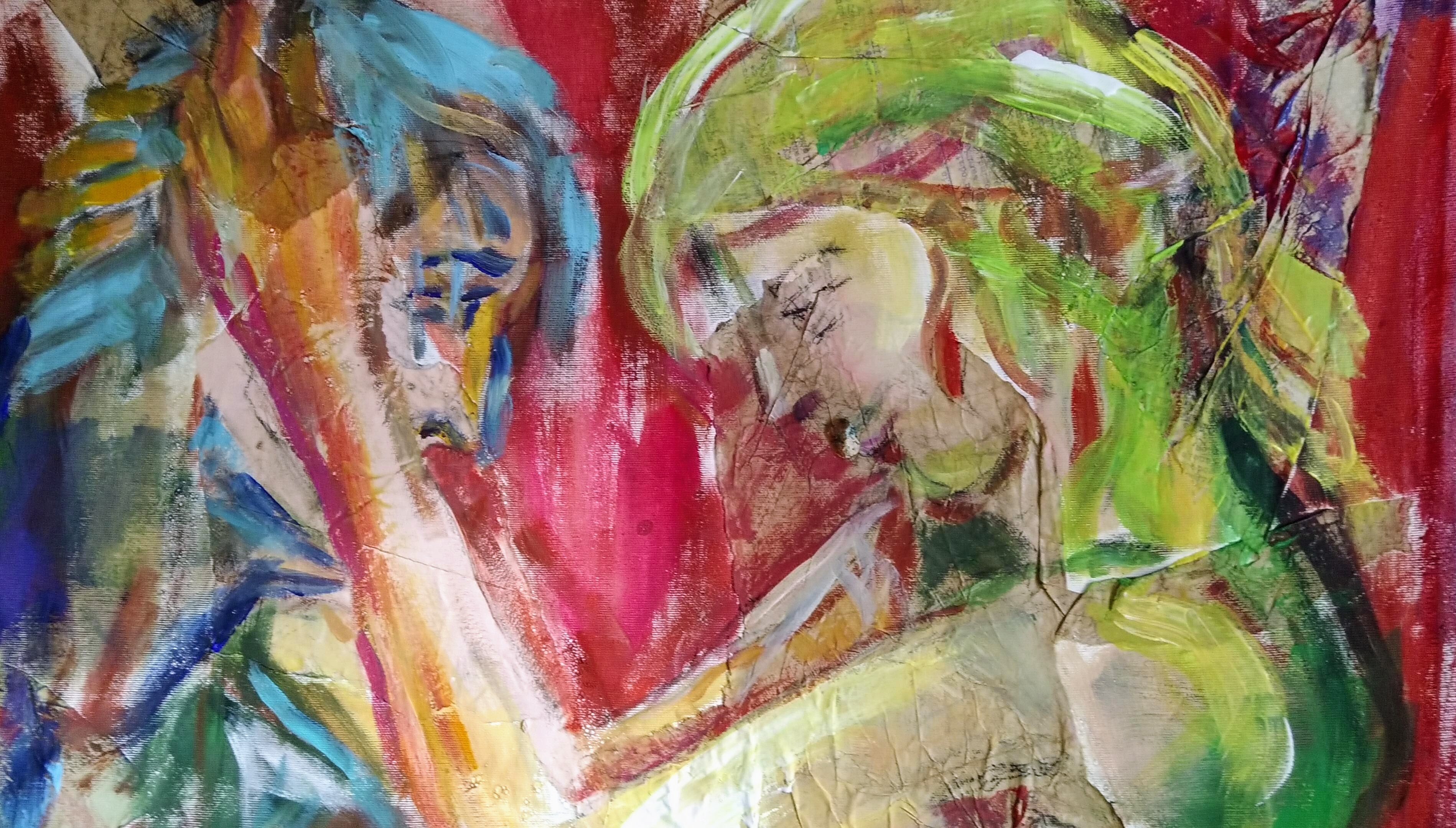 Zakochana para w stylu hinduskim. Obraz olejny w ramie, zabezpieczony przeźroczystą płytą z pleksi.Oprawiony w szeroka złota ramę ręcznie zdobioną przez autorkę. Kolaż na płótnie .