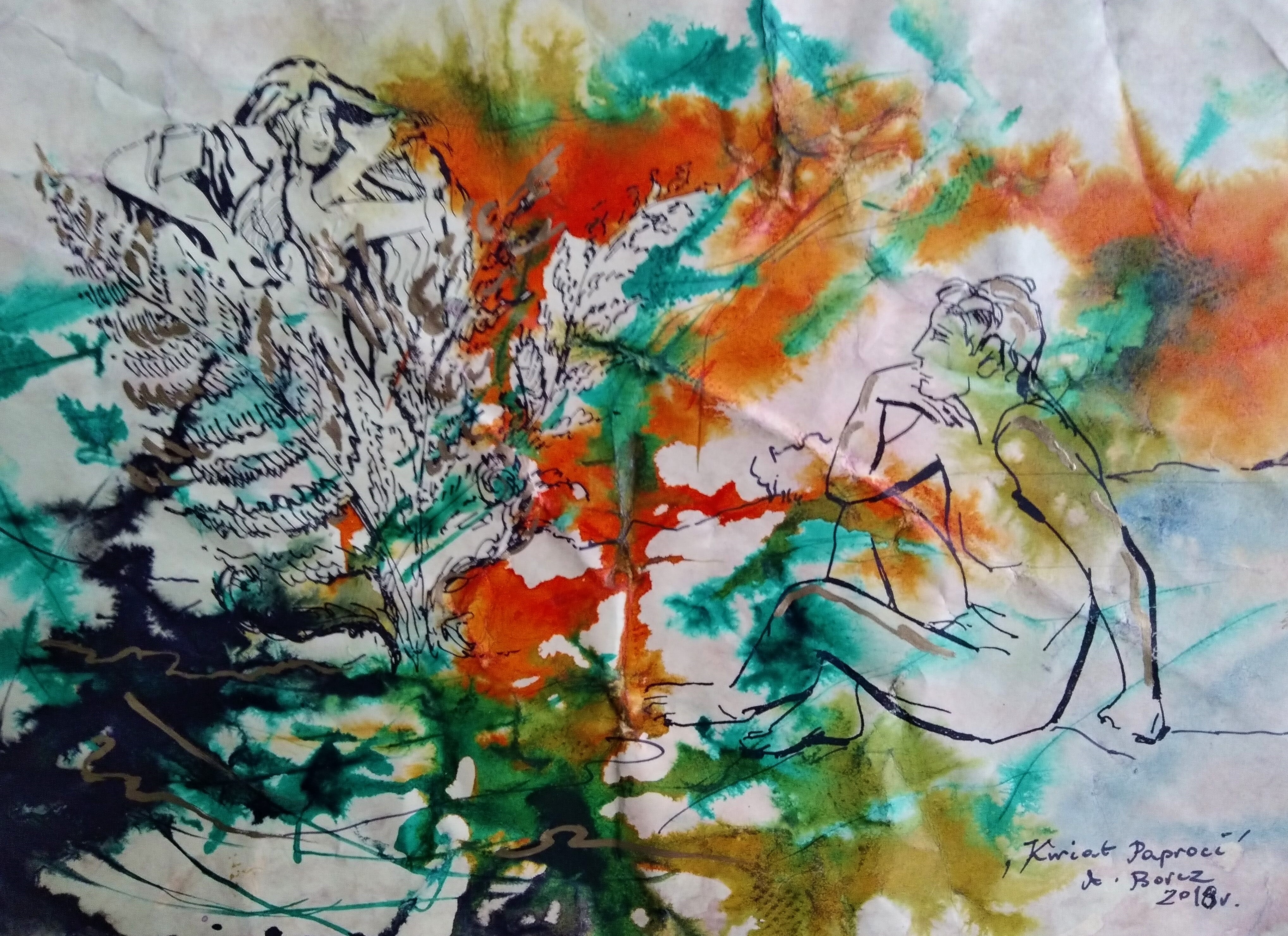 Poszukiwanie zaczarowanego Kwiatu Paproci podczas Nocy Świętojańskiej. Akwarela w passepartout i ramce o wymiarach 30x40cm