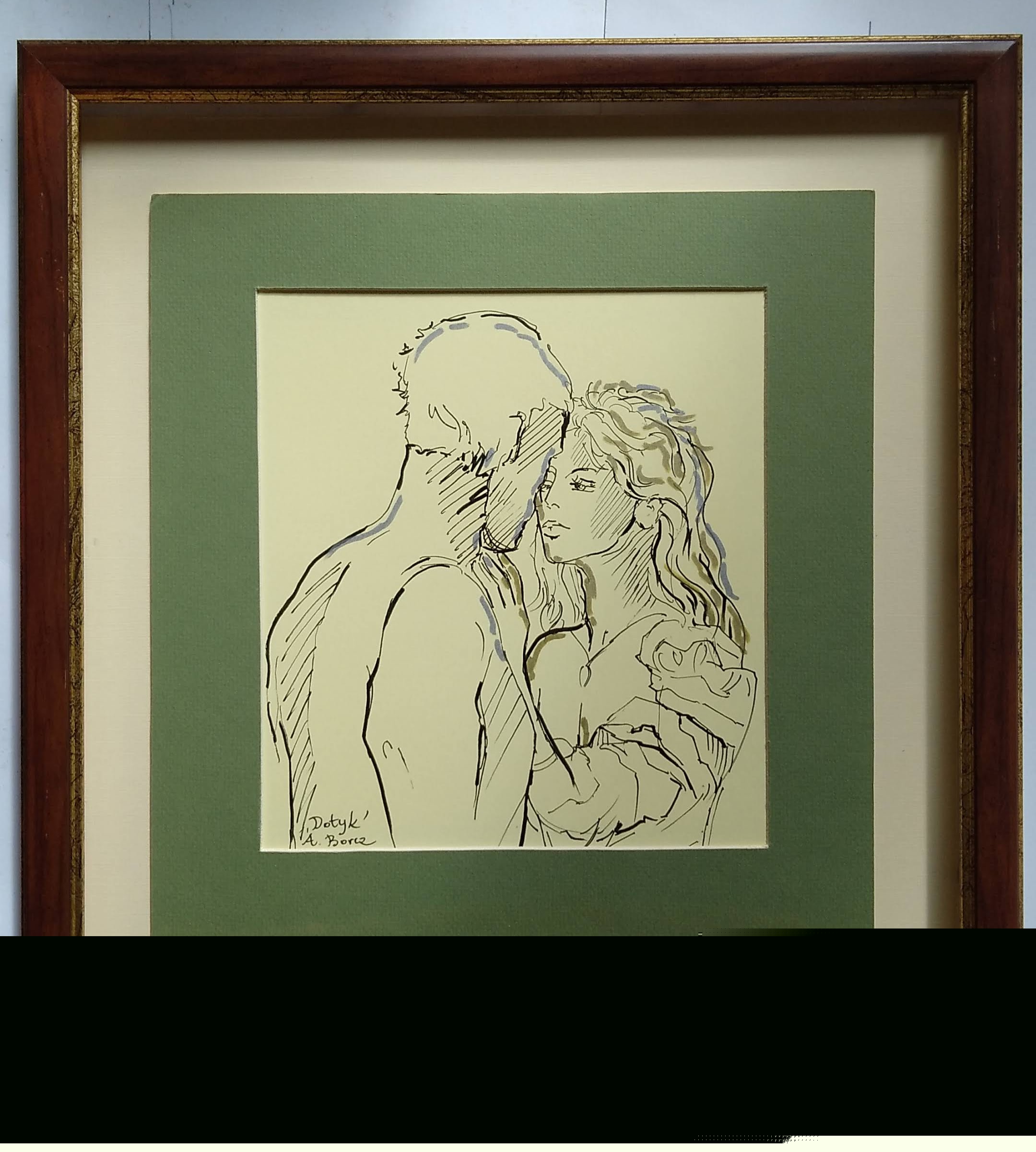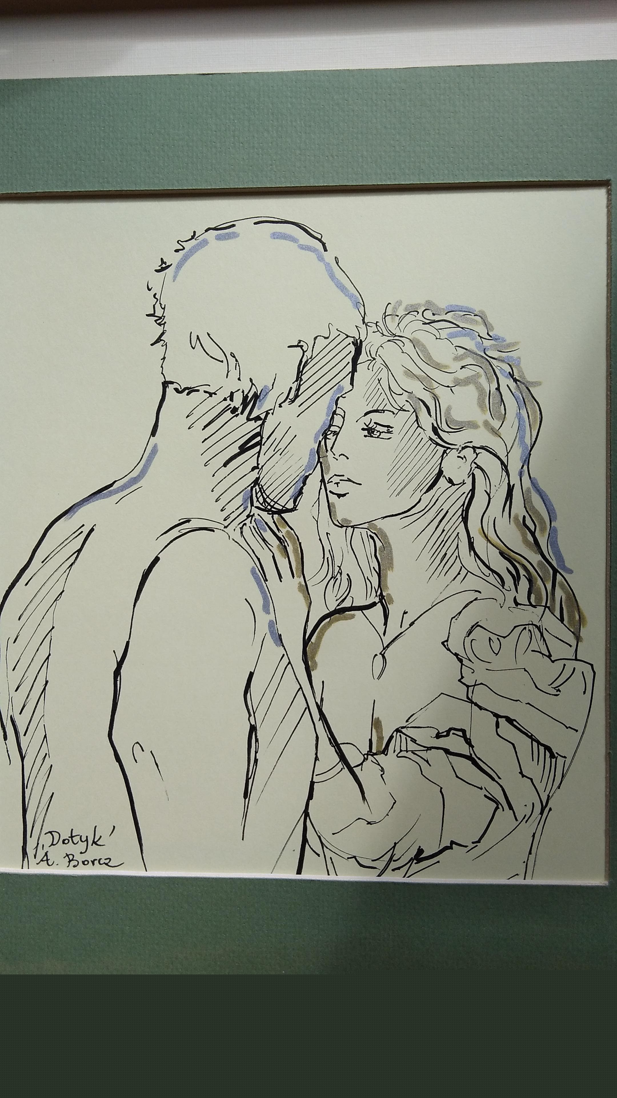 Na obrazie widzimy subtelny rysunek przedstawiający parę. Kompozycja jest intymna i skupiona, ograniczona do dwóch postaci skierowanych ku sobie. Linia jest płynna, z delikatnymi, ale wyraźnymi konturami, które tworzą dynamiczny rysunek. Kolory są stonowane, z dominacją beżu i zieleni, co nadaje pracy spokojną, klasyczną aurę. Jest coś nostalgic istotnego w tym obrazie, który przypomina o wieczności emocji. Atmosfera jest pełna czułości, niemal można poczuć ciepło wymienianych spojrzeń. Artysta posługuje się techniką delikatnych linii przypominających szkic, co daje poczucie spontaniczności i ulotności chwili. Ta praca może budzić w odbiorcy uczucie miłości, czasem smutku lub tęsknoty za bliskością. Styl rysunku jest minimalistyczny, co pozwala skupić się na emocjach postaci. Wrażenie? Czuję się, jakbym był świadkiem chwili pełnej zaufania i bliskości. Takie momenty sprawiają, że życie jest piękne, prawda? Obraz jest jak kartka z pamiętnika, tylko, że bez słów, a tyle mówi.