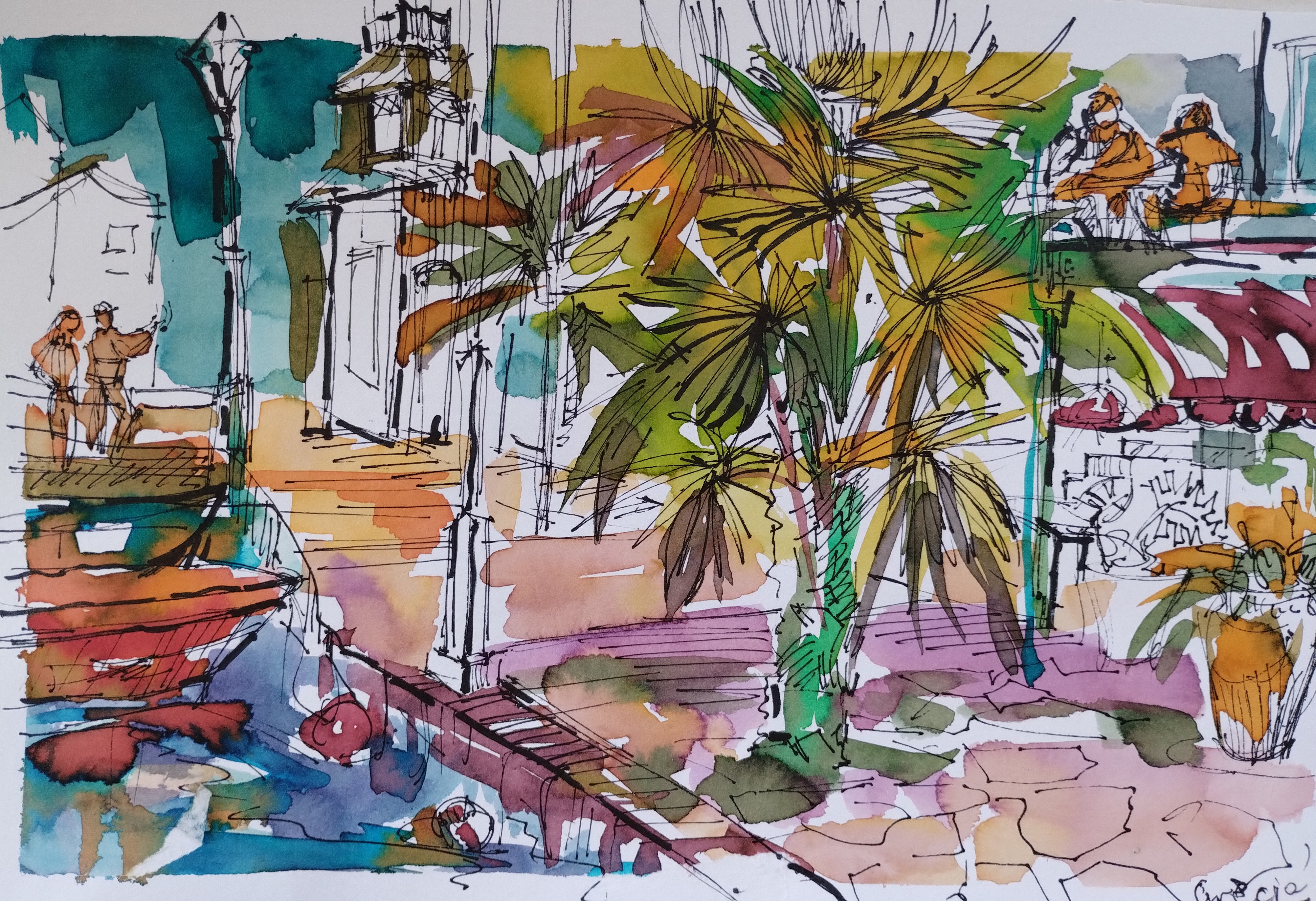 Obraz ukazujący wyspę Kretę w Grecji, pulsuje życiem, pełnym ciepłych, letnich kolorów małego portu. Wtapiamy się w kompozycję pełną zieleni palm, turkusowych i pomarańczowych odcieni, które tworzą harmonijną całość. Kształty są swobodne, trochę jakby niedokończone, ale to dodaje uroku tej improwizacji. Nieco chaotycznie zarysowana architektura odzwierciedla klimat śródziemnomorskiej uliczki, gdzie czas płynie wolniej. Atmosfera jest swobodna i beztroska, przypomina wakacyjne popołudnie, kiedy słońce tańczy między liśćmi drzew, a lekki wiaterek otula twarz.