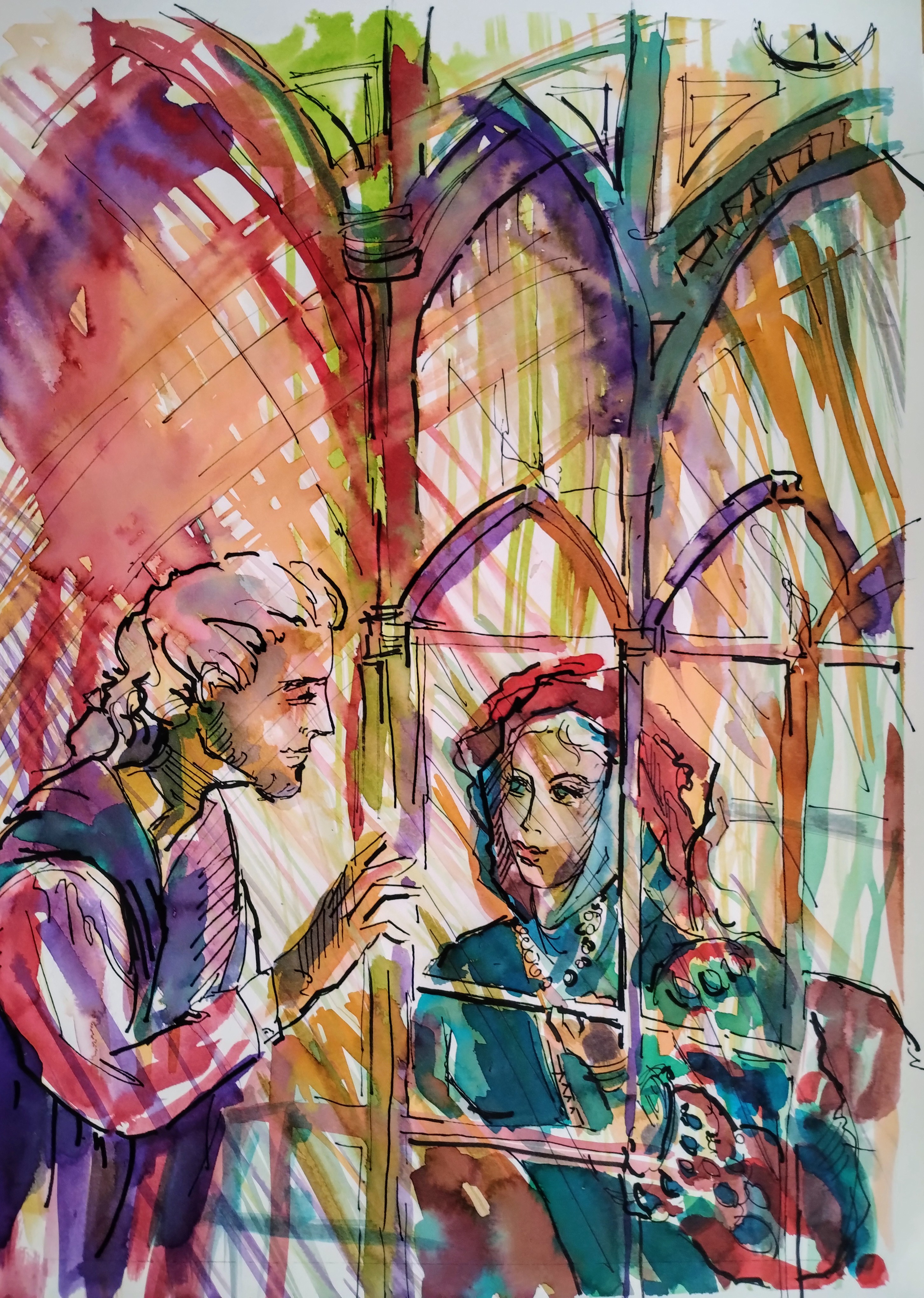 Para w strojach z epoki renesansu spotyka sie w ukryciu. kobietę i mężczyznę oświetla światło z kolorowych witraży. Może planują ucieczkę? Całość ma w sobie coś magicznego – jak echo dawnych opowieści zamkniętych w stylowym, kolorowym splocie.