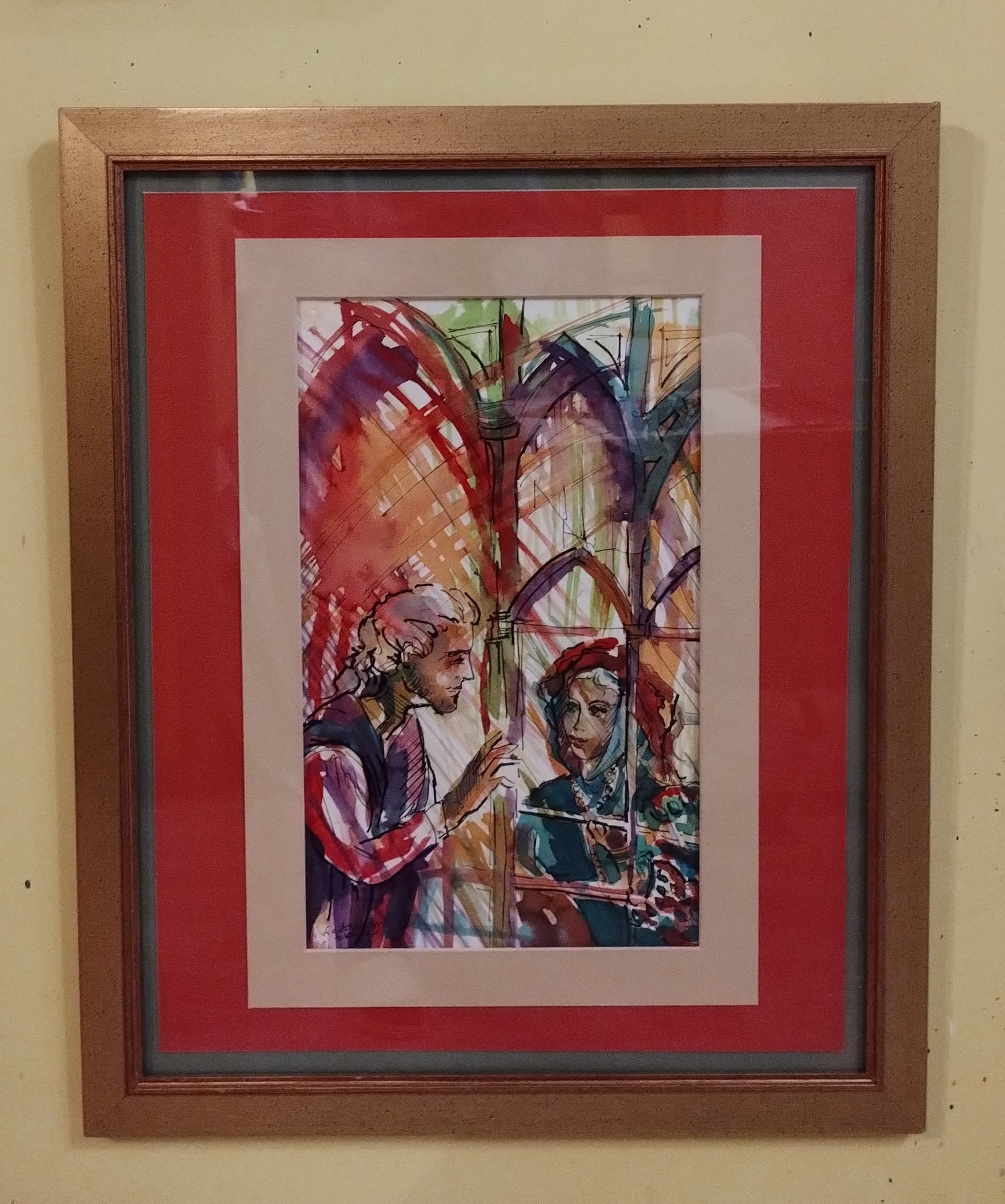 Para w strojach z epoki renesansu spotyka sie w ukryciu. kobietę i mężczyznę oświetla światło z kolorowych gotyckich witraży. Może planują ucieczkę? Całość ma w sobie coś magicznego – jak echo dawnych opowieści zamkniętych w stylowym, kolorowym splocie.