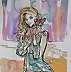 Na tle pejzażu otwartego spotykamy dziewczynę z zaprzyjaźnionym małym psem w objęciach, wykonane techniką akwareli, co nadaje całości lekkość i eteryczną atmosferę. Dominują pastelowe odcienie różu, błękitu i fioletu, które płynnie przechodzą w siebie, tworząc delikatne, niemalże bajkowe tło. Linie są swobodne i nieregularne, co dodaje całości dynamiki. Dziewczyna patrzy wprost przed siebie, a jej spojrzenie wydaje się być pełne zadumy i spokoju.