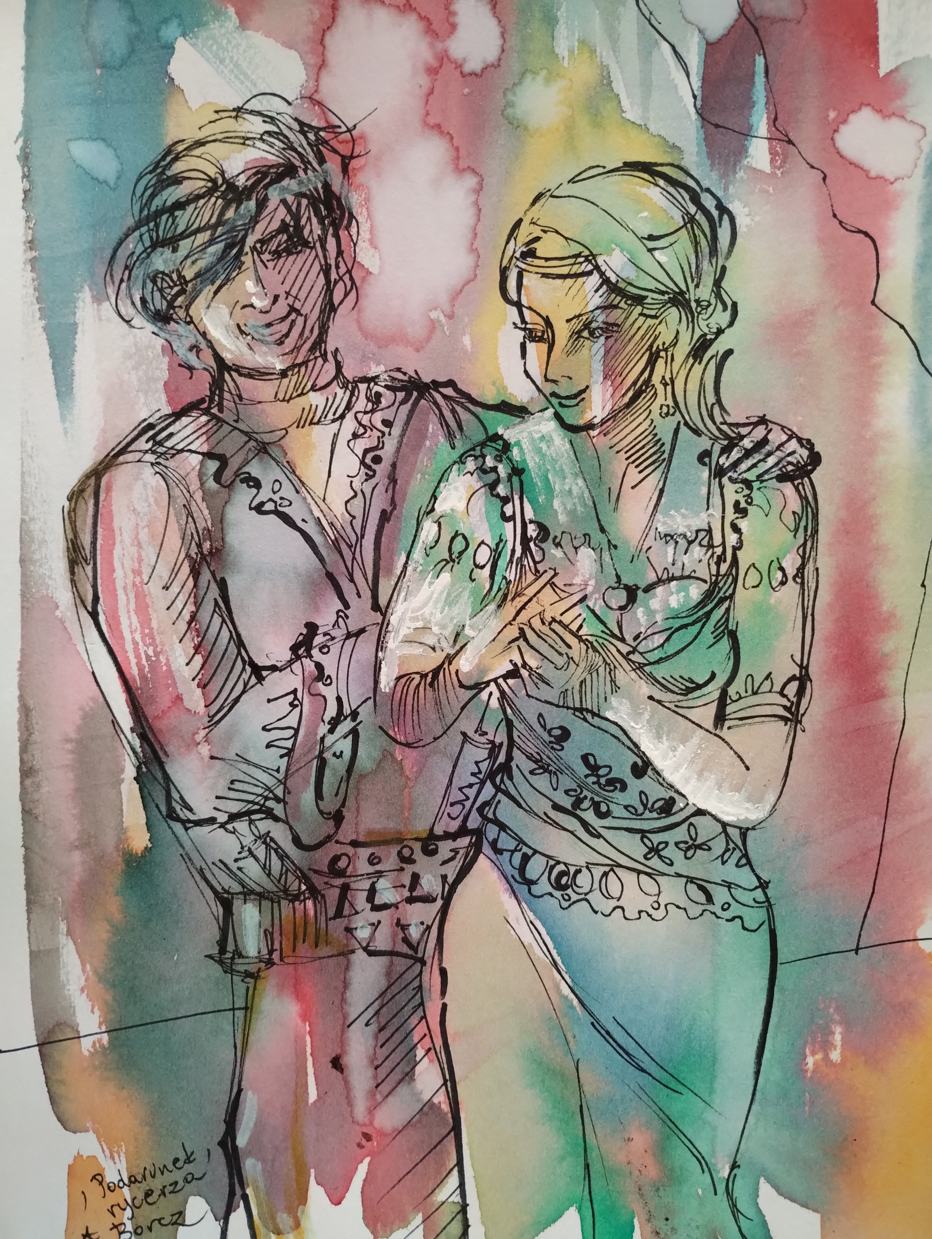 Akwarela , która ukazuje moment radości z podarunku . Dama ogląda pierścionek od rycerza. Ciekawie jest, jak proste pociągnięcia pędzlem mogą oddać tyle emocji. Obraz emanuje pozytywną energią, a jego styl balansuje na granicy abstrakcji i figuratywności.