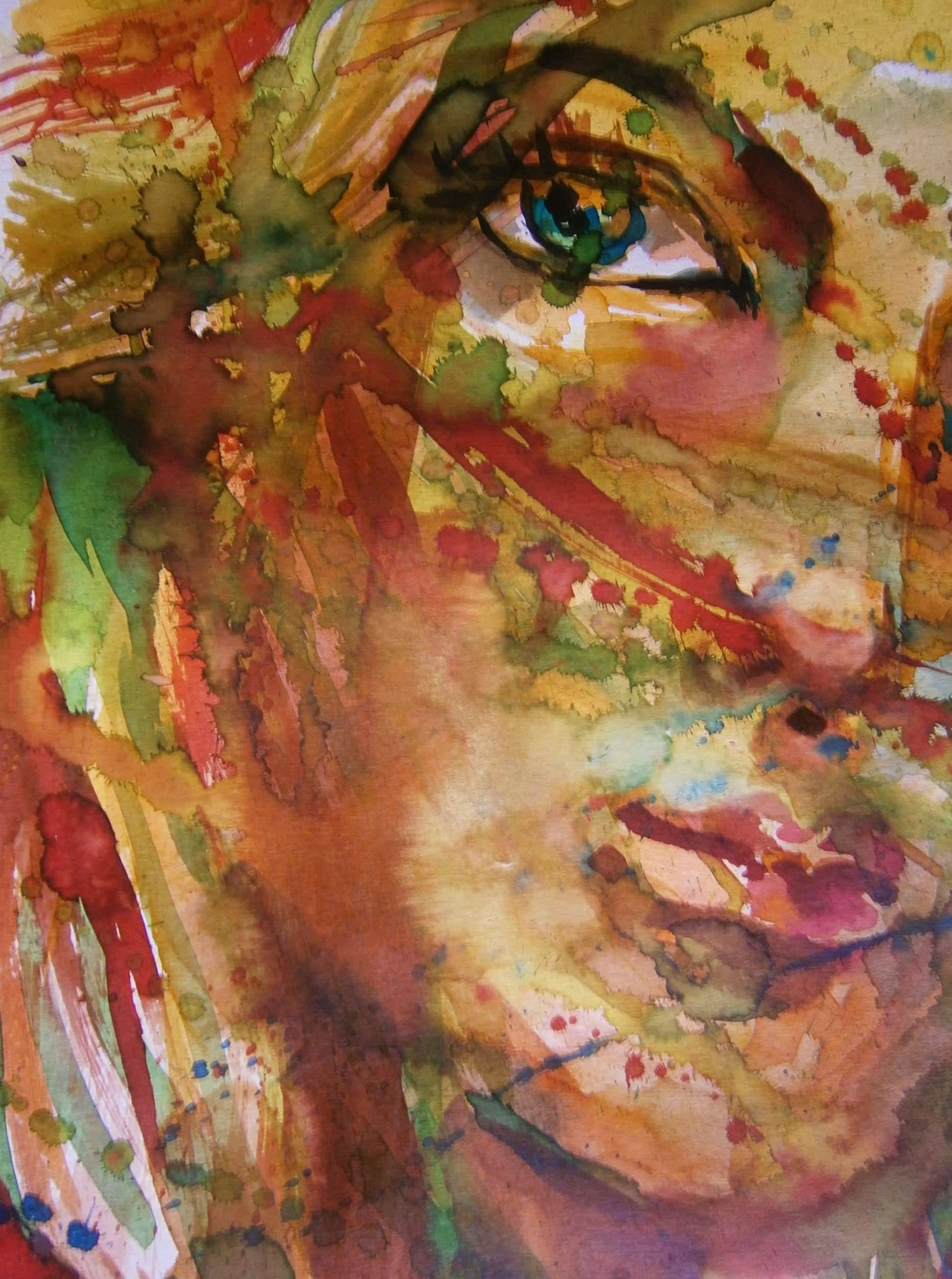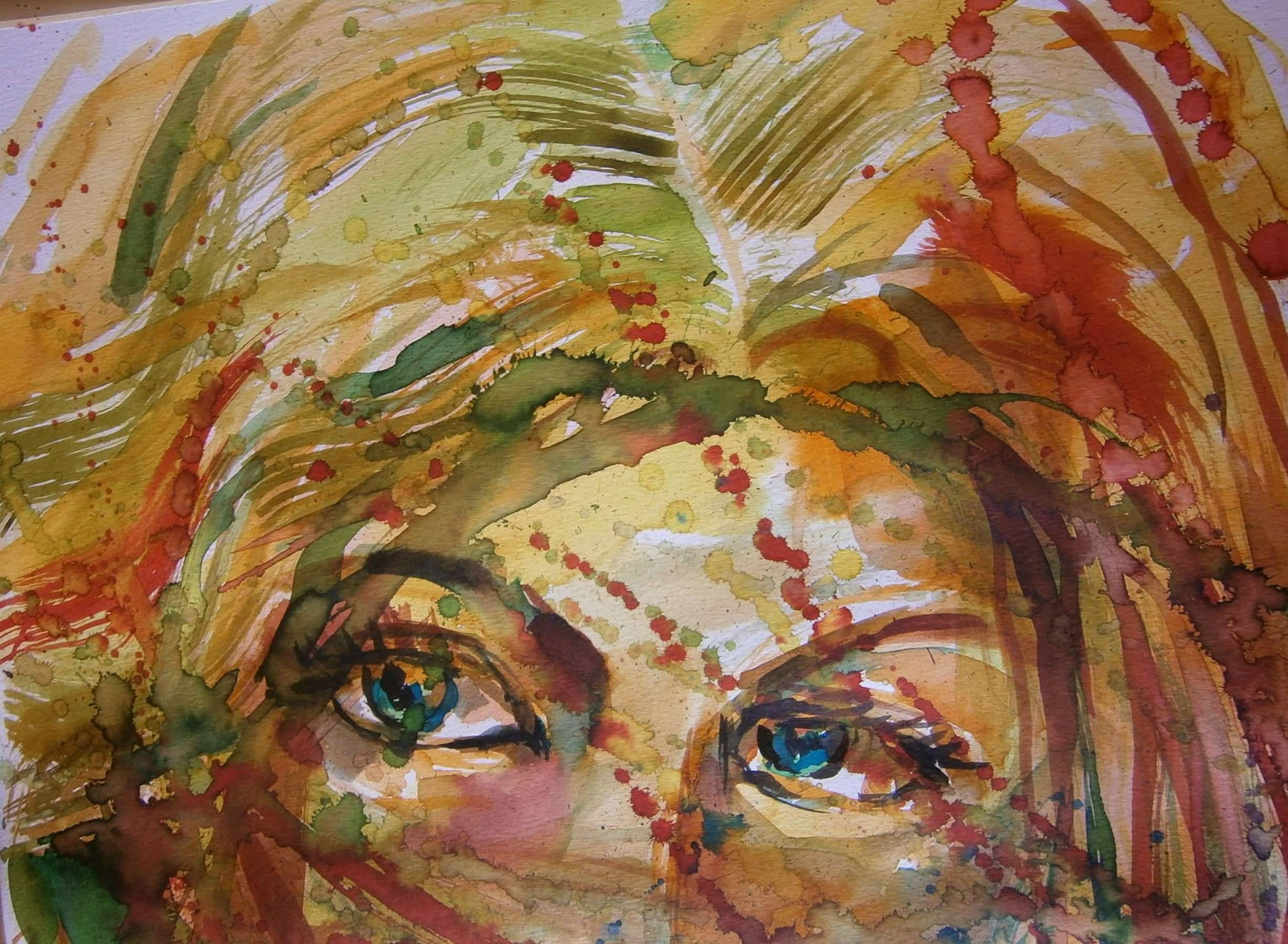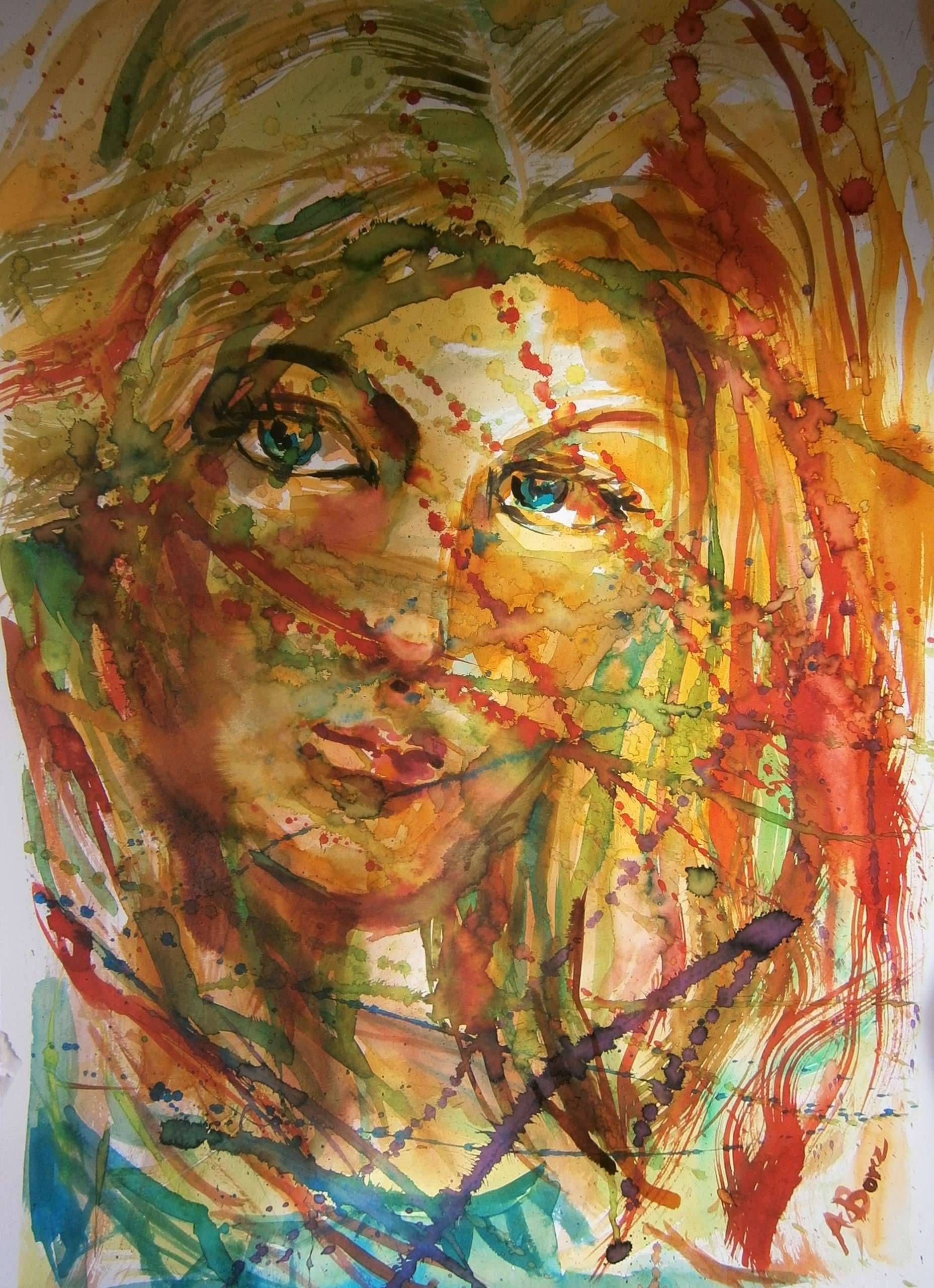 Piękny wizerunek kobiety o jasnych włosach i tajemniczym spojrzeniu. Obraz wykonany barwnymi tuszami i akwarelą , w oprawie passe- partout o wymiarach 100x70cm.