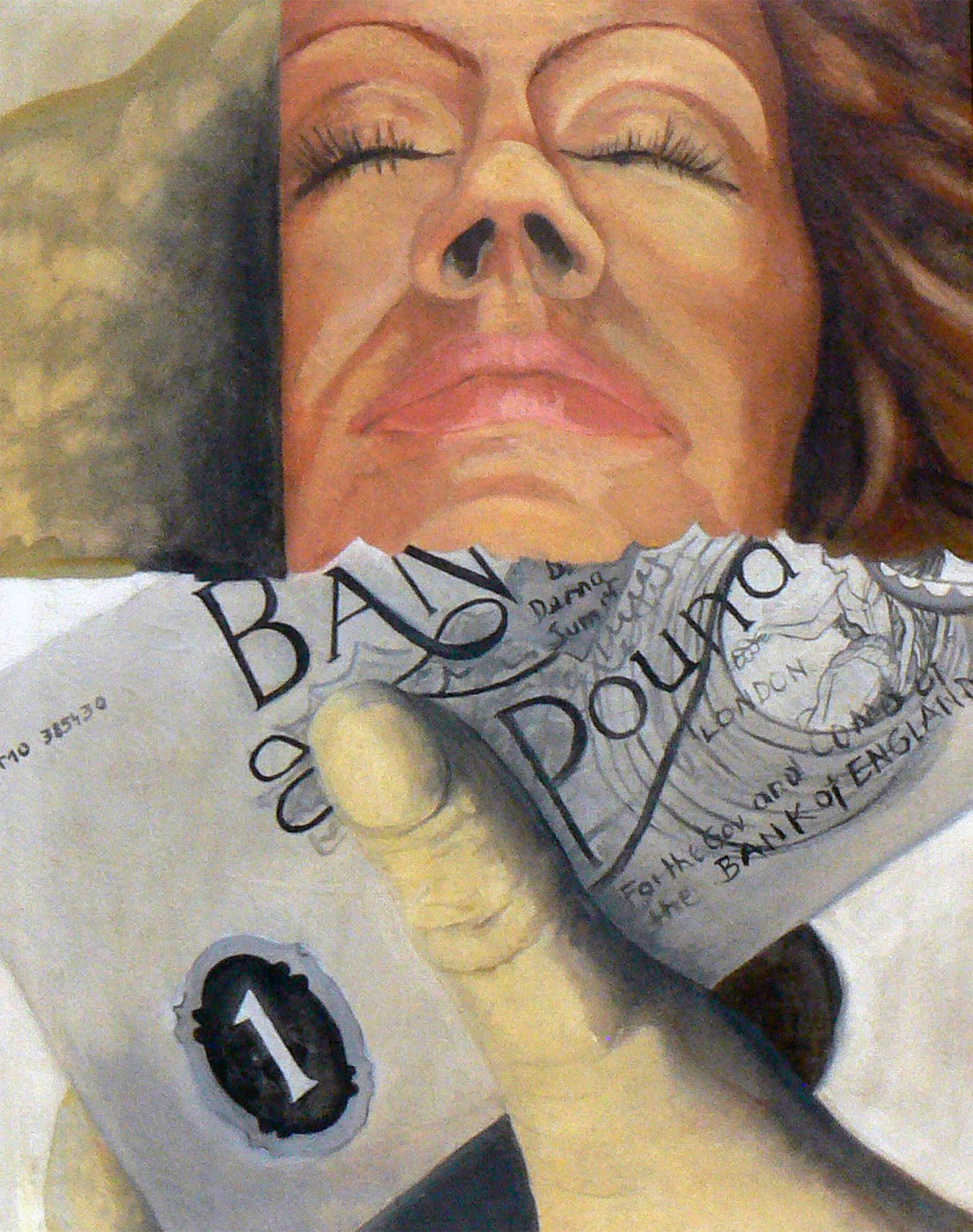 Obraz przedstawia twarz osoby z zamkniętymi oczami i spokojnym wyrazem, jakby odpoczywała w blasku słońca. Nad nią unosi się wyblakły banknot o delikatnych kolorach szarości i beżu, przypominający starą notę jednofuntową. Twarz jest namalowana w ciepłych odcieniach brązu i różu, co tworzy kontrast z zimnym, niemal monochromatycznym dołem kompozycji. W tle widać bardziej rozmyte kolory, co nadaje całości onirycznego wyrazu. Nastrój jest jednocześnie spokojny i tajemniczy, jakby próbował powiedzieć "take it easy", choć za pomocą ciszy. Artystycznie dzieło oscyluje między realizmem a surrealizmem, co można zobaczyć w precyzyjnie oddanych rysach twarzy oraz abstrakcyjnym przedstawieniu banknotu. Użycie technik mieszanych nadaje tej pracy głębię i wymusza refleksję nad wartościami materialnymi i duchowymi. "Dlaczego ta pani śpi z pieniążkiem?" - mogłoby zapytać dziecko. Ten obraz prowokuje do przemyśleń na temat relacji między spokojem wewnętrznym a zewnętrznym bogactwem. Patrząc na niego, niemal czuje się metaforyczny ciężar banknotu. To dzieło, które na długo pozostawiam w pamięci.