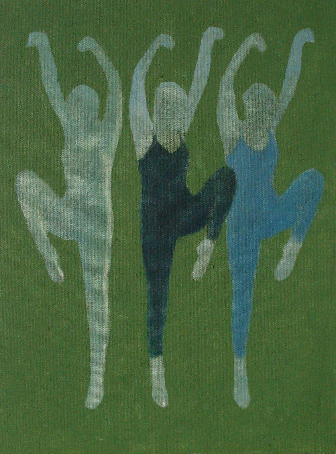 Na obrazie widzimy trzy sylwetki w dynamicznej, energicznej kompozycji, na tle intensywnie zielonej przestrzeni. Postacie, ubrane w różne odcienie niebieskiego, przybierają pozy pełne ruchu, jakby właśnie tańcząc w rytm niewidzialnej muzyki. Sylwetki przenikają się, tworząc efekt płynności i jedności. Ta dynamika nasyca obraz niezwykłą energią, ale zarazem emanacją spokoju. Co za kontrast! Artysta zastosował technikę malarską o subtelnych przejściach barw, tworząc wrażenie mgiełki otaczającej postacie. Te delikatne pociągnięcia pędzla dają wrażenie lekkości, jakby figury były unoszone w powietrzu. Styl obrazu wskazuje na inspiracje impresjonizmem, gdzie kluczowe są emocje i ruch zatrzymany w czasie. Wow, right? Obraz może wywoływać wiele emocji. Dla mnie to przypomnienie o wolności i radości bycia tu i teraz. Dla dziecka może to być trochę jak zabawa z wyobraźnią — te postacie wyglądają, jakby bawiły się w chowanego w zielonym świecie. A może próbują dotknąć chmur? Obserwując tę pracę, można poczuć się częścią tego niekończącego się tańca życia. Nieidealne krawędzie i miękkie linie przypominają nam, że życie nie zawsze musi być ostre i precyzyjne. Może wystarczy po prostu... zatańczyć.