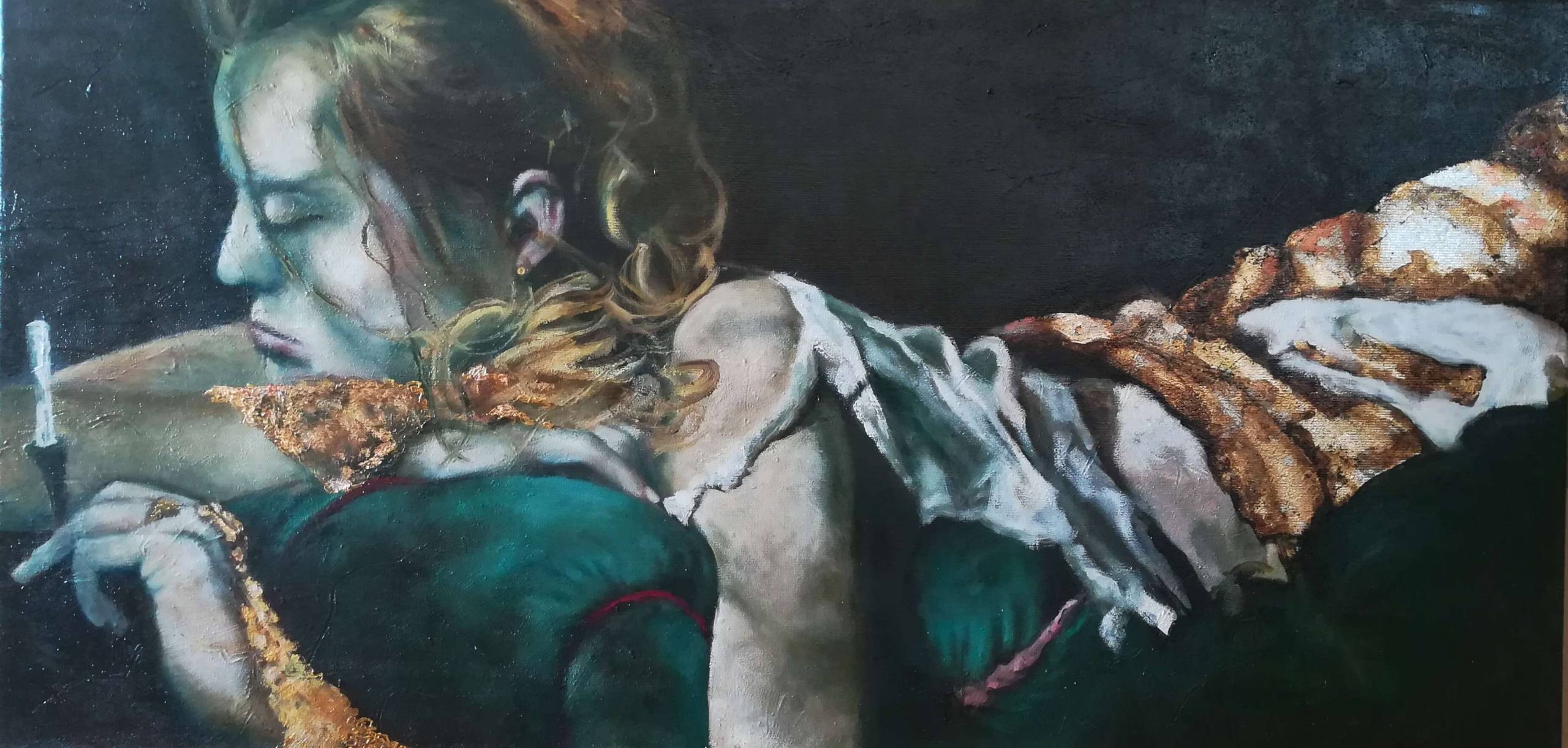Obraz przedstawia postać o wyrazistych kształtach, z unoszącymi się delikatnie włosami w odcieniach złota. Tło jest ciemne, co dodaje dziełu głębi i tajemniczości. Wydaje się, jakby unosiła się w chwili refleksji, przy czym jest otoczona bogactwem tekstur. Kolorystyka, dominująca w tonacjach zieleni i bieli, przełamana jest akcentami złota, co nadaje kompozycji elegancji. Nastrój jest melancholijny, ale jednocześnie pełen spokoju. Artysta zastosował technikę, która sprawia, że obraz wydaje się niemal dotykalny. Warstwy farby tworzą efekty trójwymiarowe, a szczegółowość ukazuje ogromne zaangażowanie w detale. To wrażenie, jakby zanurzyć się w inny świat. Emocje, które może wywoływać u odbiorcy, to mieszanka zadumy i podziwu. Dziecko powiedziałoby: "To obraz pani, która marzy". Dzieło balansuje między rzeczywistością a czymś ulotnym. Zastanawia mnie, co kryje się w jej myślach. W języku angielskim powiedziałbym, że obraz jest truly captivating. Czyż to nie piękne, jak sztuka potrafi mówić do nas każdym oddechem koloru?