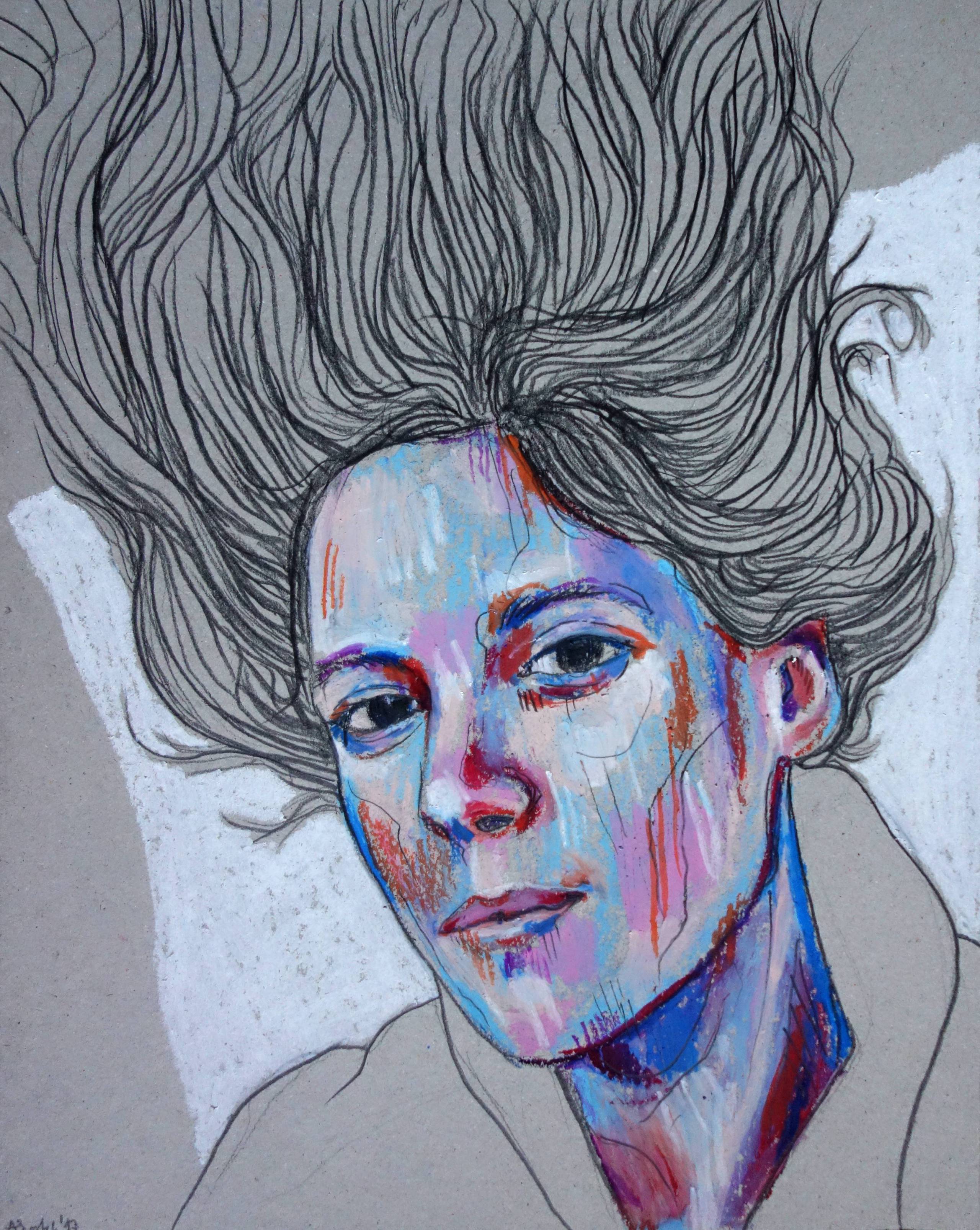 Rysunek wykonany na tekturze pastelami olejnymi i ołówkiem.