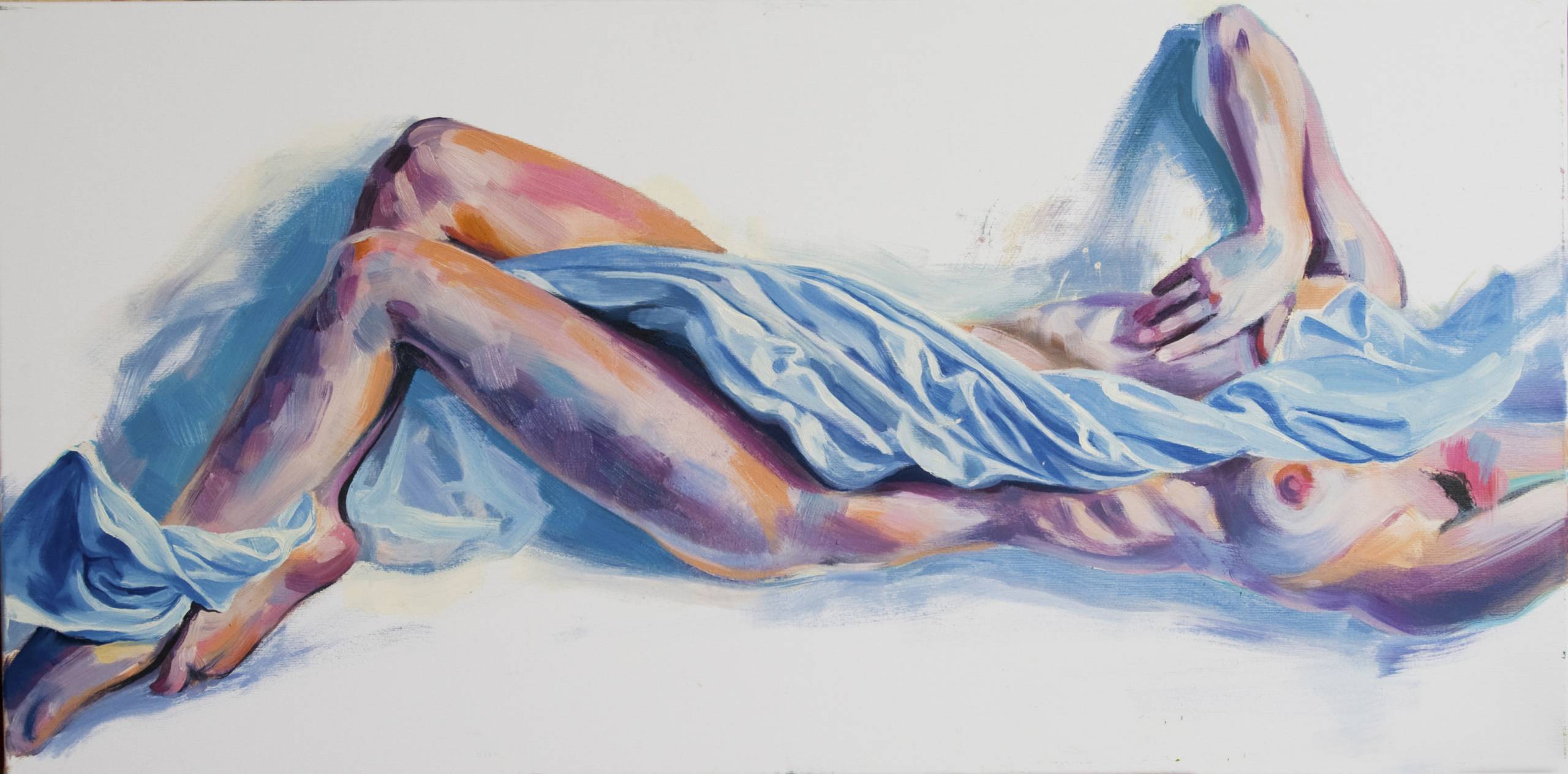 Obraz przedstawia ekspresyjną kompozycję pastelowych barw, dominują błękity i różowe odcienie nadające całości lekkość i delikatność. Figura kobiety, owinięta błękitną tkaniną, zajmuje centralne miejsce, a dynamika jej pozy przyciąga wzrok. Przeplatające się pociągnięcia pędzla nadają teksturę, przez co tkanina wydaje się falować jak gentle ocean waves. Technika malarska ujawnia impresjonistyczne wpływy poprzez swobodne pociągnięcia i subtelne cieniowanie. Atmosfera obrazu jest spokojna, a jednak pełna subtelnej energii, jakby czas na chwilę zatrzymał się w idealnym momencie bezruchu. W pracy tej można dostrzec pewną intymność i wrażliwość. Skłania do refleksji nad pięknem ludzkiego ciała w jego naturalnej formie. Dla mnie, to takie uczucie, jakby patrzeć na spokojne morze o poranku. Kompozycja zdaje się opowiadać historię ukrytą w skrzyżowanych liniach i miękkich, płynnych ruchach. Jeden z moich ulubionych elementów to zestawienie chłodnych tonów z ciepłym odcieniem skóry, które dodaje żywotności całej scenie. Mój pies też lubi patrzeć na obrazki z kolorami. Elementy te razem tworzą wyrazisty, ale zarazem delikatny efekt, który można by określić jako artystyczną harmonię.
