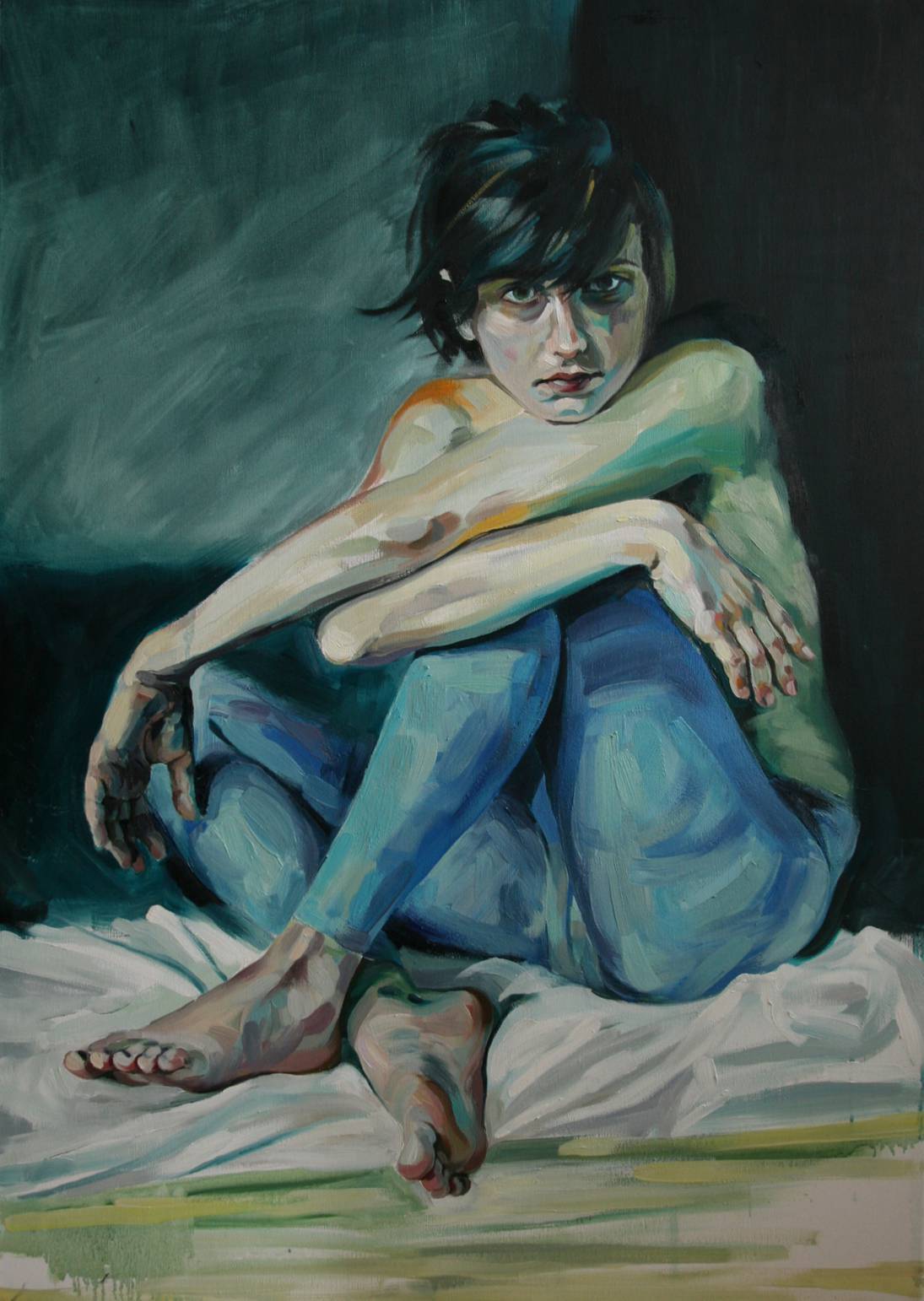 Obraz przedstawia młodą postać, siedzącą z nogami przyciągniętymi do ciała, osadzoną na miękkim, białym tle. Dominująca paleta kolorów oznacza odcienie zieleni, błękitu i pastelowych tonów, które tworzą dream-like wrażenie. Wyraz twarzy osoby – pełen zamyślenia i niepokoju – przyciąga wzrok i zachęca do refleksji. Pędzle artysty poruszają się dynamicznie, nadając postaci fakturę i trójwymiarowość. Technika jest malarsko malarska, z dużą ilością warstw, co dodaje głębi kompozycji. Atmosfera obrazu jest melancholijna, pełna nieuchwytnej tęsknoty. Patrząc na te oczy, można poczuć się, jakbyśmy zaglądali w zakamarki własnych myśli. Kompozycja jest przemyślana, a sposób ułożenia nóg i rąk sugeruje wewnętrzne napięcie, jakby ukryty strach lub niepewność. Stylistycznie artysta łączy realizm z subtelnym surrealizmem, co sprawia, że obraz trudno oderwać od niego wzrok. Dziecko mogłoby powiedzieć: "Ten pan wygląda smutno, tak jak wtedy, gdy nie ma się przyjaciół do zabawy". Opis ten pobudza emocje, zmuszając do myślenia o samotności i potrzebie bliskości. Czy odnajdujemy w tym obrazie swoje własne zagubione chwile? Daje też do myślenia nad kruchością ludzkiej egzystencji — what does it mean to be alone? Ostatecznie, w tym dziele tkwi nieodparty urok, który zarówno przyciąga, jak i intryguje.