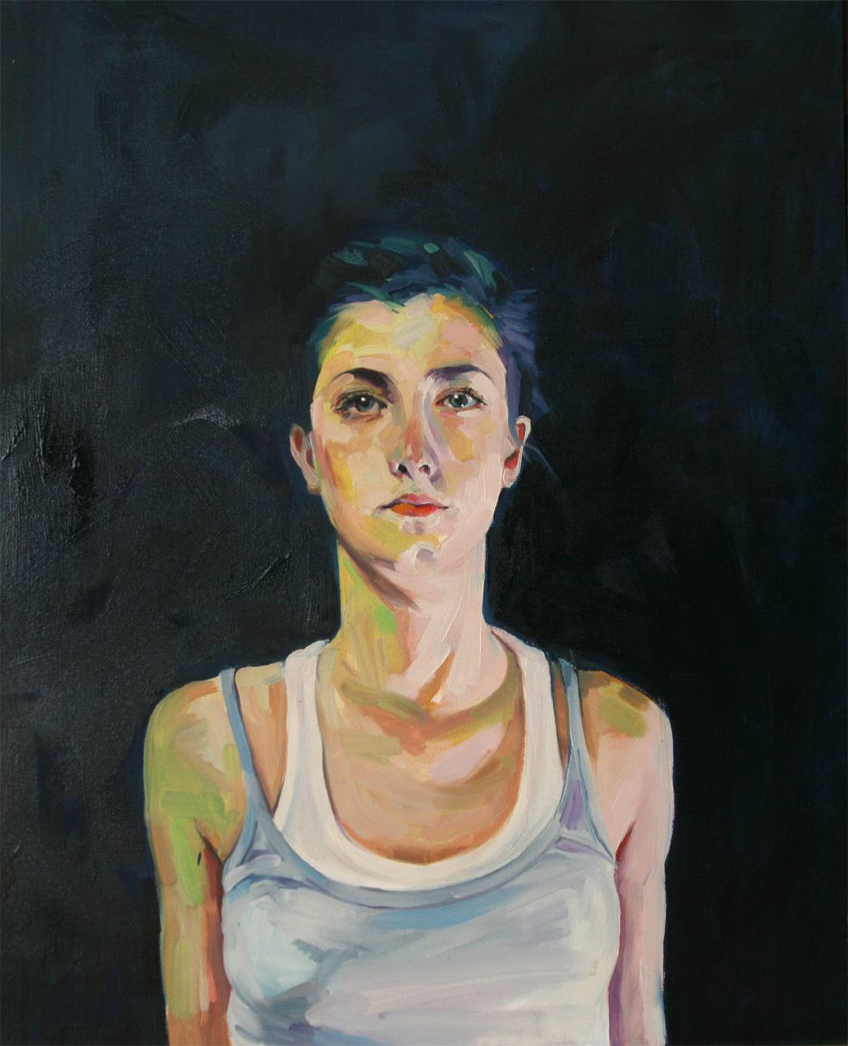 Na obrazie widzimy młodą kobietę na tle głębokiej czerni. Jej twarz przyciąga uwagę, jest świetnie oświetlona, co kontrastuje z ciemnym tłem. Kolory są tu dosyć nietypowe: zielonkawe i żółtawe refleksy kładą się na skórze, jakby malarz bawił się światłem. Ta gra kolorów i cieni dodaje obrazowi dynamiki, chociaż kobieta stoi w spokojnej pozie. Atmosfera jest zamyślona, niemalże refleksyjna. Może to spokój przed burzą, a może chwila wytchnienia. Styl wydaje się być ekspresjonistyczny, te pociągnięcia pędzla są takie odważne! Techniki, które widać, to impastowe nałożenie farby, wyczuwalne niemal teksturą. Wydaje się, że artysta przemieszał emocje z technicznym mistrzostwem. Obraz może wywołać u widza poczucie spokoju, ale i ciekawości. Dlaczego patrzy prosto przed siebie? Czy to smutek, czy zaduma? It's intriguing. Myślę, że dziewczyna mogłaby być bohaterką własnej historii, pełnej sekretów. Zaraz się rozpłaczę, ale nie wiem dlaczego, po prostu tak jakoś jest. Dziecko powiedziałoby: ta pani ma na sobie białą koszulkę! Proste, prawda? Obraz jest fascynujący w swej prostocie i głębi jednocześnie.