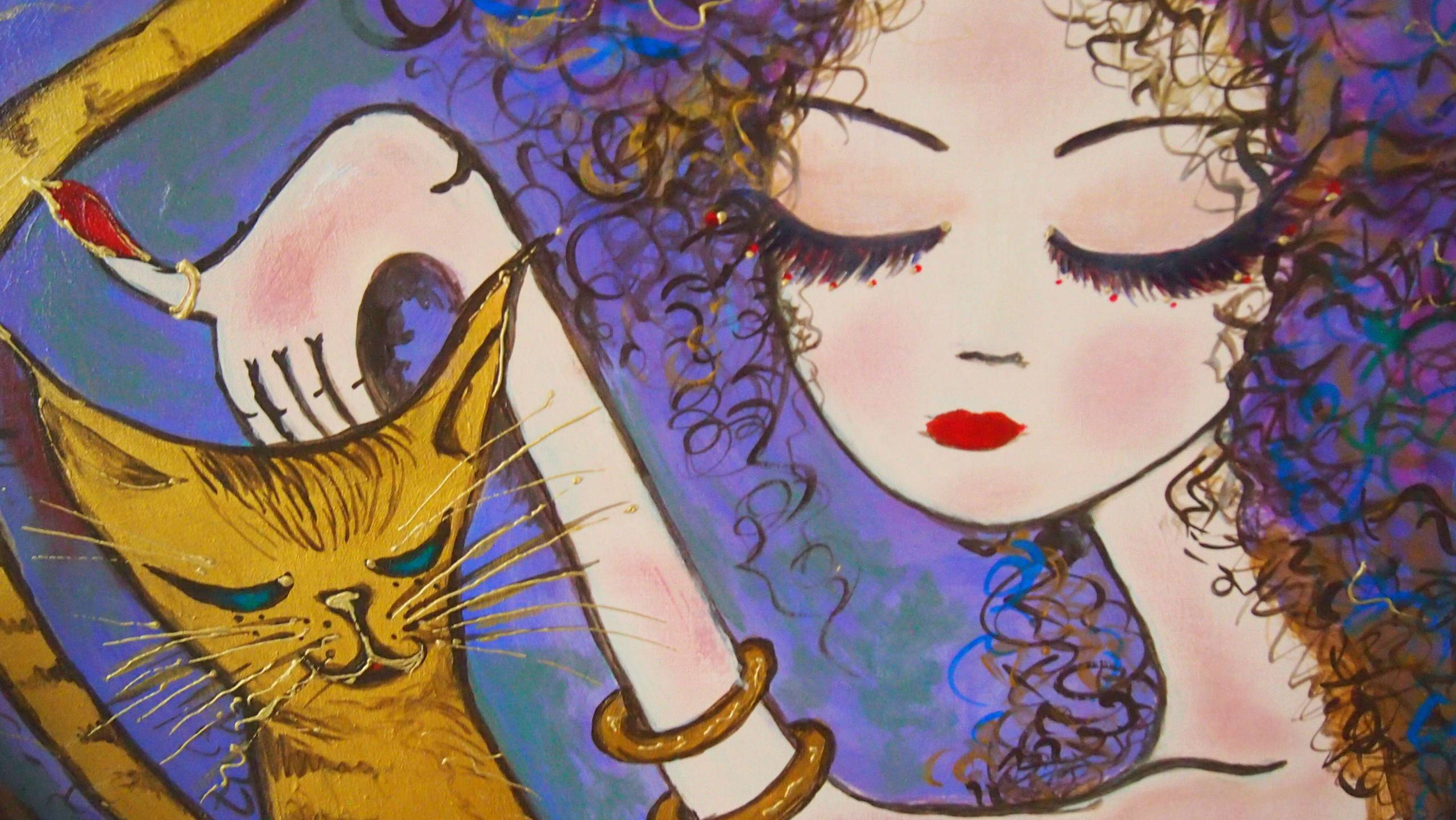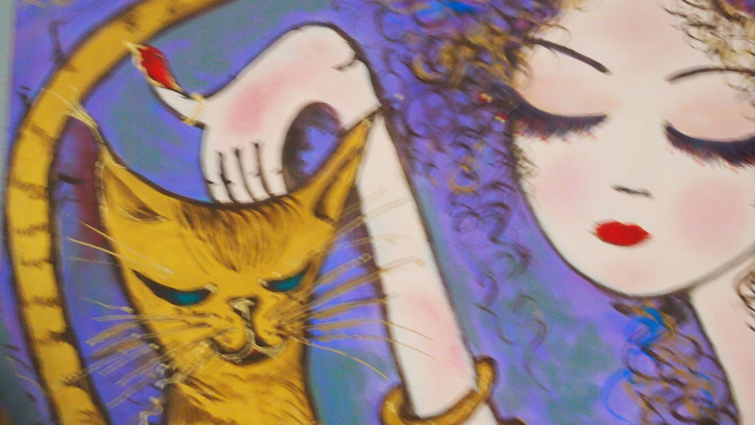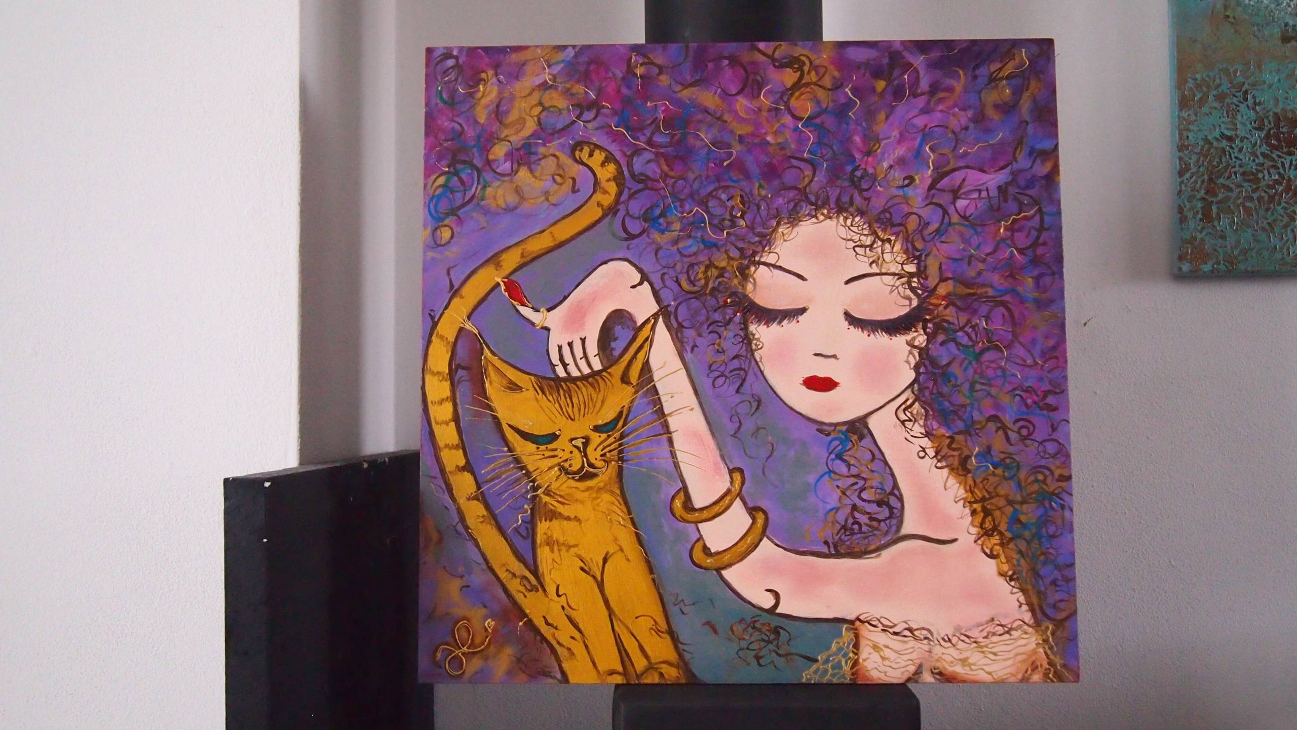 Lawendowa postać ze złotym kotem. Inspirowane poezją: Lawenda W roziskrzone oczy patrzy kołysząc się w słońcu i z ciepłym zefirem marzy lawenda pełna miodu... Tęskne spojrzenia posyła biorąc miłość w ramiona, za lekka, z wiatrem jej ubywa a pomimo to pokorna... Nieśmiałość kwiatu pokonuje właściwym aromatem i tysiącem niebieskich płatków kocha się z babim latem... Aleksandra Baltissen Praca z użyciem złotej farby.