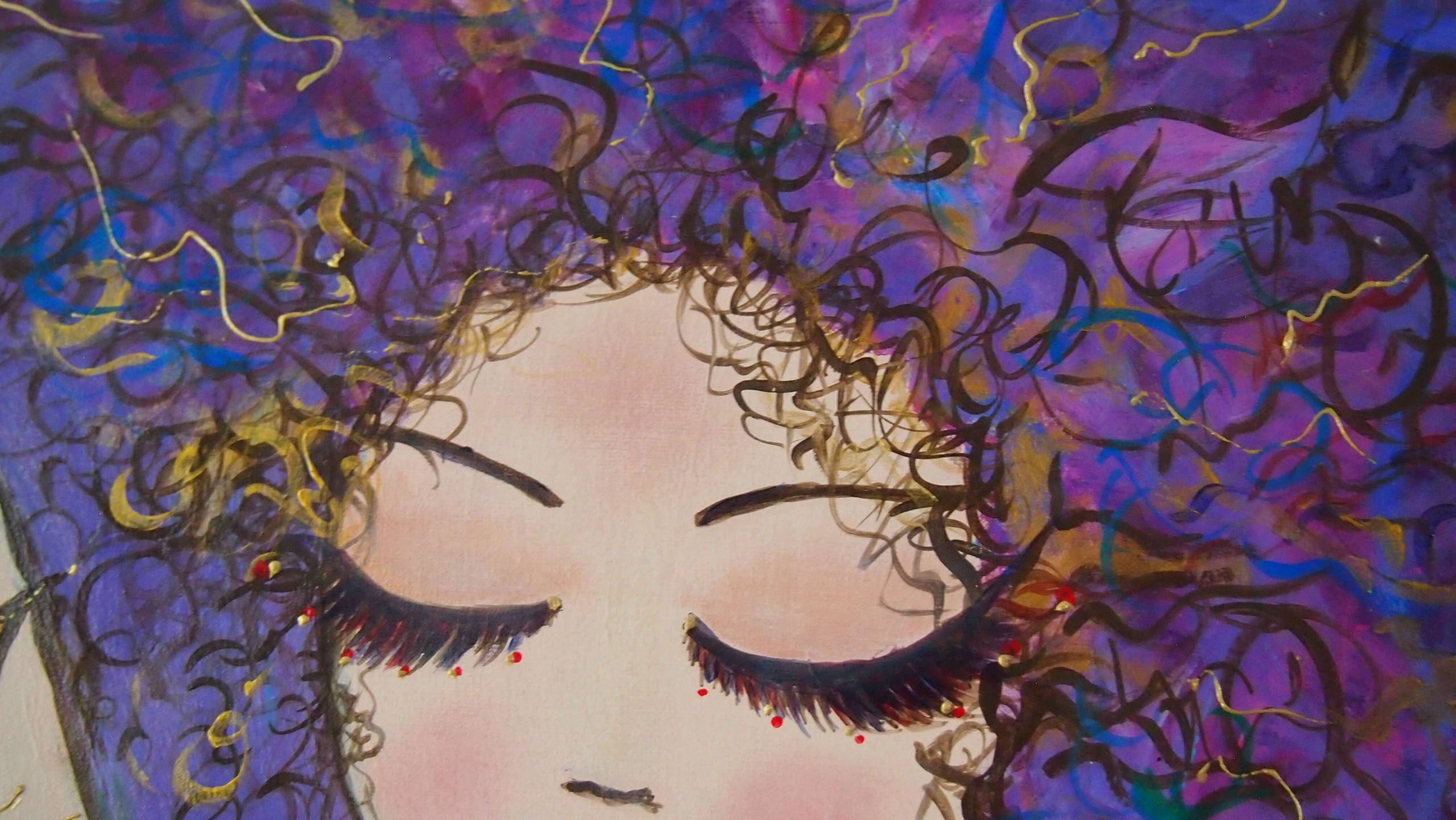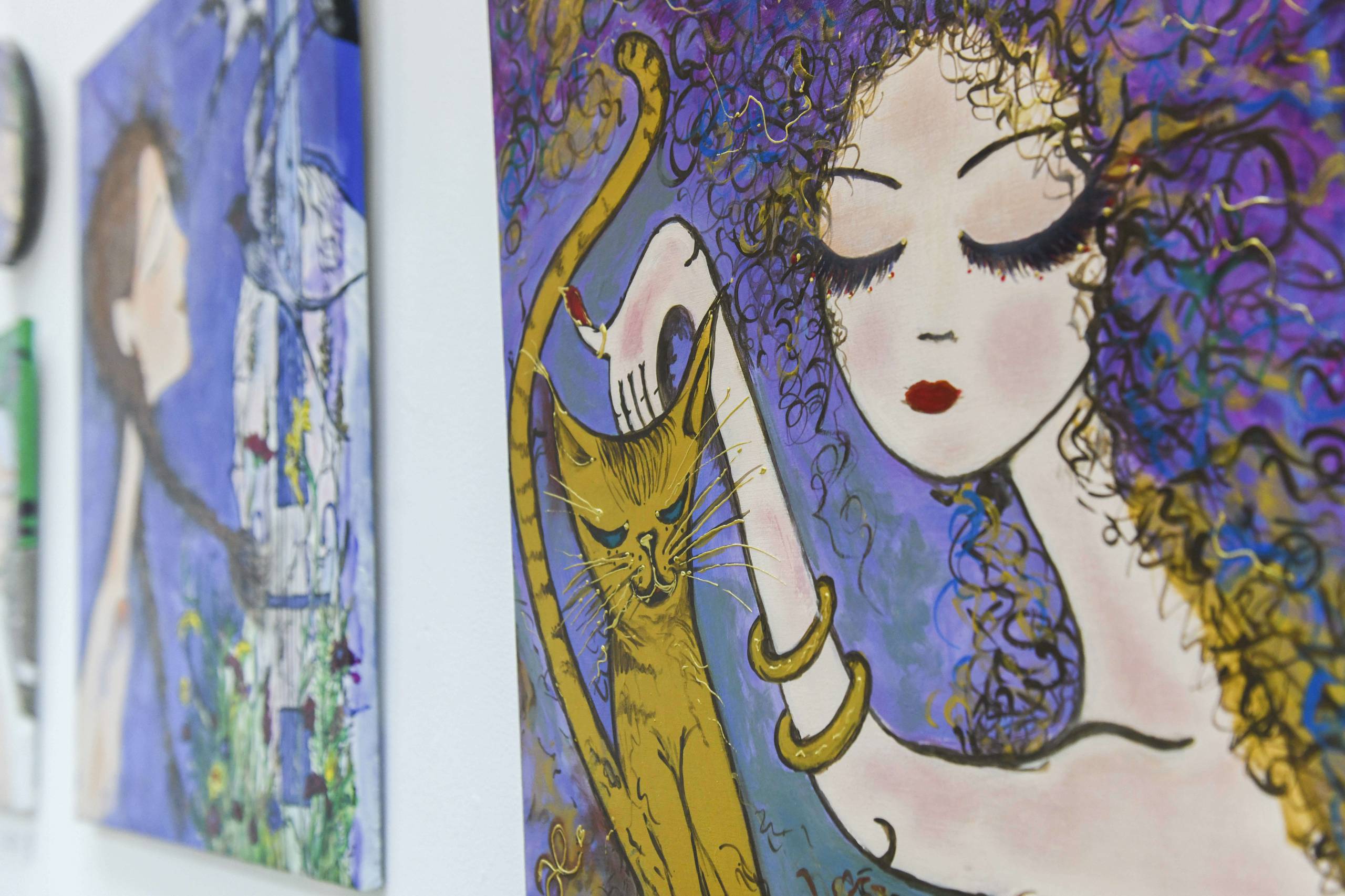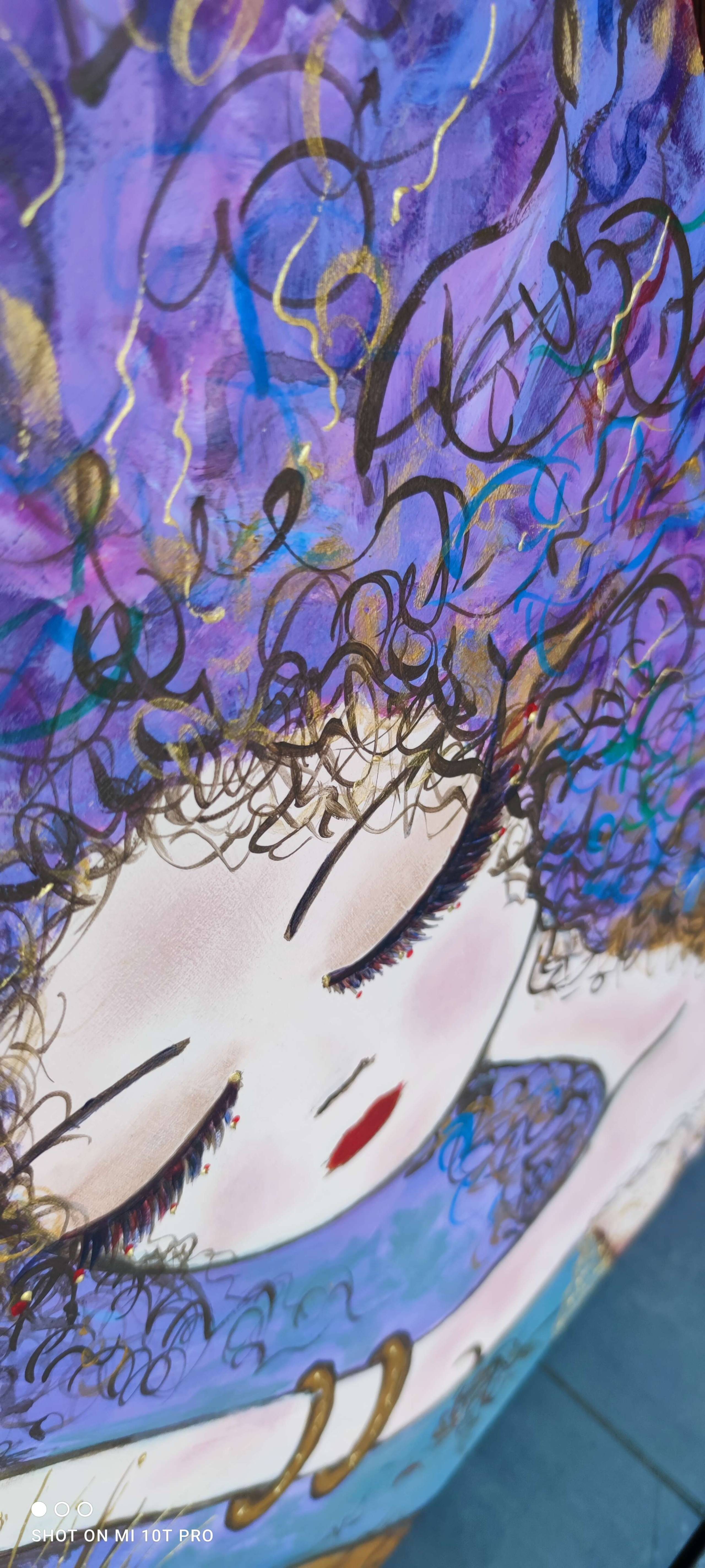 Lawendowa postać ze złotym kotem. Inspirowane poezją: Lawenda W roziskrzone oczy patrzy kołysząc się w słońcu i z ciepłym zefirem marzy lawenda pełna miodu... Tęskne spojrzenia posyła biorąc miłość w ramiona, za lekka, z wiatrem jej ubywa a pomimo to pokorna... Nieśmiałość kwiatu pokonuje właściwym aromatem i tysiącem niebieskich płatków kocha się z babim latem... Aleksandra Baltissen Praca z użyciem złotej farby.