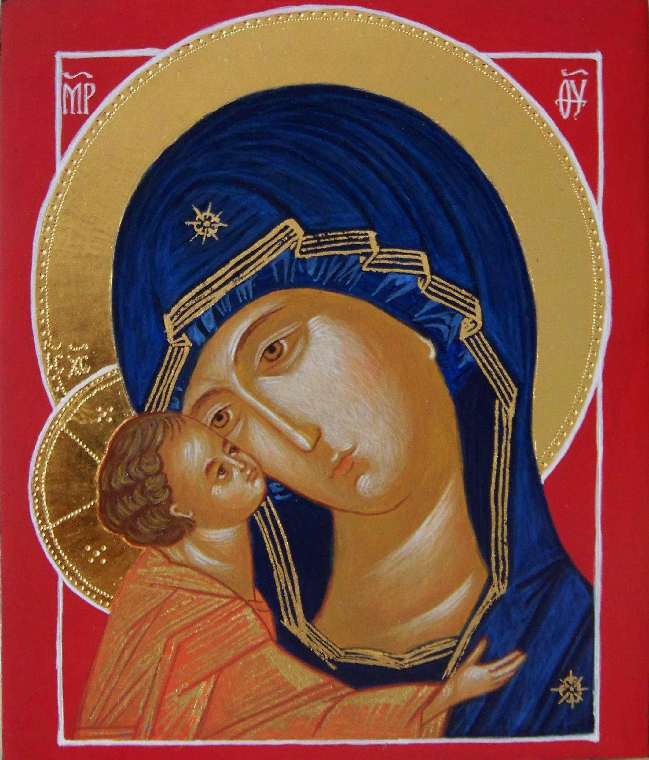 Ikona Matki Boskiej Eleusa- czule tuląca dzieciątko. Deska lipowa, grunt klejowo kredowy, tempera jajceczna, złoto 24ct (złocenia nimbów i szat)