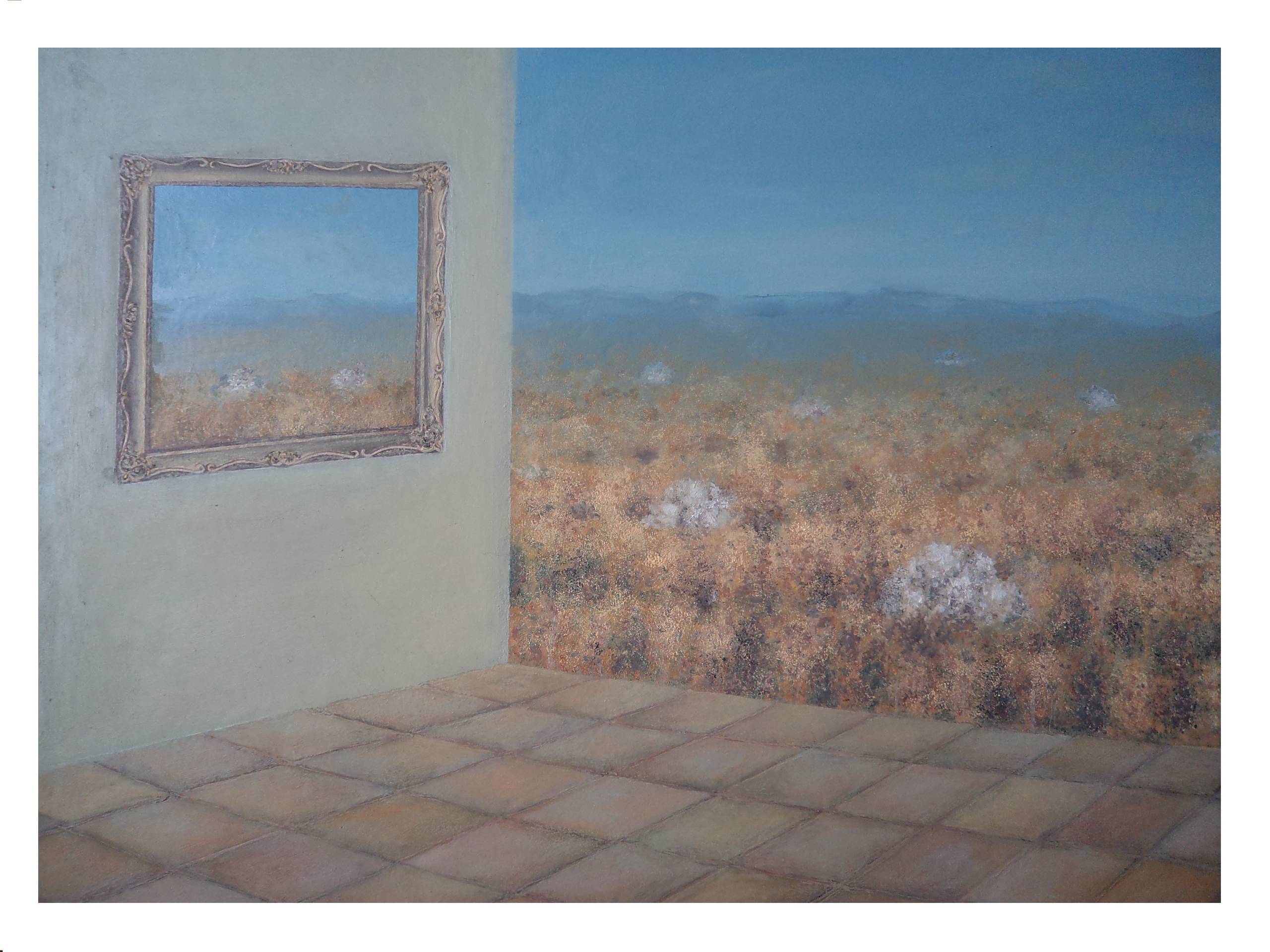 Obraz przedstawia intrygującą kompozycję wnętrza połączonego z pejzażem. Na pierwszym planie widzimy jasne, kaflowe podłoże – niemal jak z hiszpańskiej willi. Ściana w kolorze bladego zielonego, na której wisi ozdobna ramka, stanowi kontrast dla reszty kompozycji. Ramką, paradoksalnie, nie jest dzieło sztuki, lecz okno wychodzące na rozległy krajobraz. Przestrzeń za nią przyciąga oko różnobarwnym mixem niebieskości nieba i ciepłych ziemistych barw pola. Artysta bawi się percepcją, tworząc iluzję okna. Czy to nie jest cool? Styl obrazu zdaje się być na pograniczu surrealizmu. Użycie delikatnych przejść tonalnych podkreśla mistyczność dzieła. Całość emanuje spokojem i kontemplacją, choć w pewien sposób przemyca uczucie izolacji. Tak, jakby natura i człowiek były od siebie oddzielone cienką granicą. The picture makes me feel a bit curious, what's really outside. To obraz, który pobudza wyobraźnię, zachęca do snucia własnych opowieści. Można wręcz poczuć lekki powiew wiatru zza otwartego okna. Używanie delikatnej palety barw potęguje stonowany nastrój. Chociaż może wywoływać różnorodne emocje – od nostalgii po marzenia o przygodzie. Jest w tym coś magicznego, taka chwila zatrzymana na granicy rzeczywistości.
