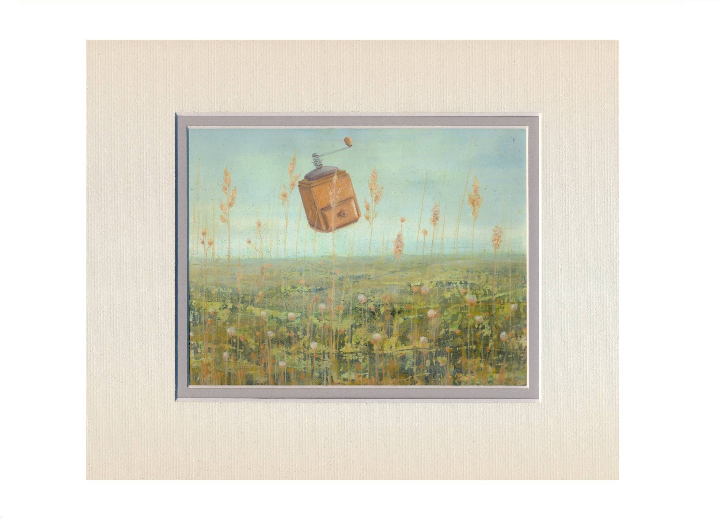Na obrazie widzimy krajobraz pełen delikatnych, pastelowych barw. Dominują zielenie i błękity, a na ich tle wyróżnia się ciemnobrązowy młynek do kawy, unoszący się w powietrzu. Jego detalicznie przedstawiona forma kontrastuje z miękkością tła. Artysta wybrał subtelną, impresjonistyczną technikę, co nadaje dziełu lekkości i ulotności. Atmosfera jest nieco surrealistyczna, jakby czas się zatrzymał, a zwykłe przedmioty zyskały magiczną moc. Na pierwszy rzut oka obraz wydaje się spokojny, ale młynek w powietrzu dodaje nuty niepewności i zaskoczenia. Kto by pomyślał, że zwykły młynek może tak inspirować. Styl artysty przyciąga uwagę swoją wyjątkową grą światła i cieni, co podkreśla tajemniczość dzieła. A może ten młynek to symbol marzeń, które są na wyciągnięcie ręki? Kwiaty na łące zdają się szeptać tajemnice. A ja myślę — co by było, gdyby świat naprawdę tak wyglądał? Może to tylko "dream" świata, w którym codzienność łączy się z magią. Jakbym tam był, chciałbym dotknąć tej chwili.