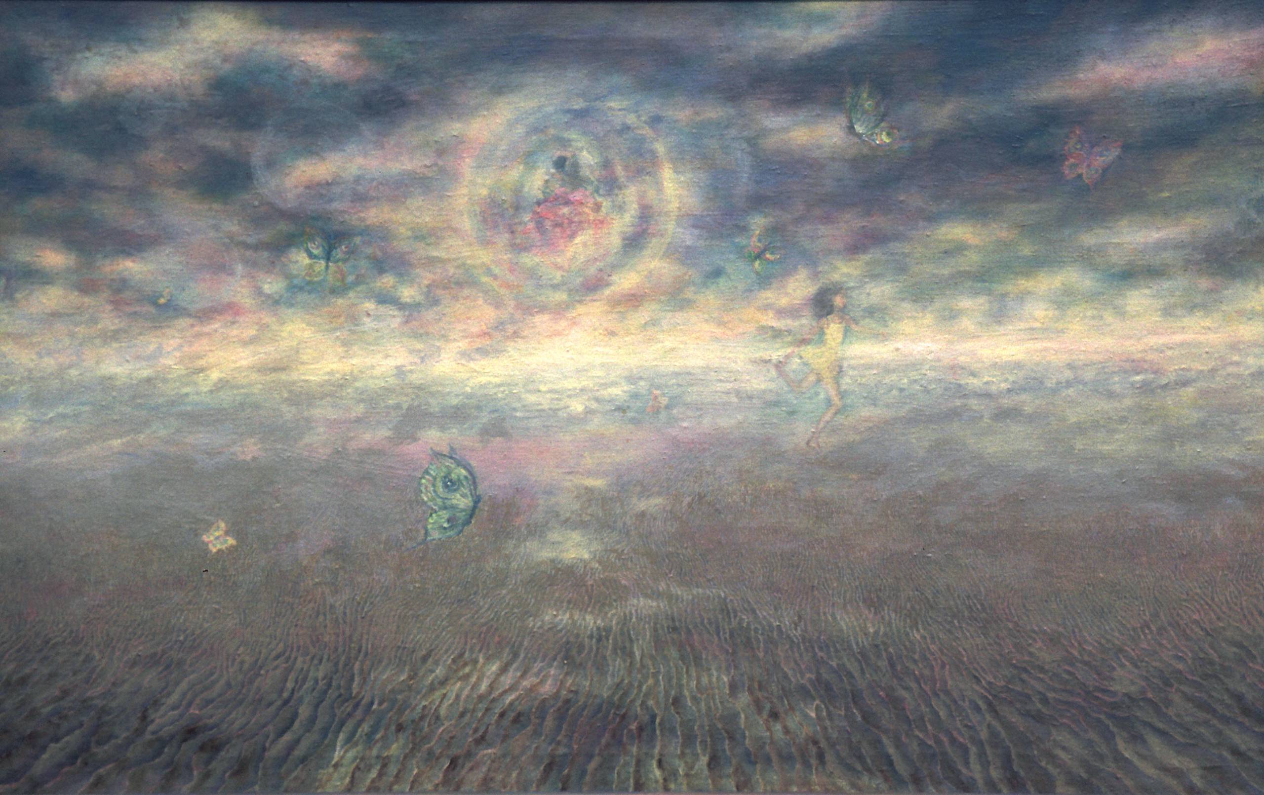 Obraz pełen jest delikatnych, pastelowych kolorów, które tworzą niemal mglistą kompozycję. Dominuje chłodna paleta niebieskich i szarych odcieni, chociaż gdzieniegdzie prześwitują cieplejsze barwy jak róż i żółć. Kształty są zamglone, nic nie jest ostre ani wyraźne, co dodaje całości tajemniczości. Wyczuwalna jest atmosfera spokoju i marzycielskiego klimatu. Styl obrazu można by opisać jako dreamlike - nieco rozmyty, jakby pochodził z krainy snów. Artysta zastosował subtelną technikę mieszania farb, tworząc efekt niejednoznaczności. To tworzy wrażenie, jakby scena zwalniała czas, zatrzymując chwilę. Moje dziecko powiedziało: "To wygląda jak bajka, mamo!" To niewinność, którą można odczytać w tych ulotnych kształtach motyli unoszących się wokół sylwetki postaci. Obraz wywołuje uczucie spokoju, ale też lekkiej tęsknoty za czymś nieuchwytnym. Może skłaniać do refleksji nad ulotnością chwil i naturą rzeczywistości. Osobiście, przypomina mi chwile zanurzenia w marzeniach na jawie. Obraz wydaje się zagadką, której rozwiązanie nie jest oczywiste, ale fascynuje i przyciąga swoją subtelnością.