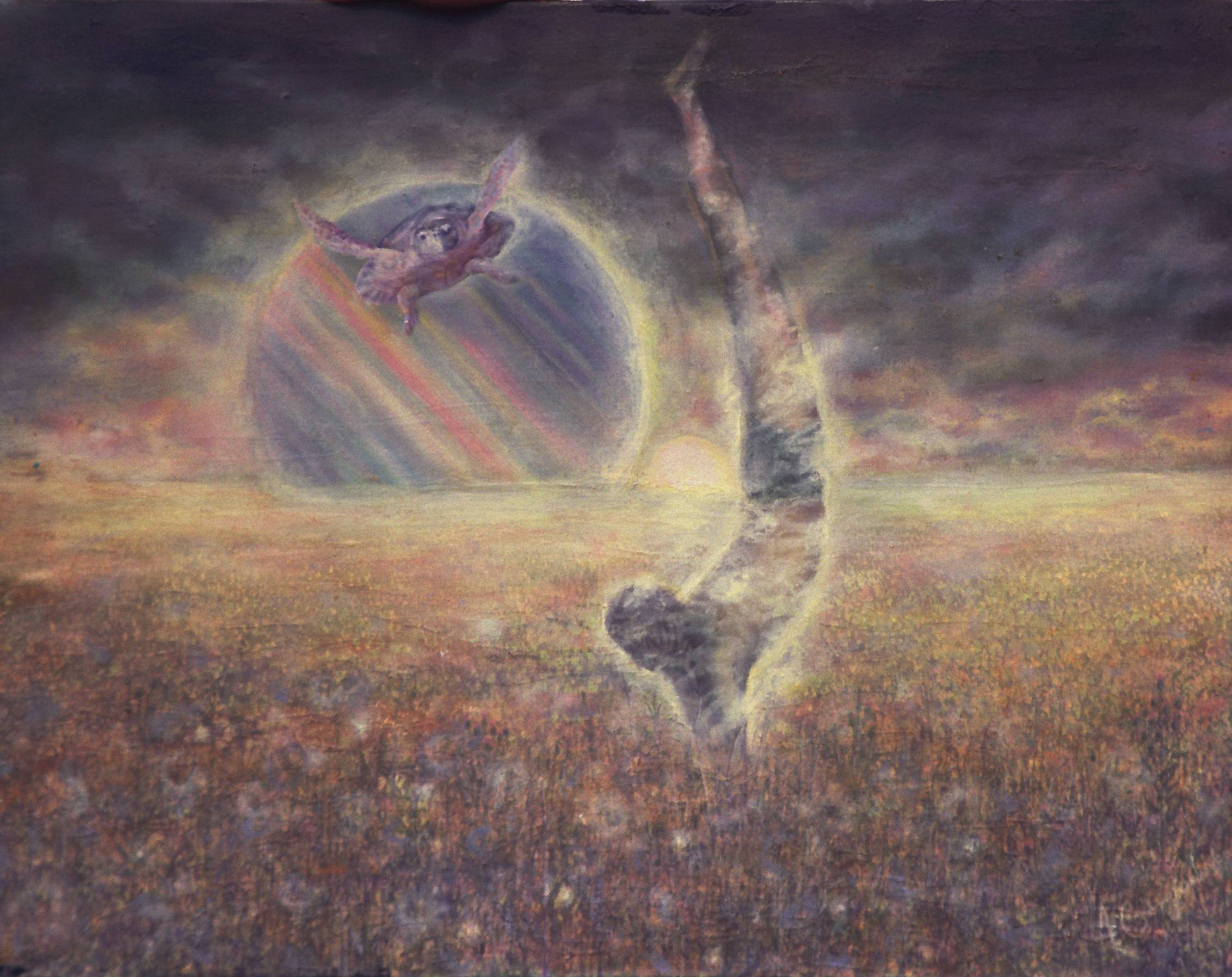 Na obrazie widać fascynującą scenę, gdzie niebo, zdominowane przez ciężkie chmury i wibrujące barwy zachodu słońca, zderza się z tajemniczym polem pełnym kolorowych kwiatów. Na pierwszy plan wysuwa się sylwetka nurkującej postaci, która zdaje się być wykonana z samego światła, a jej kontury migoczą jakby były żywym płomieniem. Nad nią unosi się majestatyczna sowa, a wokół niej krążą tęczowe smugi, które przypominają nieziemski "portal" do innego świata. Atmosfera obrazu jest magiczna i pełna niedopowiedzeń. Czuć pewną tajemniczość i spokój, ale jednocześnie coś, co przypomina mgnienie napięcia. Artysta eksperymentuje z grą światła i cienia, używając techniki malowania, która łączy impresjonizm z surrealizmem, tworząc dreamlike pejzaż, który zatrzymuje na chwilę dech w piersiach. Obraz może wywoływać w odbiorcy uczucie zachwytu i enigmatycznej refleksji. Może zastanawiamy się nad istotą człowieka i zwierząt w kontekście natury i kosmosu. Czy to niebo, czy jakaś magiczna kraina? To pytanie, które zadałby pewnie każdy maluch z dziecięcą ciekawością. Emocje tu płyną szerokim strumieniem, dając nam moment na oddech i spontaniczne think. Patrząc na to piękno, myślę o tym, jak często umyka nam magia codzienności. To są chwile, które przypominają, jak ważne jest, żeby zatrzymać się i po prostu spojrzeć, zobaczyć więcej niż to, co widać na pierwszy rzut oka.