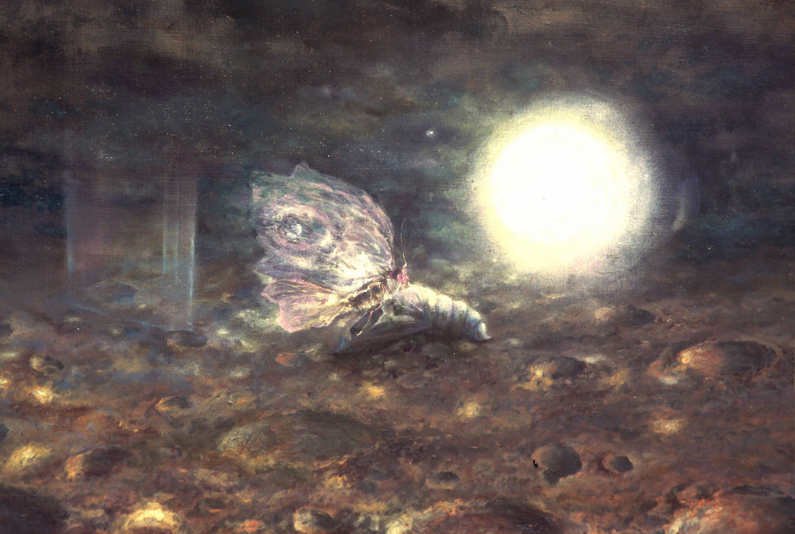 Obraz przedstawia scenę pełną magii i subtelnych kontrastów. Dominują tu ziemiste, brunatne odcienie, które zyskują życia dzięki jasnemu kręgowi światła przypominającemu księżyc. Ten element przyciąga wzrok i tworzy centrum kompozycji, wokół którego rozgrywa się zmienne światło i cień. Po prawej widoczny jest motyl, którego skrzydła zdają się drgać w blasku, malowane delikatnymi pociągnięciami pędzla, które podkreślają ich eteryczność. Całość obrazu owiana jest tajemniczą, niemal oniryczną atmosferą. Można niemal poczuć ciszę tego miejsca, przerywaną tylko delikatnym szelestem skrzydeł. Artysta zastosował technikę przypominającą impresjonizm, gdzie plamy koloru tworzą złudzenie lekkości i ruchu. Jest w tym coś niespokojnego, jakby chwila zamrożona w czasie. Czujesz takie gentle touch on your heart. To dzieło może wywoływać wiele różnych emocji. Dla jednych będzie to poczucie spokoju i ukojenia, dla innych nostalgia czy nawet melancholia. Patrząc na nie, można się zastanawiać nad cyklem życia, delikatnością istnienia. A może to po prostu marzenie małego dziecka, które patrzy na księżyc i wyobraża sobie, że motyl potrafi tam dolecieć. Wow, ale piękne motylek! Obraz pobudza wyobraźnię, skłaniając do osobistych refleksji.