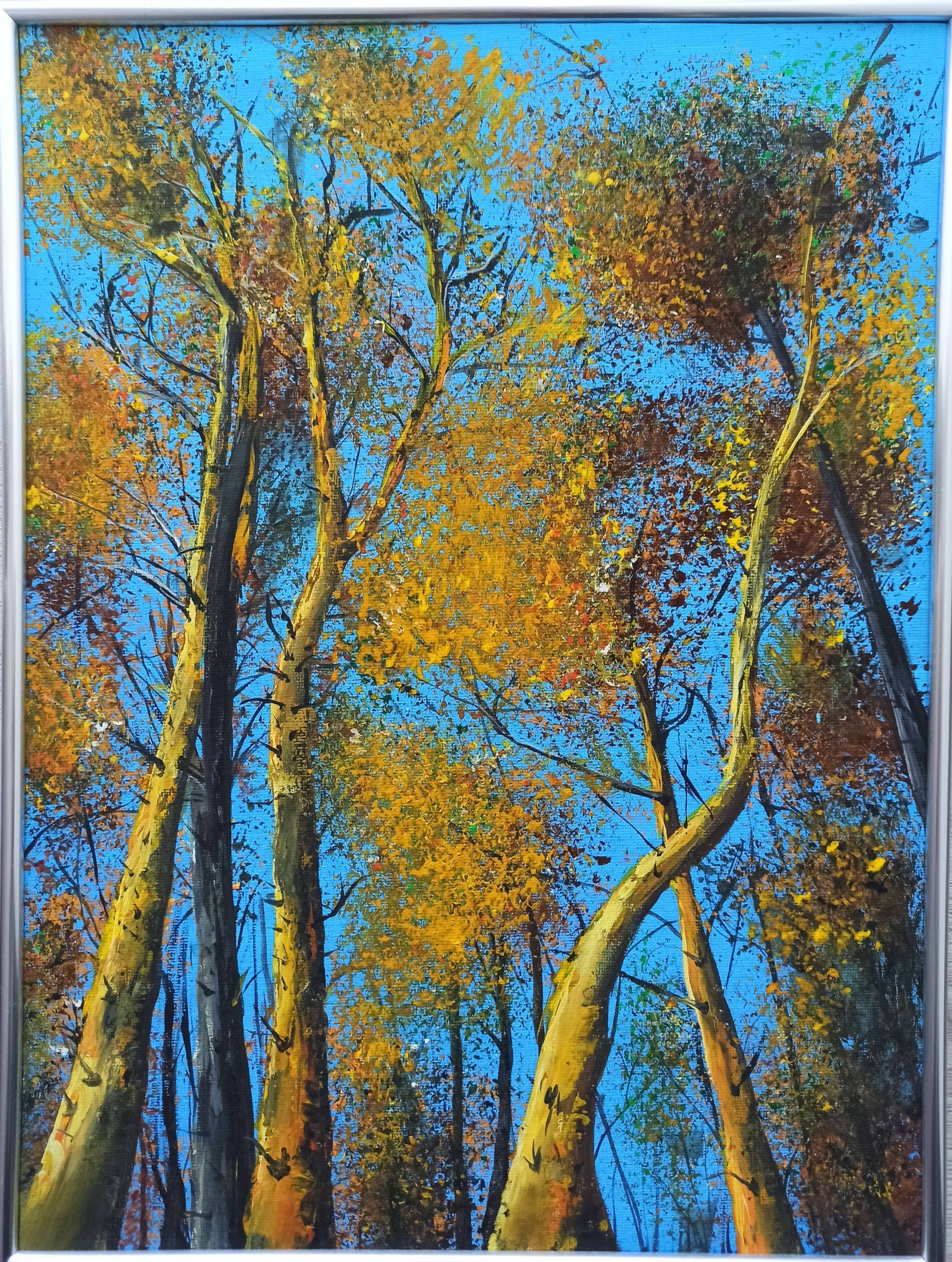 "Leżąc na ściółce leśnej" Obraz malowany gwaszaem na płycie malarsiej o soczystych barwach i czarującym błękicie nieba. Praca oprawiona w delikatną srebrną ramę