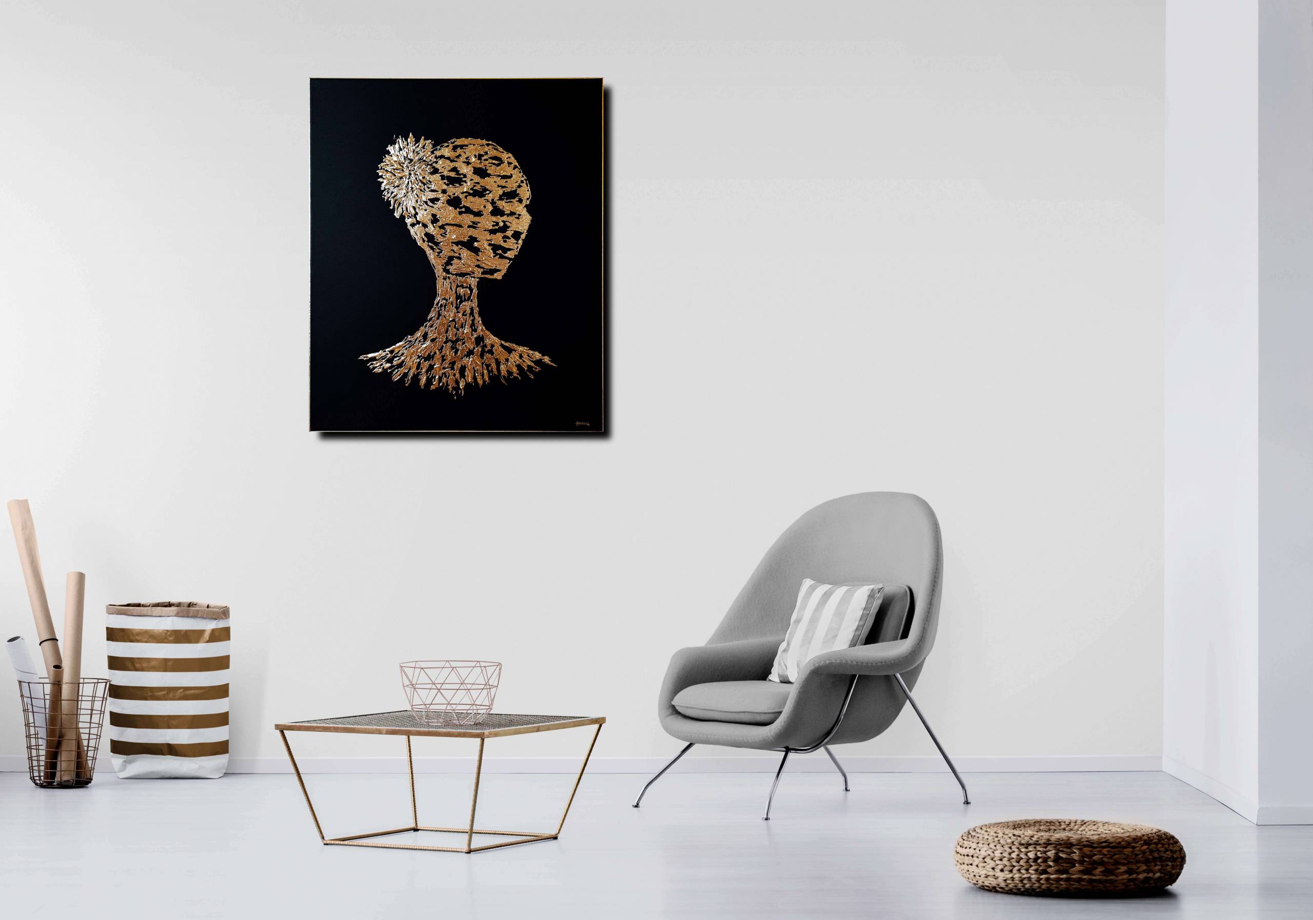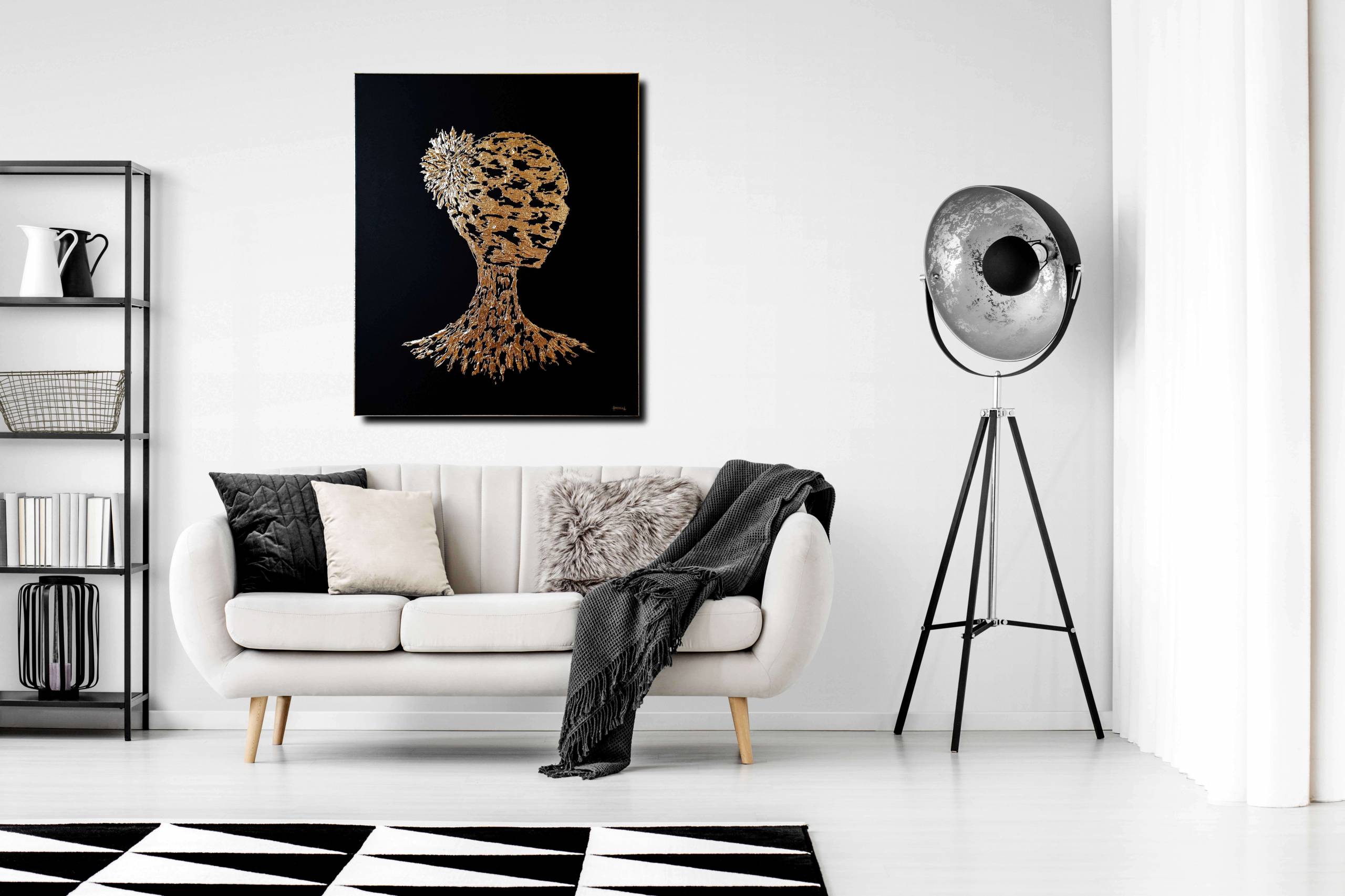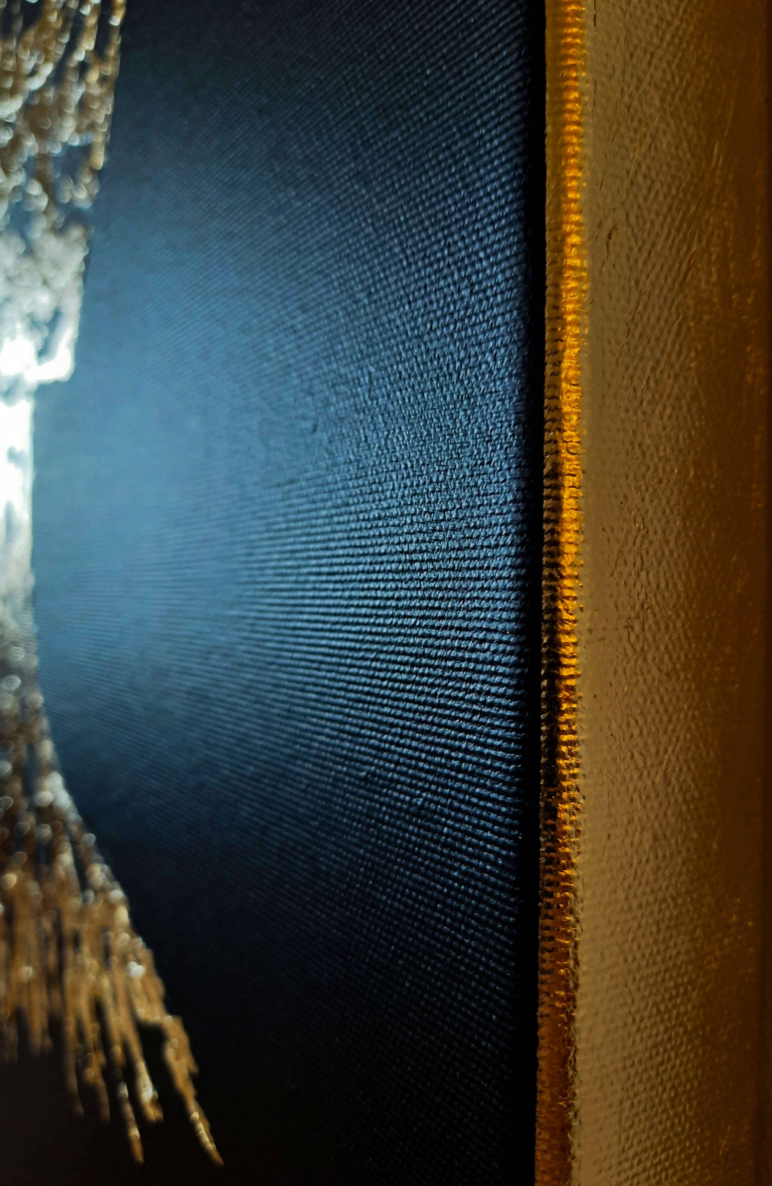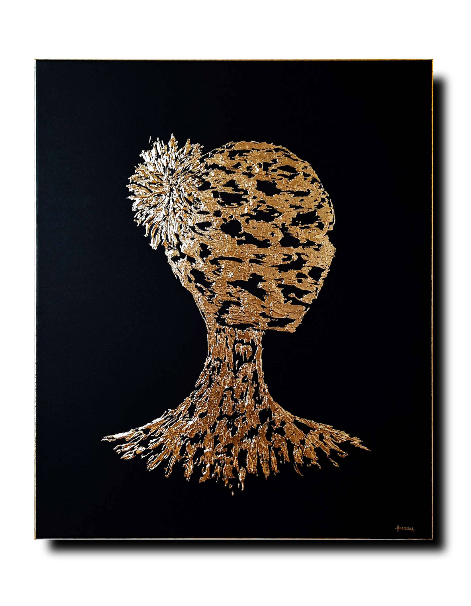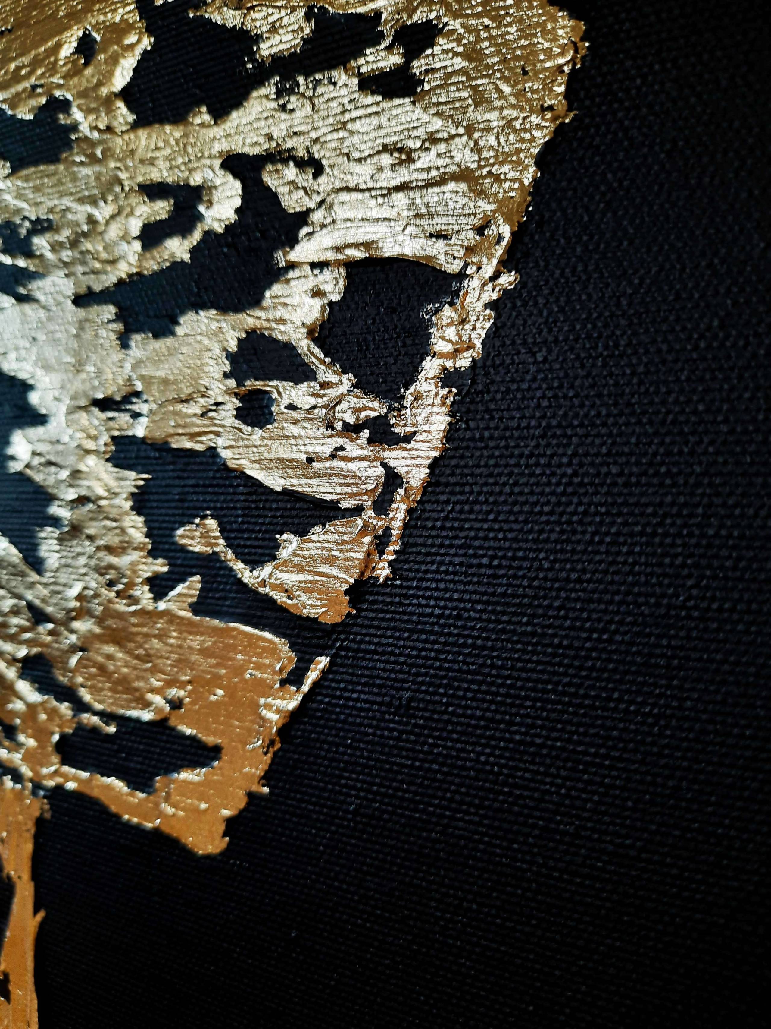 Elegantka Technika: akryl + szlagmetal na płótnie Wymiary: 60x50x3 cm Rok powstania: 2020 r. Sygn. p. d.: Harasim A. Boki złote. Nie wymaga oprawy. Gotowy do powieszenia. Prezentowany obraz to abstrakcja, wykonany techniką własną. Przedstawiony obraz ekspresją, formą i kolorem w zamierzony sposób dąży do głębokich odczuć odbiorcy. Sama struktura obrazu wpływa na odbiór emocjonalny. Obraz posiada złote boki pokryte szlagmetalem, a podobrazie jest wykonane na grubszym profilu co jeszcze bardziej potęguje efekt. Przedstawiony obraz akrylowy o charakterystycznym stylu jest odpowiedni do ozdoby współczesnych wnętrz mieszkalnych i użytkowych.
