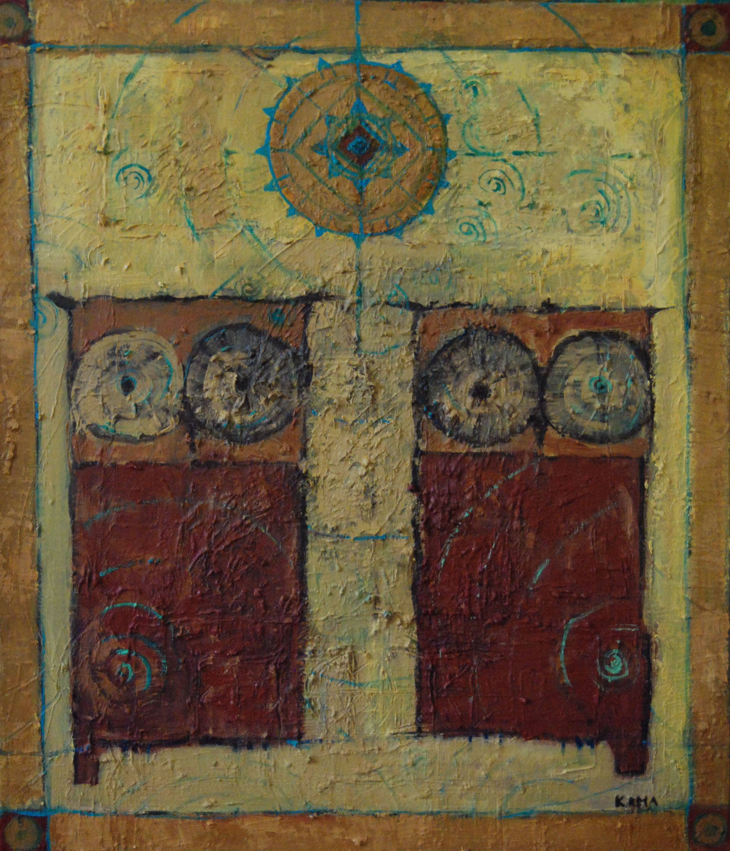 Obraz, który mamy przed sobą, to eksplozja form i kolorów. Dominują odcienie ochry i brązu, które przeplatają się z intensywnymi akcentami turkusu. Centralnie umiejscowione kształty przypominają abstrakcyjne oczy, które zerkają wprost na widza. Całość wydaje się być w ruchu, jakby wirujące spirale zasysały nas w głąb tajemniczego świata. Na pierwszy rzut oka, może wydawać się chaotyczny, ale przy dłuższym wpatrywaniu odkrywamy przemyślaną harmonię. Styl artystyczny jest nieco rustykalny, z widocznymi fakturami farby i odrobiną niedokładności. Jakby artysta użył pędzla do malowania nieba, a nie pincety. Dziecięca wręcz radość, jaką emanuje obraz, niesie ze sobą uczucie niekonwencjonalnej beztroski. Czuję, że mógłbym tu spędzić godziny, odkrywając nowe detale z każdym spojrzeniem. Może to tylko moje wrażenie, ale czuję echo tajemniczych opowieści snujących się gdzieś w zakamarkach tych abstrakcji. Truly a masterpiece of storytelling in visual form.
