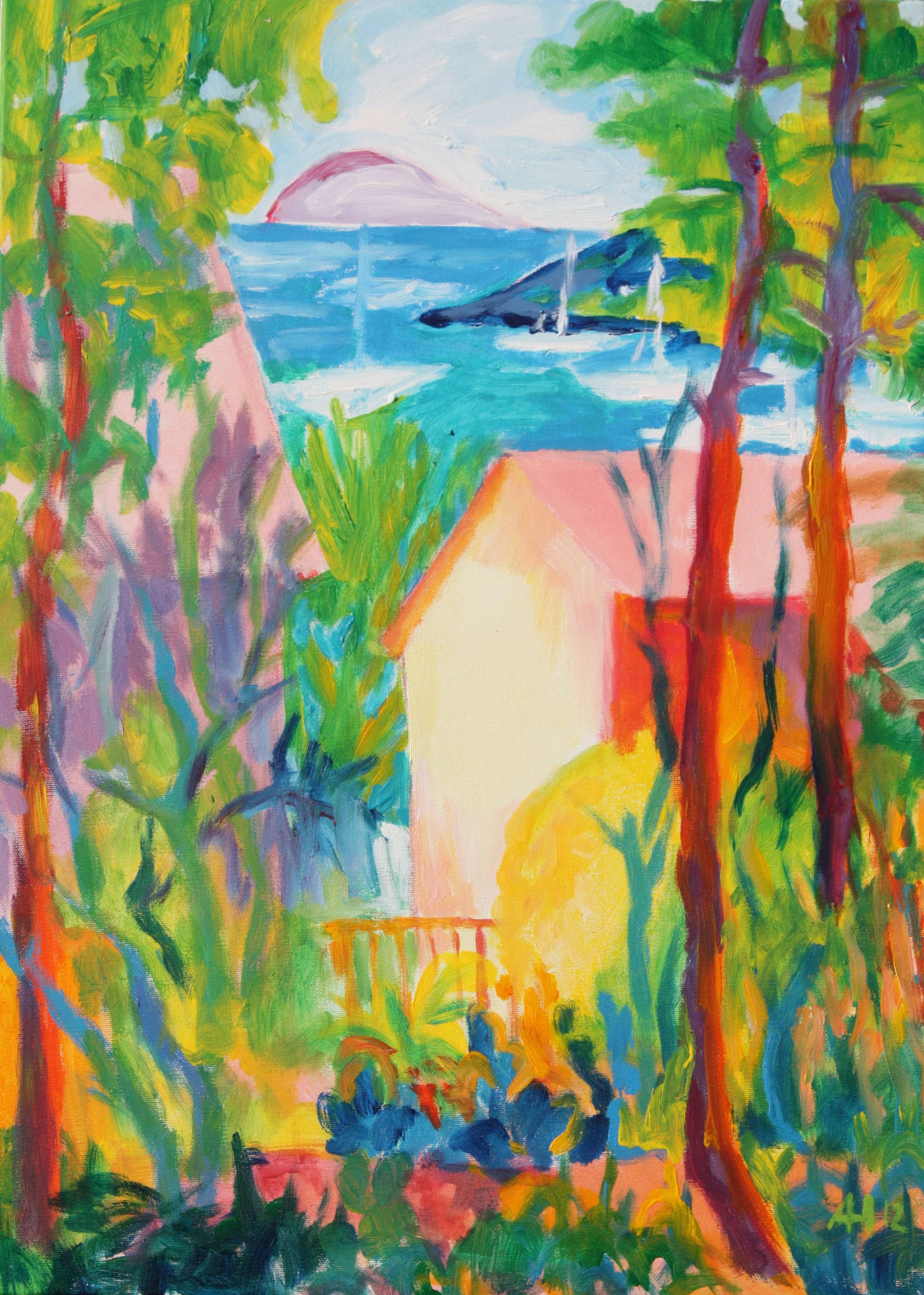 Obraz należy do cyklu namalowanego w roku 2012 podczas pleneru na malowniczej wyspie na Adriatyku. Przedstawia widok na morze i marinę z wyspy. Obraz bardzo jasny, radosny. Obraz sygnowany przez autorkę.