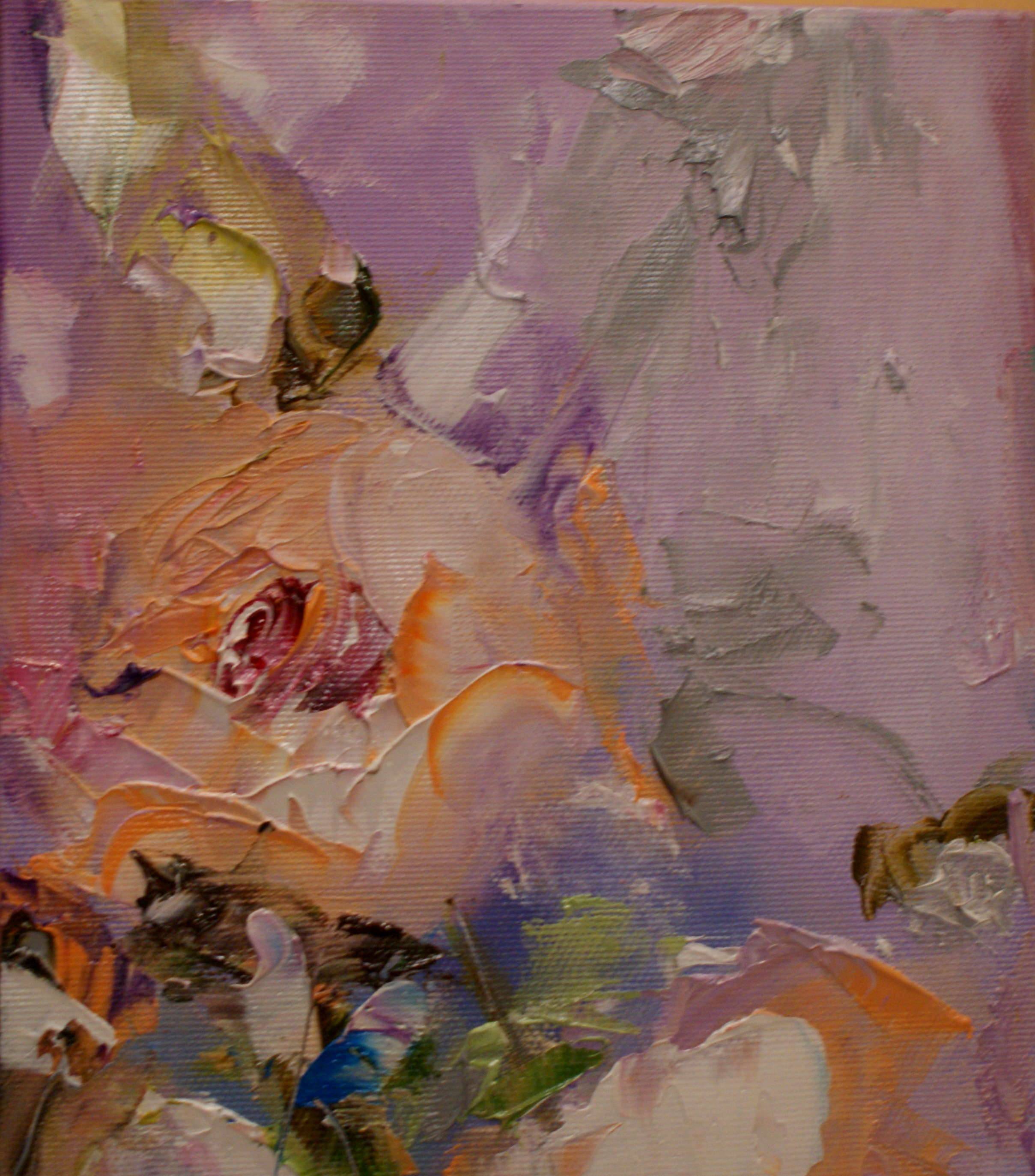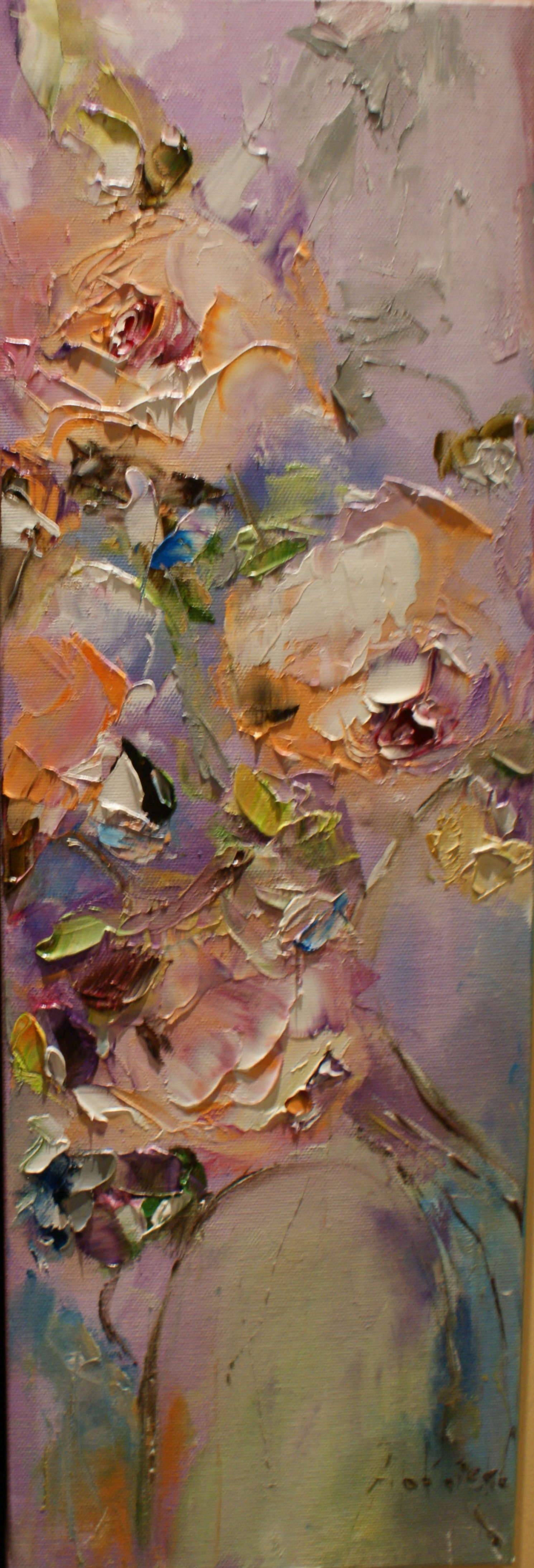 Obraz emanuje delikatnością i subtelnością, choć użyte kolory są intensywne. Przewaga pastelowych tonów—fiolety, róże, uzupełnione miejscami zielenią—nadaje mu eteryczny wygląd. Kwiaty przypominające róże zostały uchwycone w różnych fazach rozkwitu za pomocą grubo nakładanej farby, co przydaje obrazowi tekstury, niemal że trójwymiarowości. Artysta wykorzystał impasto, które podkreśla dynamiczność i ruch. Wow, wygląda jakby kwiatki były prawdziwe! Kompozycja jest pionowa, co nadaje obrazowi elegancji i pewnej powagi, ale też lekkości dzięki rozprzestrzenieniu się elementów florystycznych. Nastrój dzieła to mieszanka nostalgii i radości. Czuć jakby woń kwiatów unosiła się w powietrzu, a każda warstwa farby opowiadała inną historię z ogrodu pełnego barw. Styl jest impresjonistyczny, a użyta technika malarska pozwala na uchwycenie chwil przemijającej piękności. Może to budzić u odbiorcy refleksje nad ulotnością chwili czy zachwytem nad naturą. Światło zdaje się grać w obrazie ważną rolę, tworząc ciepłą aurę. It's magical, jak te barwy potrafią opowiadać o ciszy poranka wśród kwiatów.
