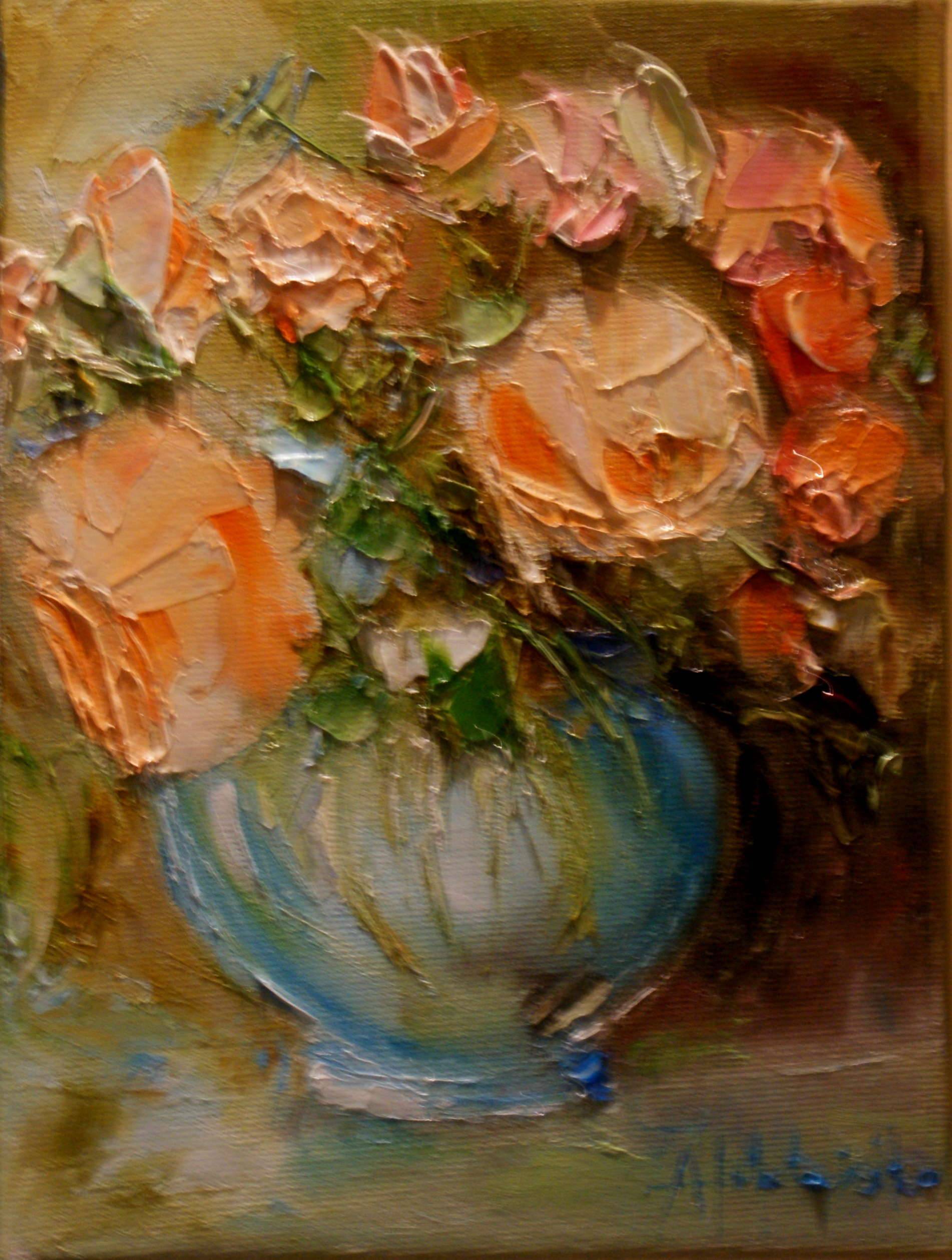 Obraz przedstawia bukiet róż w wazonie, a paleta kolorów pełna jest ciepłych odcieni pomarańczu, różu i zieleni. Kwiaty wyglądają jakby były zrobione pędzlem pełnym ekspresji, a grube nałożenie farby tworzy efekt przestrzenności i dynamiki. Artysta zastosował technikę impasto, nadając kształtom kwiatów niemalże trójwymiarowy wygląd. Tło jest stonowane, delikatnie złociste, co podkreśla ich żywe barwy. Wow, takie kolory są jak słońce! Kompozycja jest zrównoważona, a każdy element prowadzi wzrok do centrum obrazu, gdzie skupia się bukiet. Tworzy się atmosfera spokoju i nostalgii, przypominająca ciepłe letnie popołudnie. Styl pracy jest sugestywnie impresjonistyczny, chociaż z nutką indywidualizmu artysty. Można poczuć almost tangible texture płatków, które zdają się wręcz pachnieć. Obraz jest jakby odrobinę niedbały, ale to właśnie nadaje mu uroku i autentyczności. Można się zanurzyć w jego klimacie i przez chwilę poczuć bliskość natury. To taki moment, kiedy zatrzymujesz się w biegu dnia codziennego i po prostu cieszysz się chwilą. Fascynujące, jak jeden mały obrazek potrafi wywołać takie emocje i refleksje.