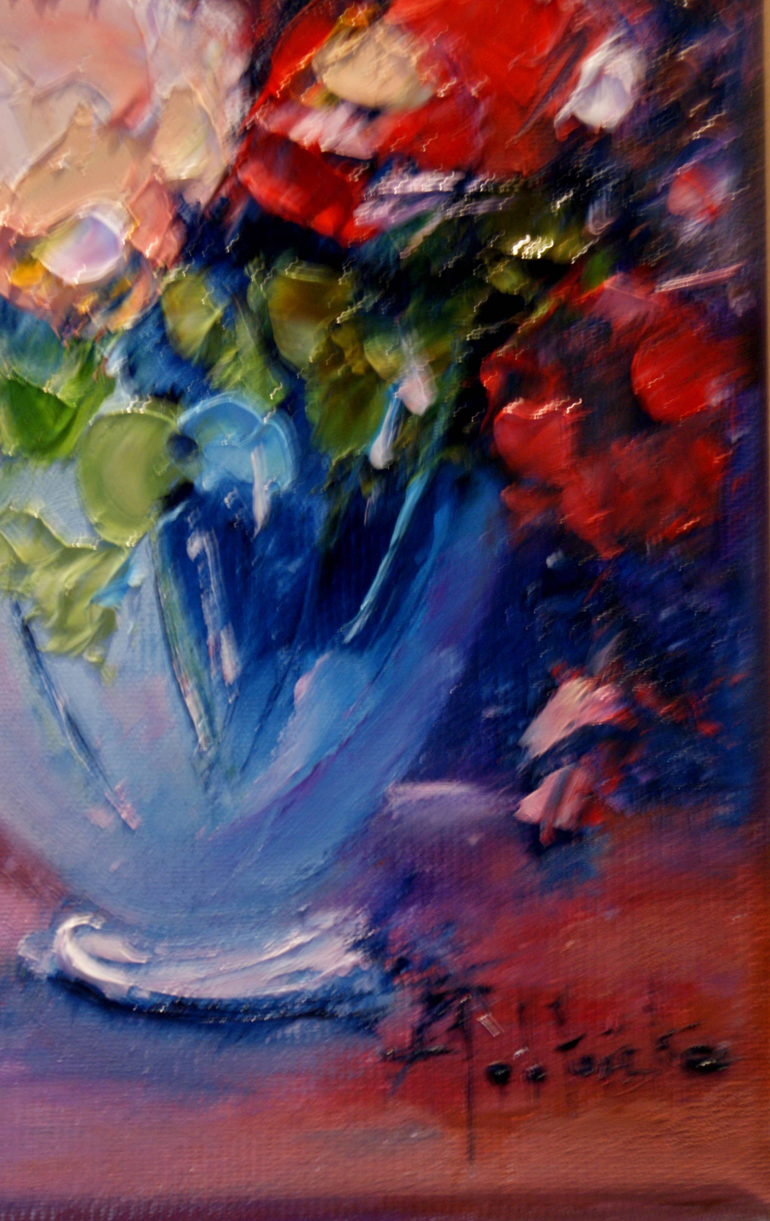 Ten obraz to prawdziwie magiczna mieszanka kolorów i form, która przyciąga wzrok od pierwszego spojrzenia. Na płótnie dominuje intensywny fiolet, tworząc tajemnicze tło, z którego wyłaniają się piękne kwiaty. Ich płatki, w odcieniach czerwieni, różu, bieli i zieleni, zdają się niemalże żyć własnym życiem. Ach, te kolory! I jeszcze ten wazon – wykonany z błękitnego szkła, delikatnie zaokrąglony, stanowi doskonały kontrapunkt dla kolorowych kwiatów. Artysta użył technik malarstwa impastowego, co daje obrazowi niesamowitą teksturę. Faktura farby nakładanej grubą warstwą, wręcz wyciska się z płótna, tworząc efekt trójwymiarowości. Jest jak obłok lekkości, który budzi skojarzenia z pięknem natury. Wszystko wydaję się być w ruchu, niemal jak tęcza w pełni rozkwitu. Obraz emanuje nastrojem spokoju i radości. Każdy kwiat, to jak kropelka szczęścia. To coś jak happy place. Można niemal poczuć delikatny zapach tych kwiatów. A może właśnie o to chodziło artyście? By przypomnieć nam o prostych chwilach radości? Dla małego dziecka to po prostu "piękne kwiatki". Emocje unoszą się w powietrzu, wywołując uśmiech na twarzy. Nawet jeśli nie jesteś fanem kwiatów, ten obraz to prawdziwy feast for the eyes.