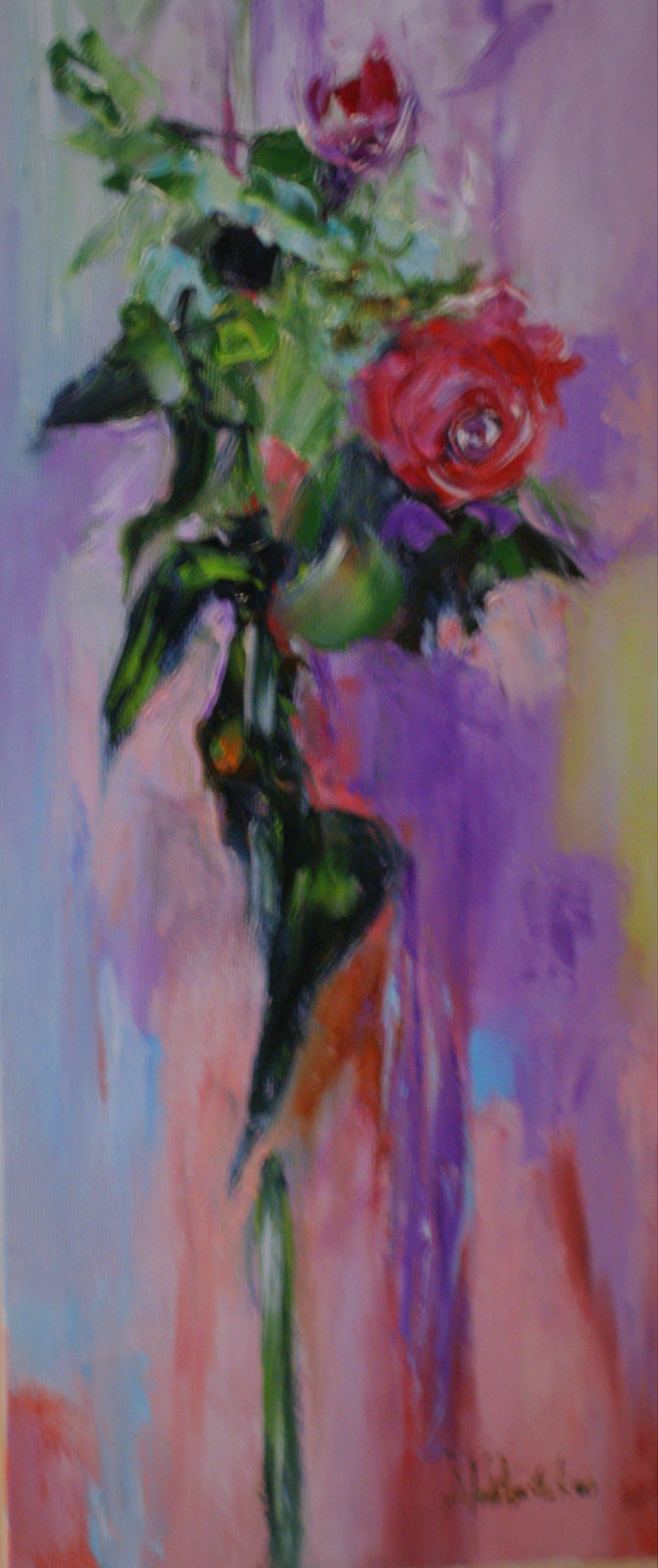 Na obrazie można dostrzec oryginalną kompozycję florystyczną. Dominuje różnorodność kolorów: czerwień, zieleń i fiolety tworzą harmonijną mieszankę, a ich soczyste, kontrastujące barwy przyciągają uwagę. Kwiaty zdają się niemal wychodzić z płótna, jakby były żywe, a ich artystycznie rozmyte kontury dodają im tajemniczej aury. Całość przypomina nieco impresjonizm, gdzie kluczowe znaczenie ma gra światła i cienia. Patrząc na ten obraz czuję nostalgia, a może nawet odrobina smutku. Te kwiaty wydają się mówić - „chwytaj chwilę, bo szybko przeminie”, co skłania do refleksji nad ulotnością piękna. Faktura farby zdradza dynamiczne pociągnięcia pędzla, które nadają ruch i energię. To jest jakby "magic touch" artysty, coś co pozostaje w pamięci. Hej, mamo, ta róża jest jak cukierek! Dzieło to może budzić wiele emocji - od zachwytu przez melancholię po radość. Obraz emanuje romantyczną atmosferą. Artysta zdaje się bawić formą i kolorem, tworząc kompozycję, która jest równocześnie chaotyczna i uporządkowana. Czasem czuję, jakbym patrzył na senne marzenie. Ten obraz to prawdziwa feast dla oczu!