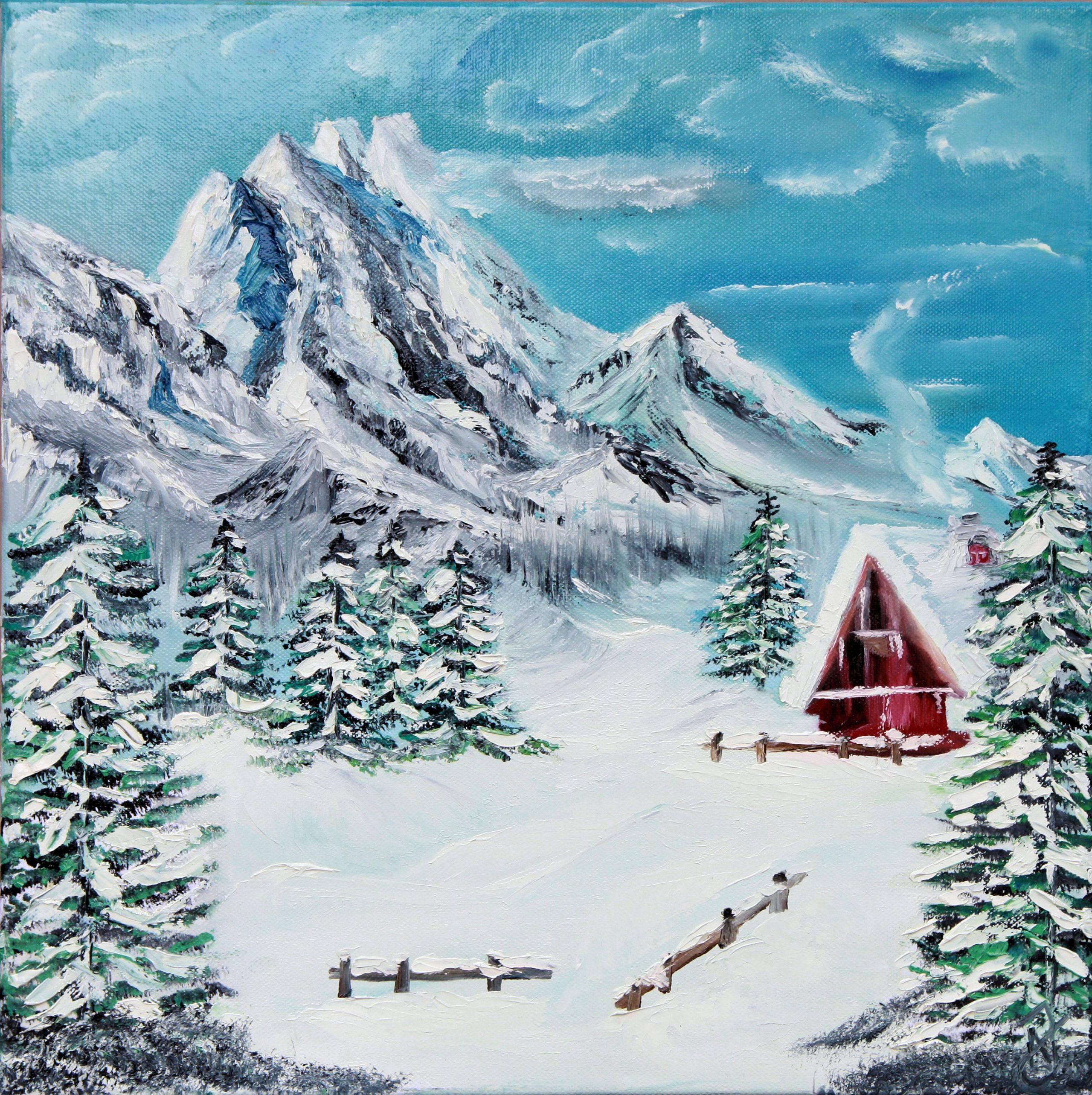 Na obrazie widzimy zimowy pejzaż ośnieżonych górskich szczytów, które dominują nad całą kompozycją. Ich chłodne odcienie bieli i błękitu kontrastują z żywymi zieleniami drzewek pokrytych śniegiem. W centrum jest malutka czerwona chatka, która wygląda jak z bajki. Jest przytulnie otulona bielą śniegu, a jej czerwony kolor przyciąga wzrok niczym magnes. Artysta użył dynamicznych pociągnięć pędzla, co nadało obrazowi energii i życia. Patrząc na obraz, czuję spokój i ciszę, taką typową dla zimowego poranku. Można prawie poczuć mroźne powietrze na twarzy. Zastosowany styl to impresjonizm, co daje wrażenie ulotności chwili. Kolory są vibrant i tętniące życiem, mimo chłodnej palety. Może obraz wzbudzać tęsknotę za prostotą i bliskością natury. Jeden z widzów mógłby pomyśleć "Wow, chcę tam być", ciesząc się chwilą wytchnienia od miejskiego zgiełku. Trochę jakbym znowu był dzieckiem, robiąc anioły na śniegu. Chociaż chatka wygląda jak z marzeń, przypomina o ciepłych wspomnieniach, gdzie czas płynie wolniej. To miejsce, które wzywa do przygód i chwil refleksji.
